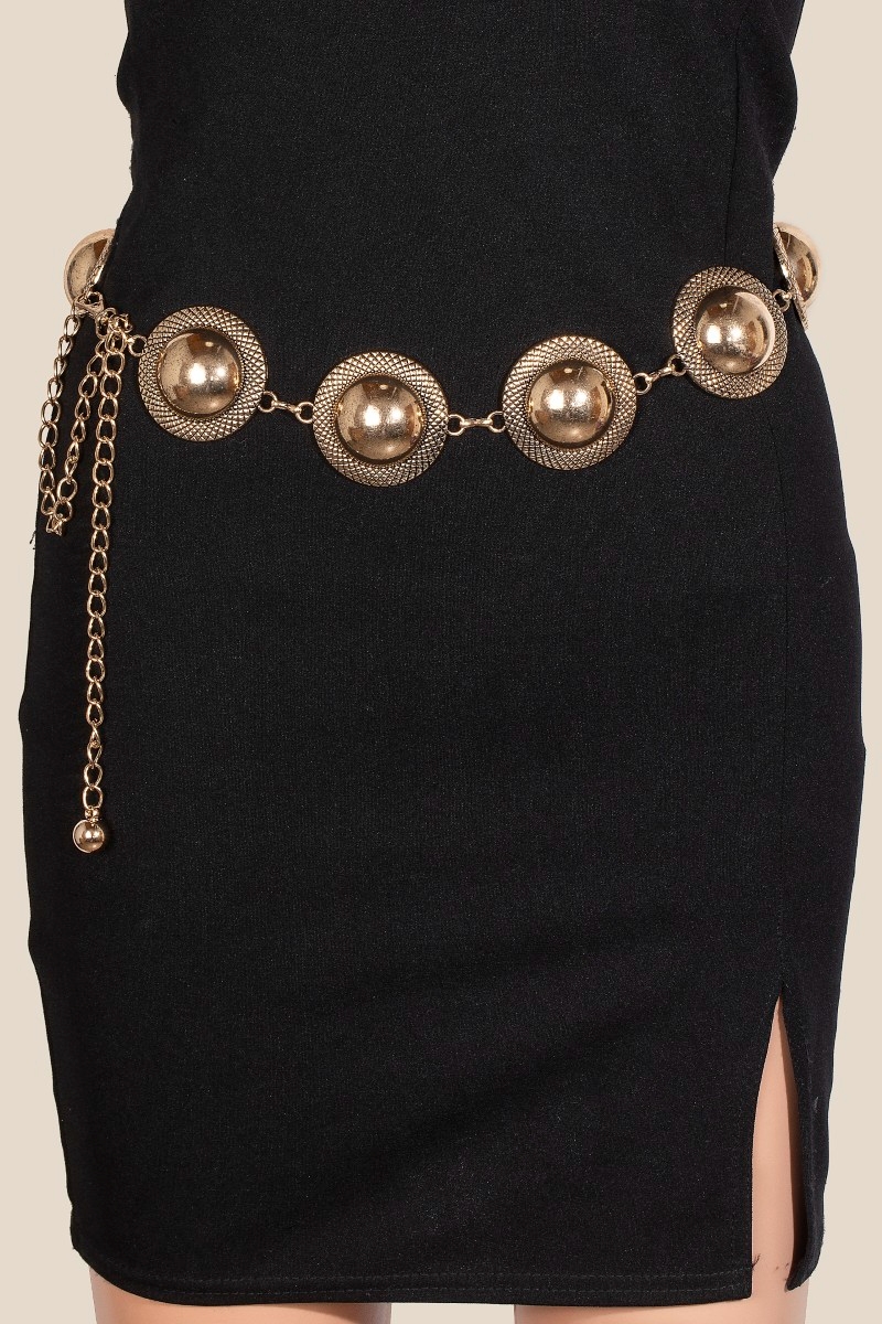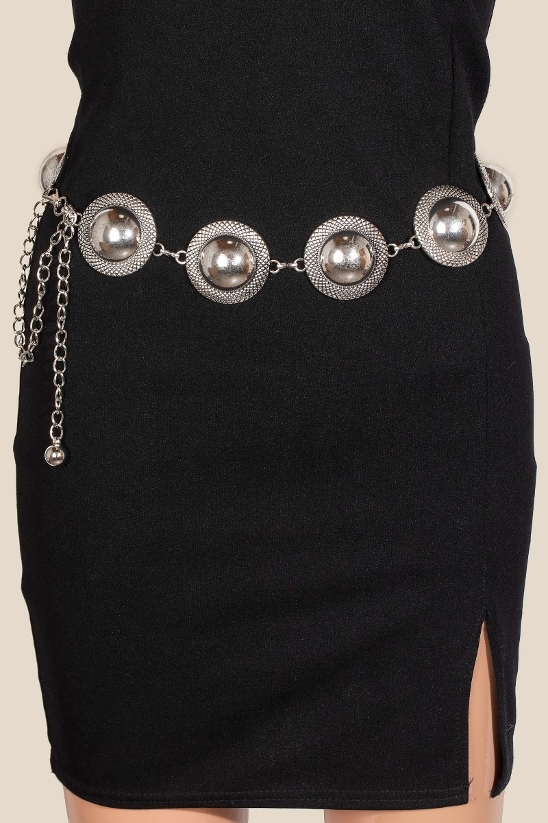 • A versatile piece that can be dressed up or down, this chain belt possesses a fine metallic dome disc design. This item is perfect for adding some color and vibrancy to any outfit. Available in G, S. This item is sold in packs of 1.