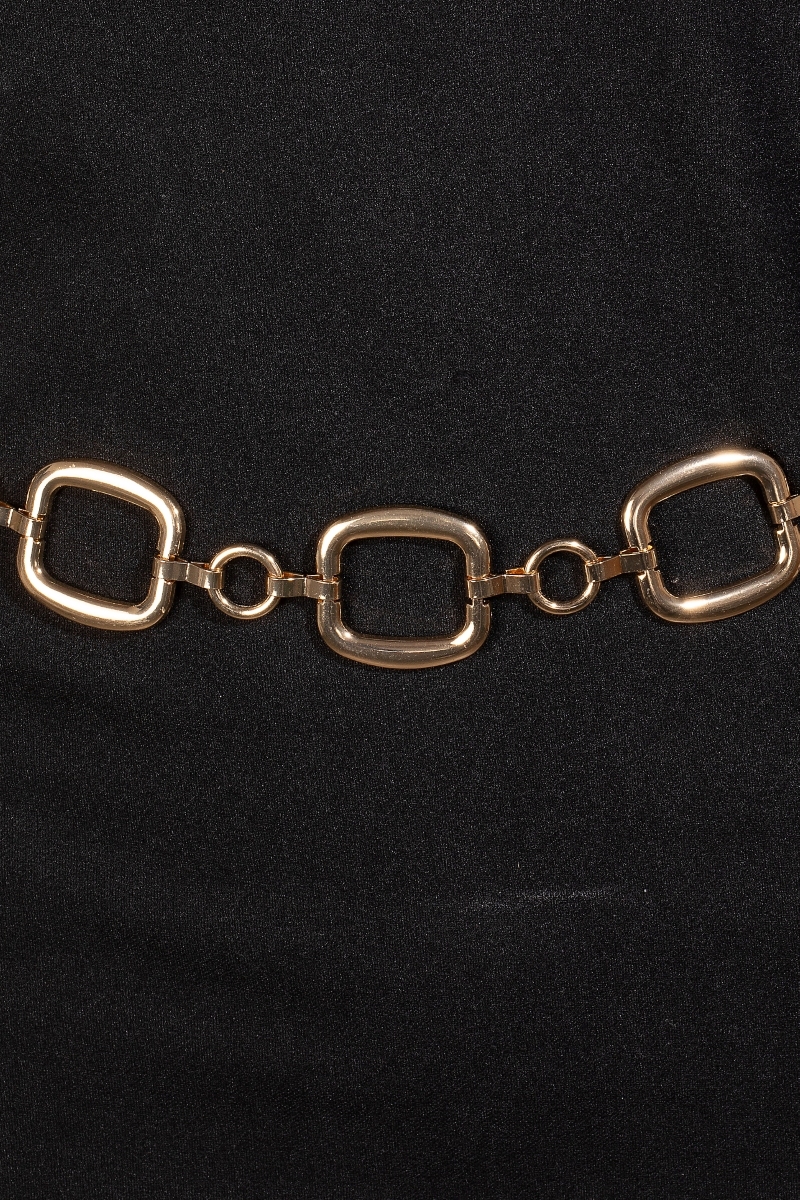 This piece is both elegant and versatile, this chain belt displays a unique metallic square and hoop design. Add some personality to your outfit with this stylish chain belt. Available in G and S. This item is sold in packs of 1.