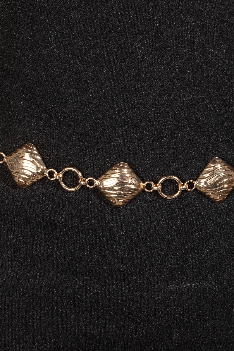 • This piece is designed to make a statement, this chain belt boasts a magnificent metallic textured square design. This chain belt is ideal for both casual and formal events, adding a touch of sophistication to any outfit. Available in S and G. This item is sold in packs of 1.
