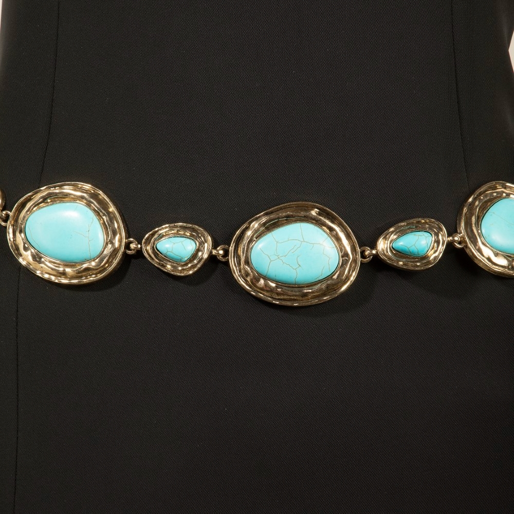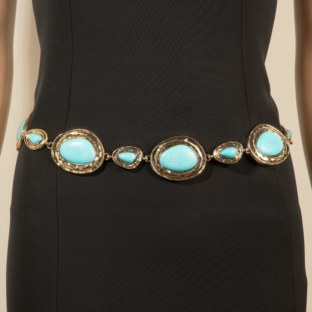 A stunning addition to any jewelry collection, this chain belt possesses a fine ornate western concho turquoise stone design. Achieve a perfect balance of style and sophistication with this versatile chain belt, the ultimate choice for the fashion-savvy individual. Available in G, S. This item is sold in packs of 1.