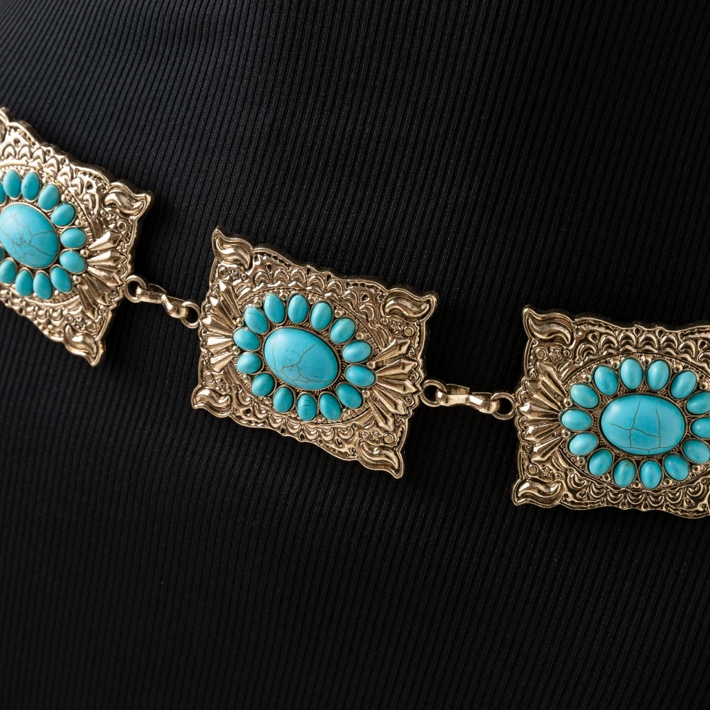 Add some edge to your wardrobe, this chain belt highlights a special ornate western turquoise cluster square concho design. Discover a new level of fashion versatility as this chain belt effortlessly elevates the allure of your attire. Available in G, S. This item is sold in packs of 1.