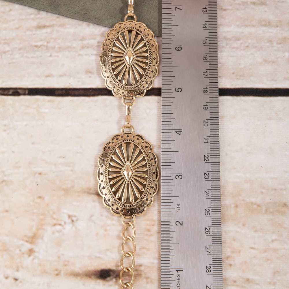 The perfect way to complete any outfit, this belt exudes a refined oval concho disc chain link design. A must-have belt that adds a unique flair to any look. Available in G,S. This item is sold in packs of 1.
