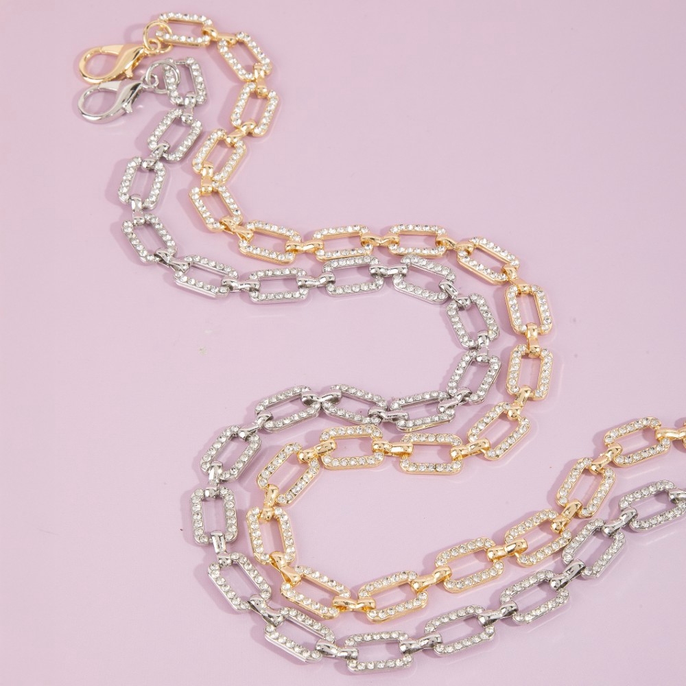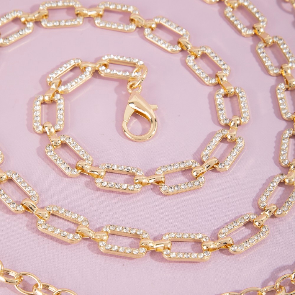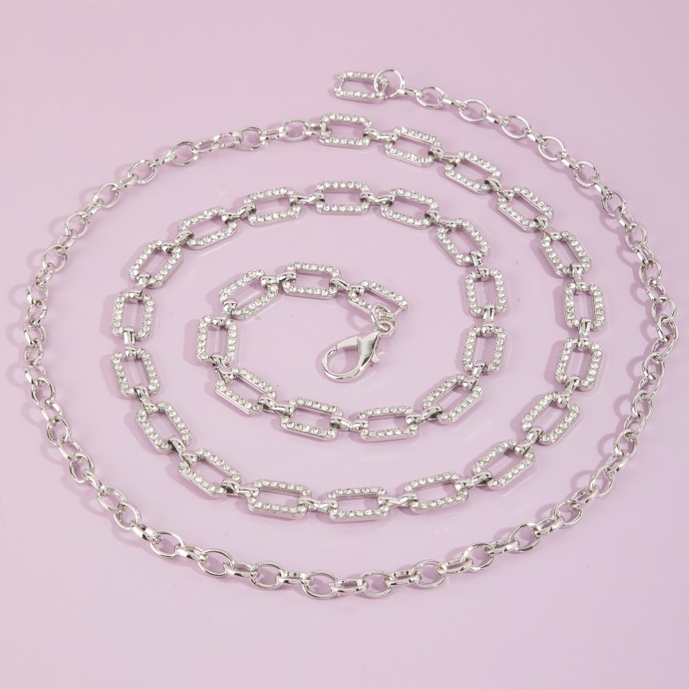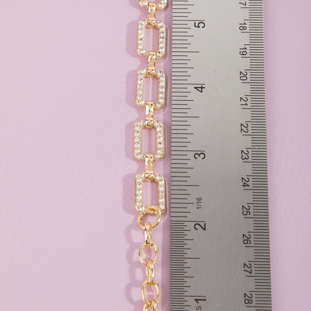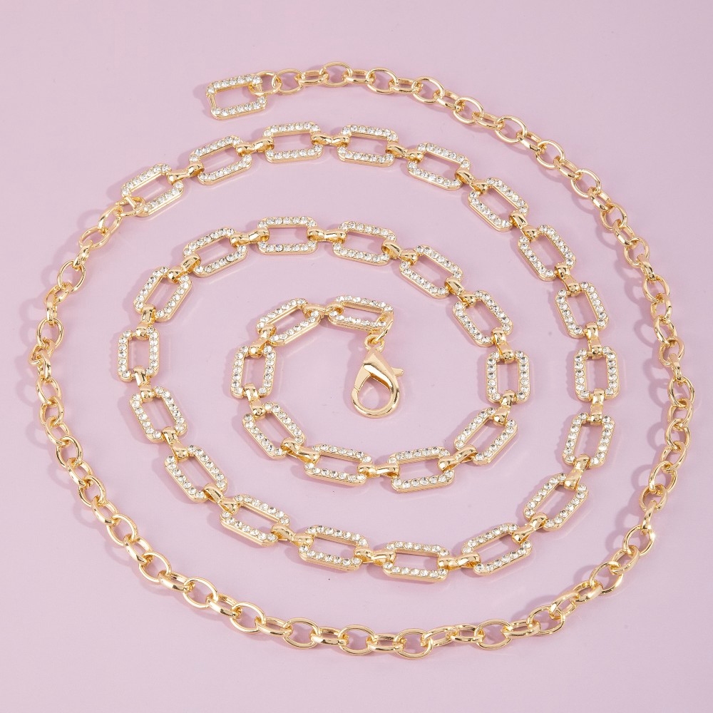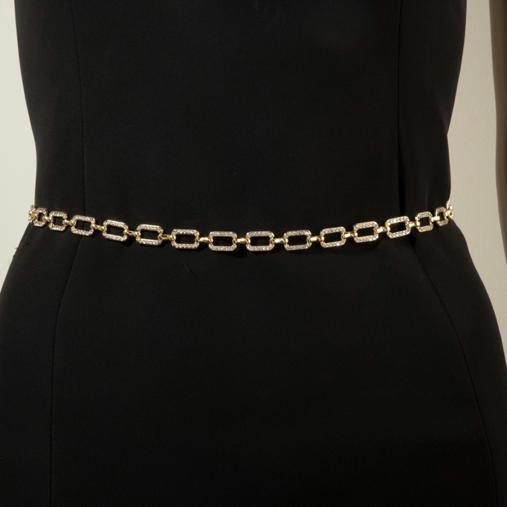 Add a touch of elegance and glamour to your look, this chain belt evokes a captivating pave crystal paperclip design. Make a lasting impression with this versatile chain belt, a subtle yet impactful addition to your fashion repertoire. Available in G, RO. This item is sold in packs of 1.