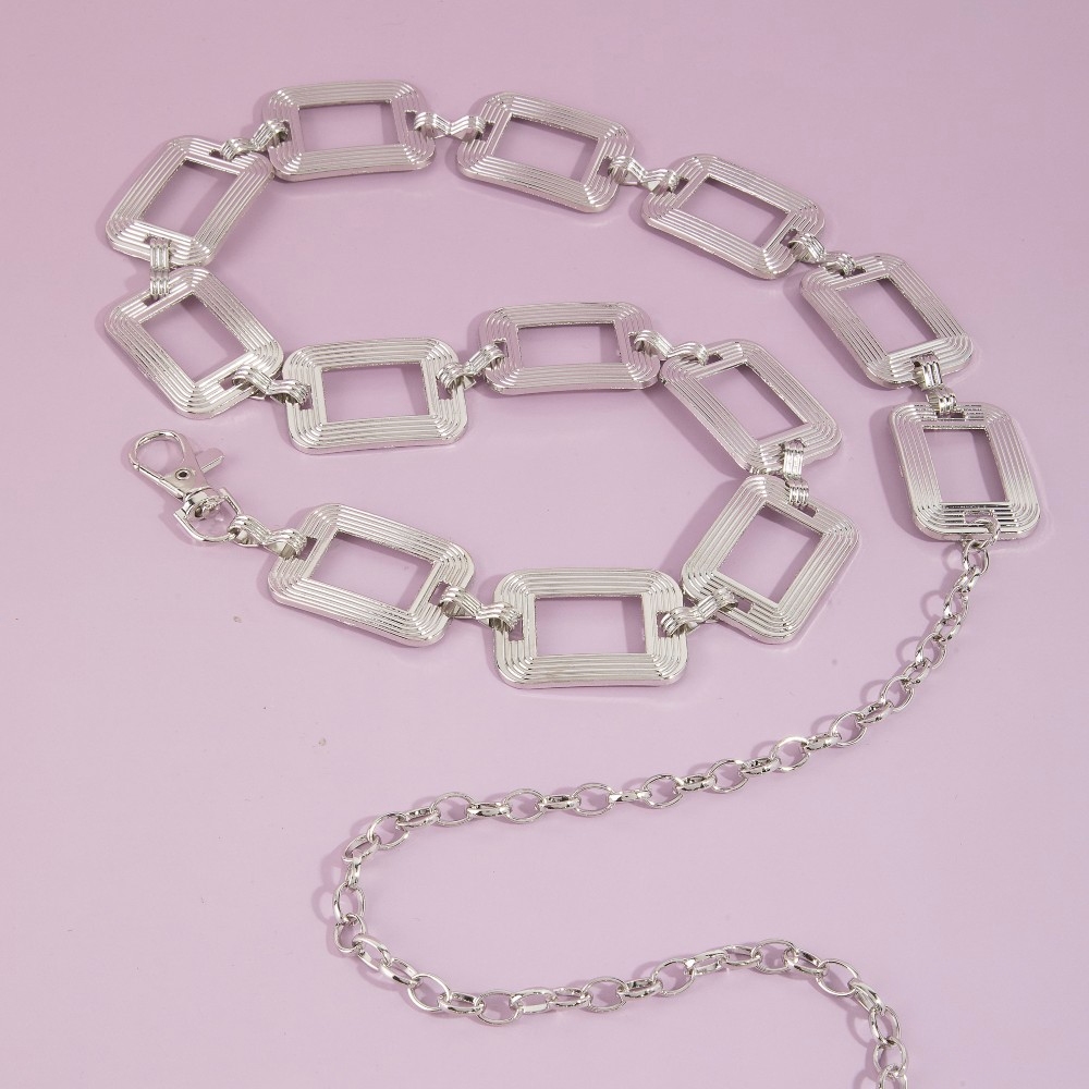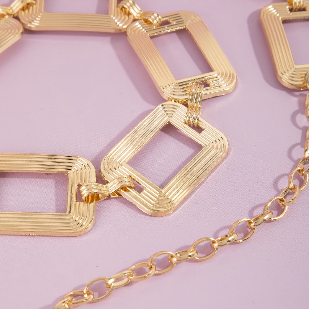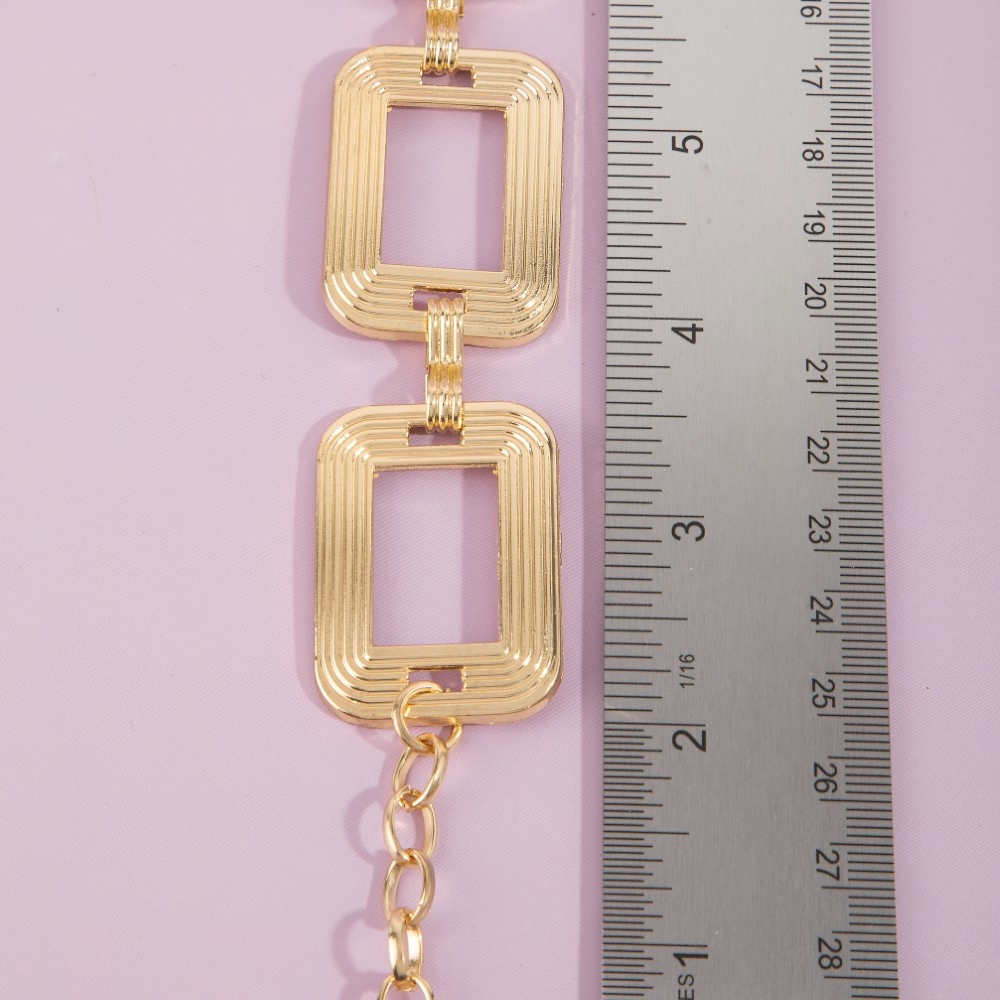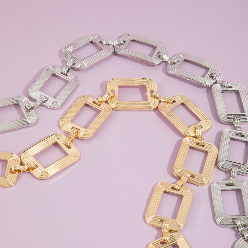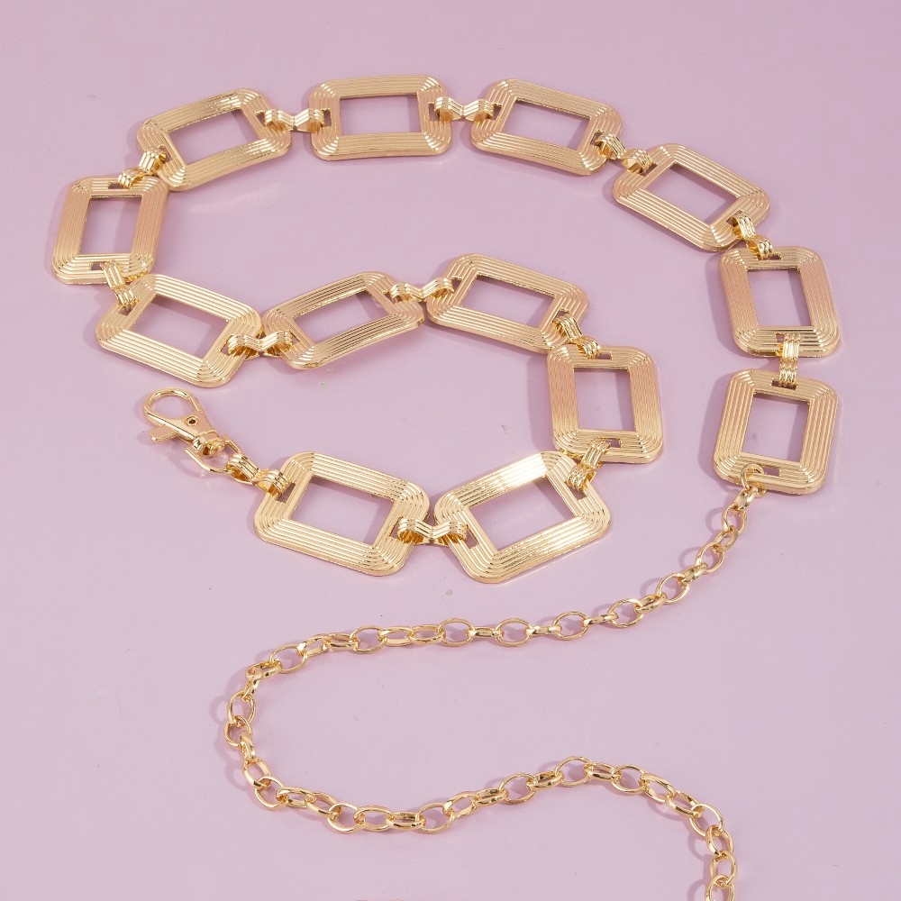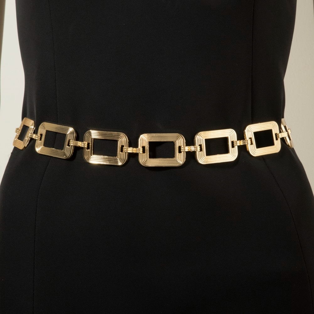 - A classic design with a contemporary twist, this chain belt presents a striking ribbed rectangle open link design. Perfect for adding a pop of color or texture to any outfit, this chain belt is a must-have. Available in G, RO. This item is sold in packs of 1.