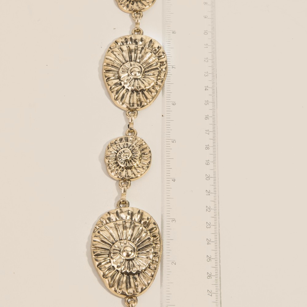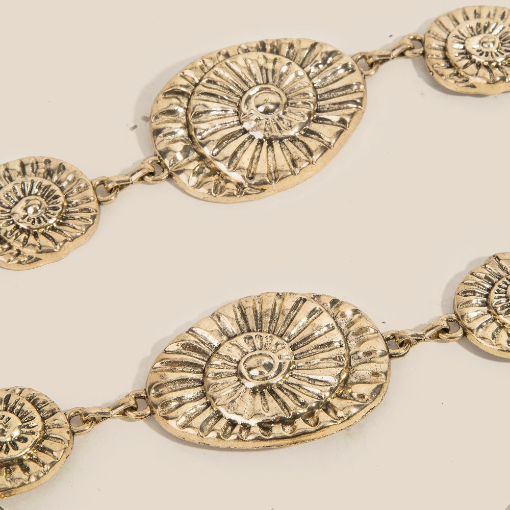 - Add a touch of luxury to any outfit, this chain belt features a distinct seashell disc design. Elevate your fashion ensemble effortlessly with this versatile chain belt, a stylish choice for the modern trendsetter. Available in G, S. This item is sold in packs of 1.