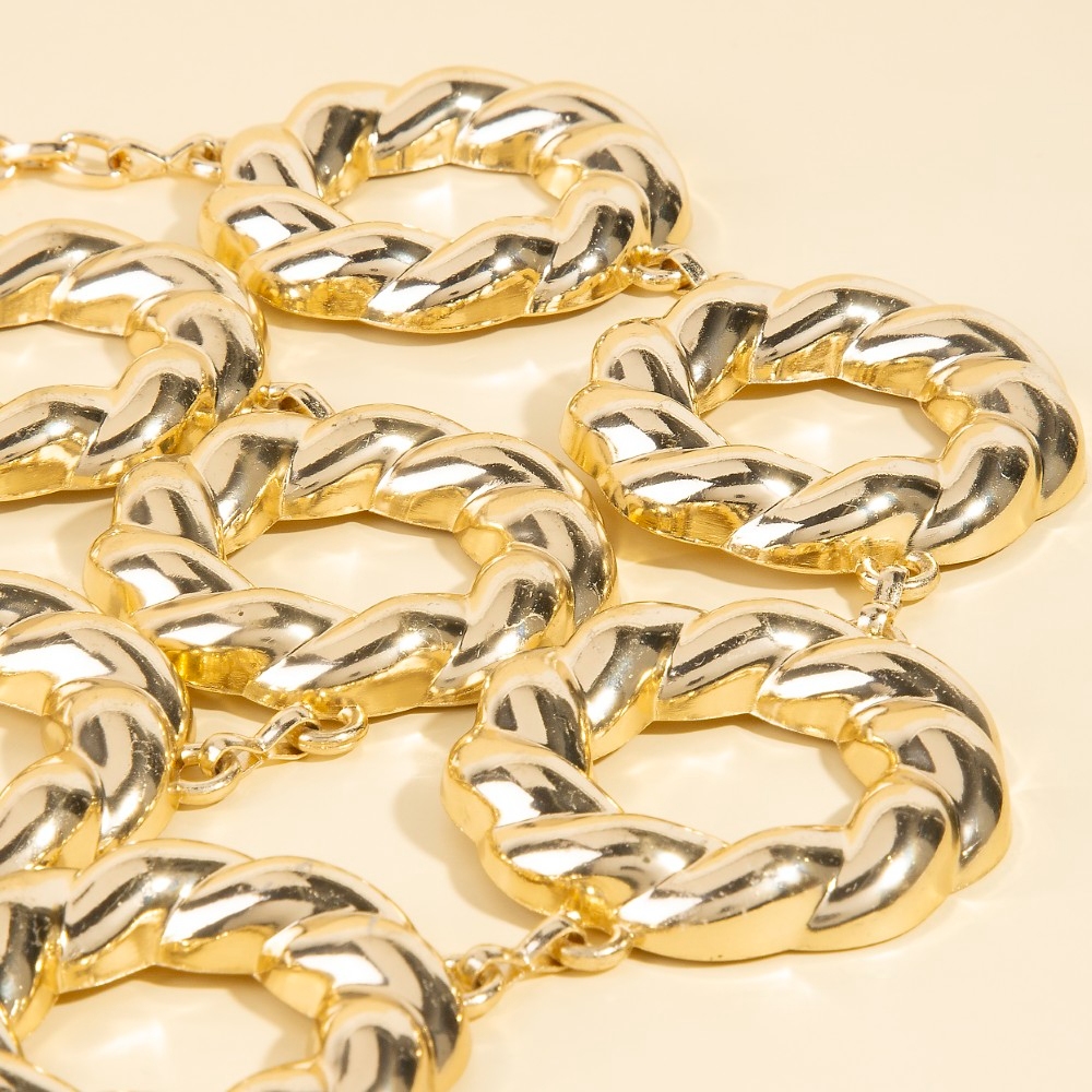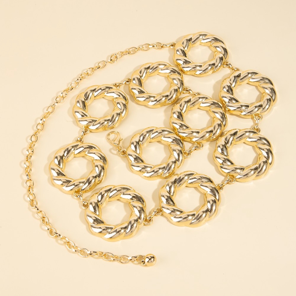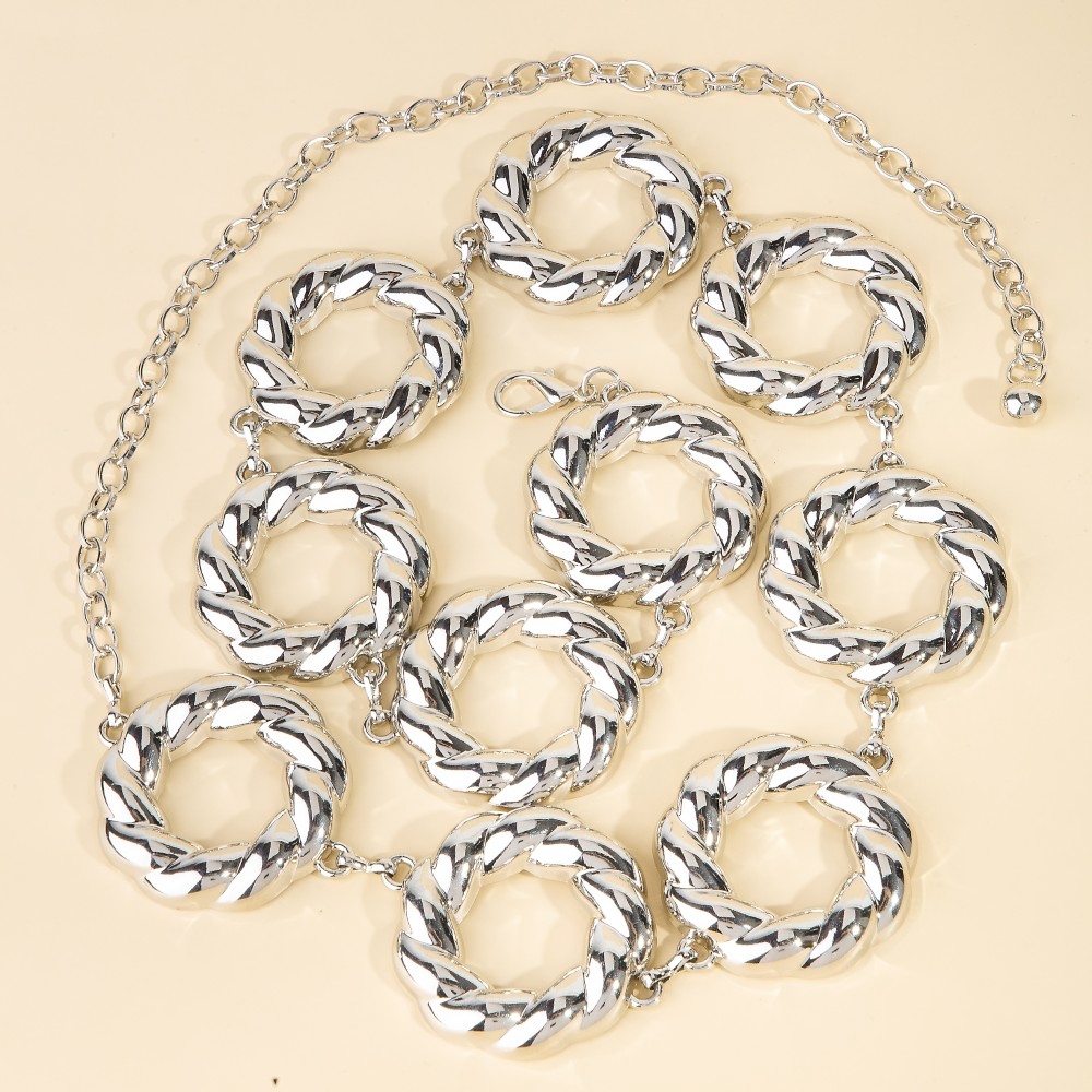 Unleash your inner fashionista, this chain belt evokes a captivating thick metallic twisted hoop design. A must-have chain belt that effortlessly enhances your style, no matter the occasion. Available in G, S. This item is sold in packs of 1.