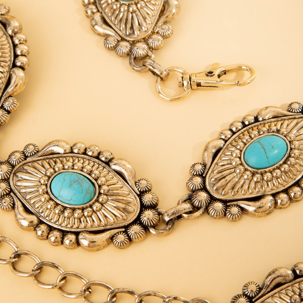 This season's hottest chain belt, this chain belt radiates a sleek turquoise concho disc design. Make a lasting impression with this versatile chain belt, a subtle yet impactful addition to your fashion repertoire. Available in G, S. This item is sold in packs of 1.