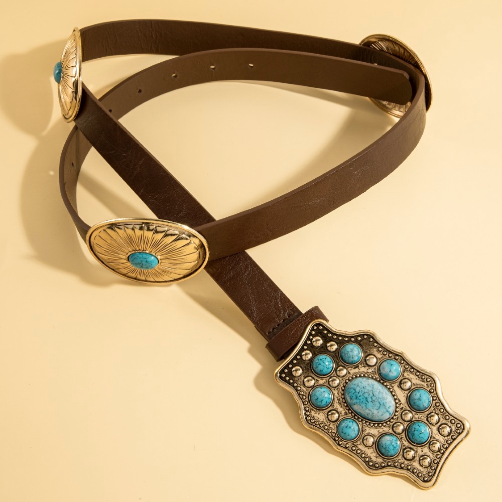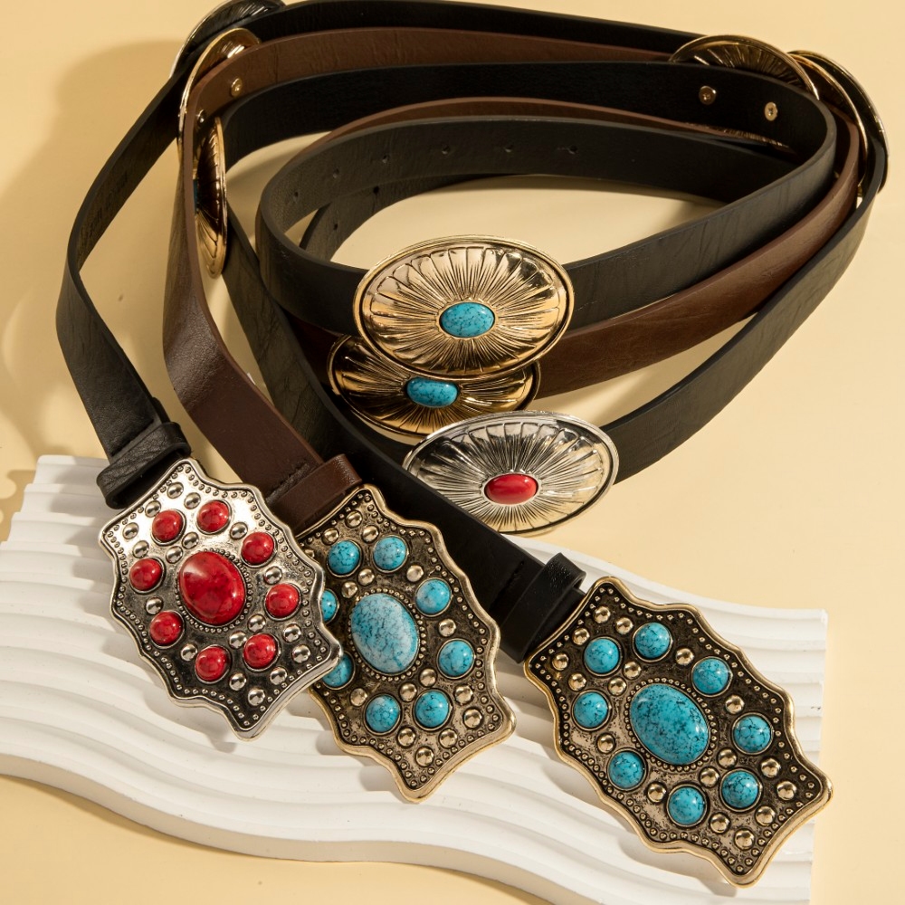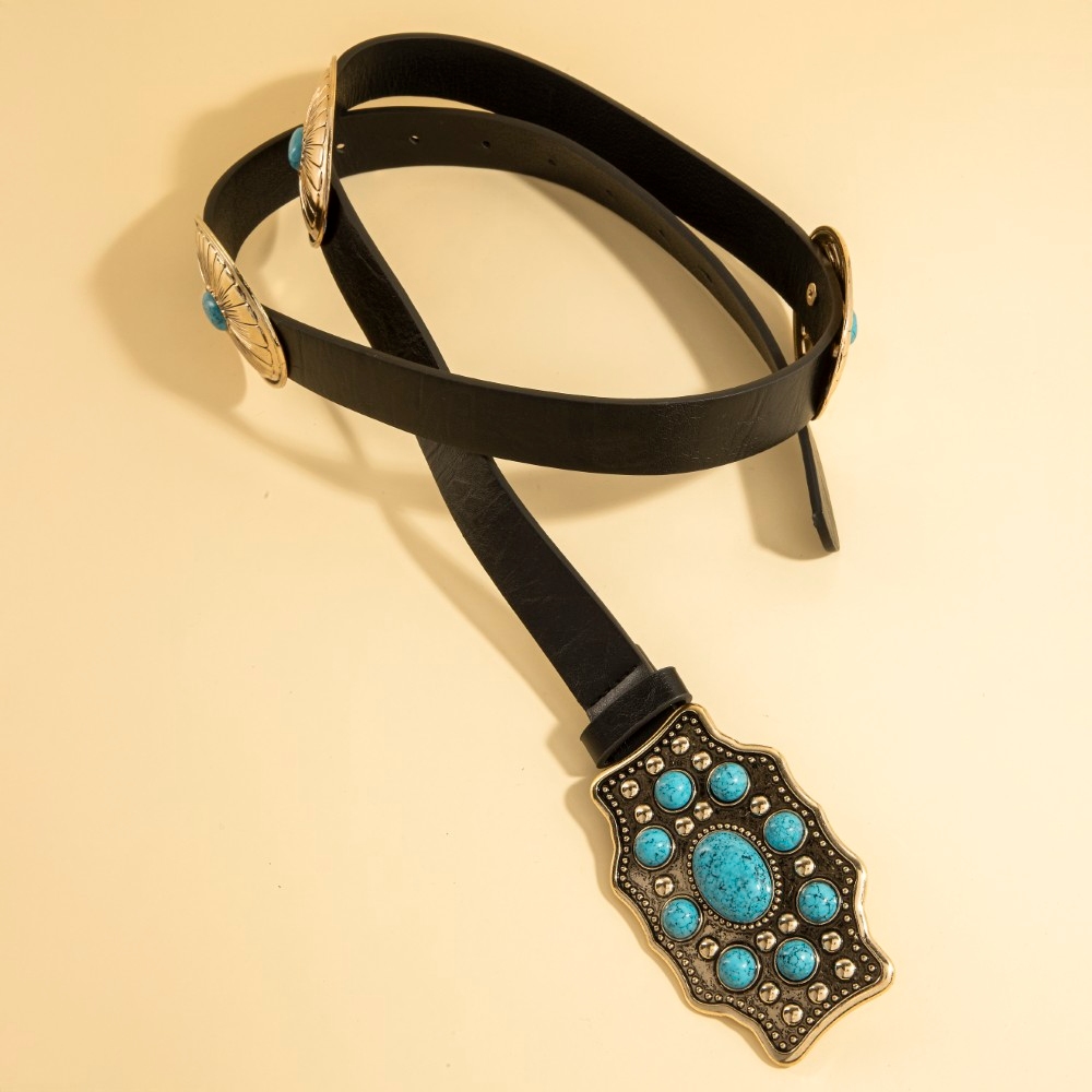 • Stay ahead of the fashion curve, this faux leather belt possesses a fine assorted western concho turquoise stone design. Elevate your personal style effortlessly with this versatile faux leather belt, an essential component for a refined wardrobe. This item is sold in packs of 1.