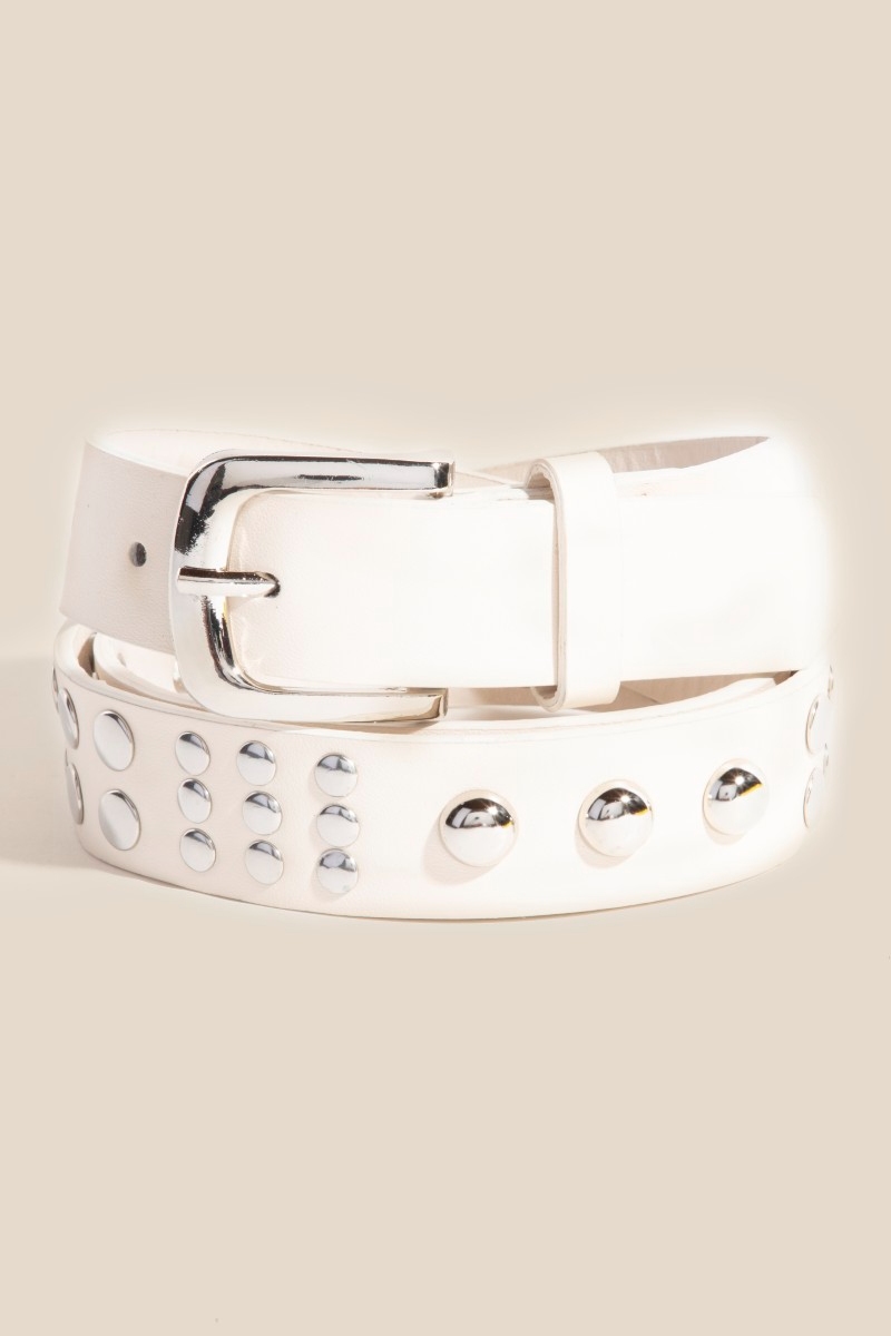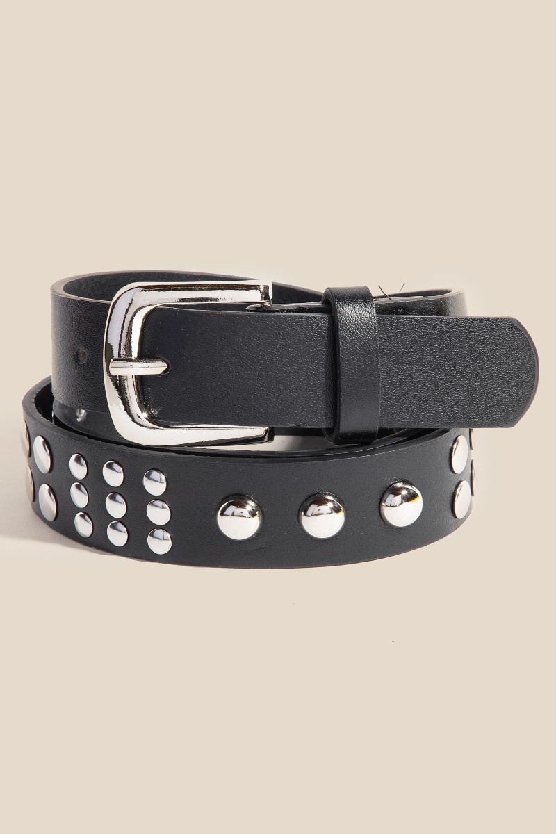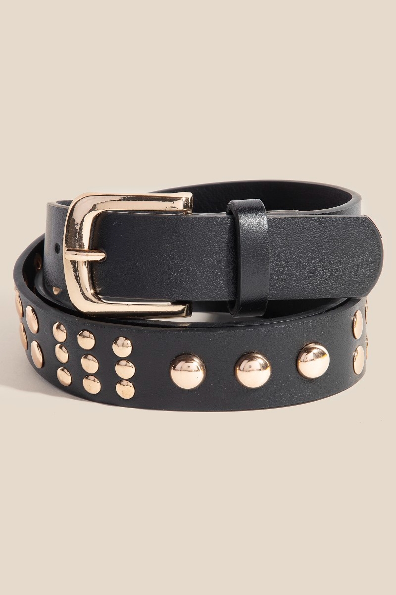 • Add some edge to your wardrobe, this faux leather belt carries a charming metallic dome studded design. This item is a great way to add some texture and dimension to any outfit. Available in GBK, GBR, SBK, SIV. This item is sold in packs of 1.