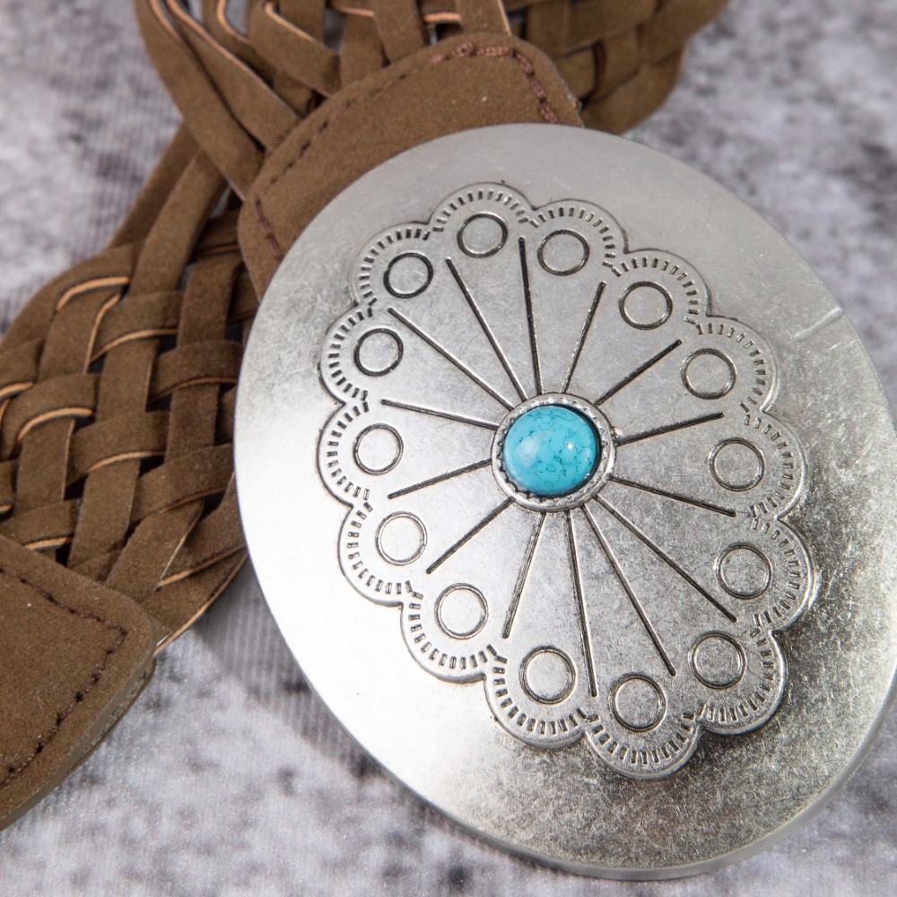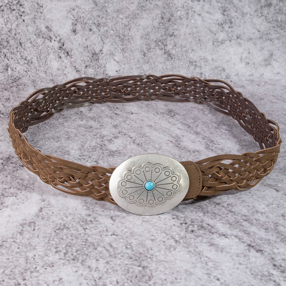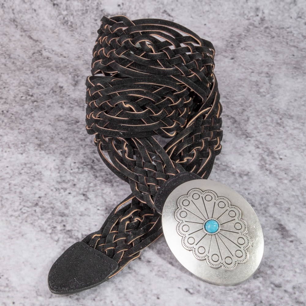 - Effortlessly elevate your style, this leather belt introduces an exceptional western braided concho buckle vegan design. Experience the transformative power of this versatile leather belt, effortlessly enhancing the overall aesthetic of your outfit. Available in SBK, SDBR and SLBR. This item is sold in packs of 1.