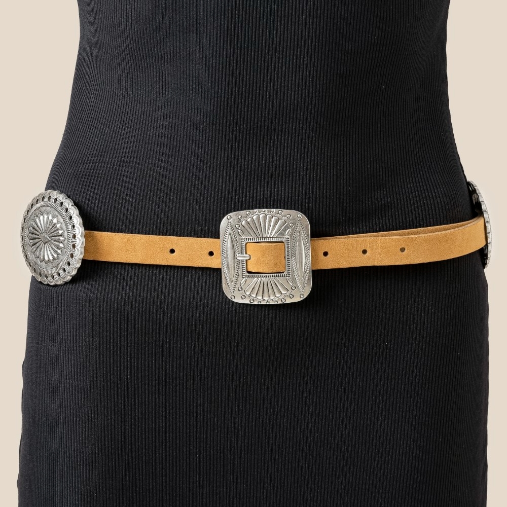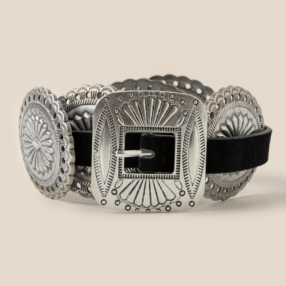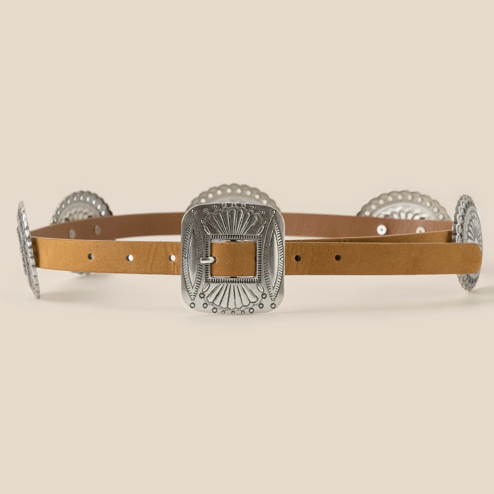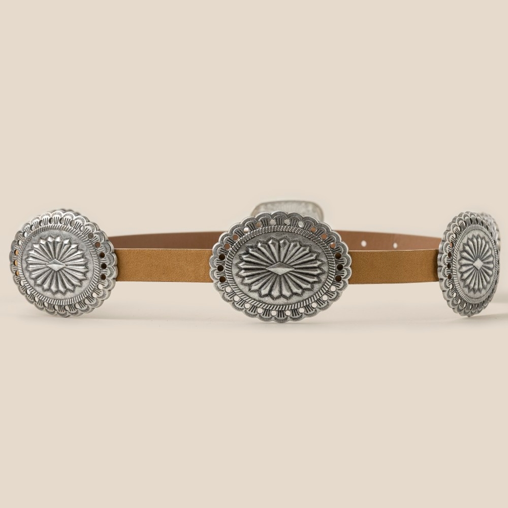 - Perfectly polished and endlessly versatile, this belt adds a distinctive western concho disc decor buckle design. The perfect way to complete any outfit, whether you're dressing up or keeping it casual. Available in GBK, SBK and SBR. This item is sold in packs of 1.