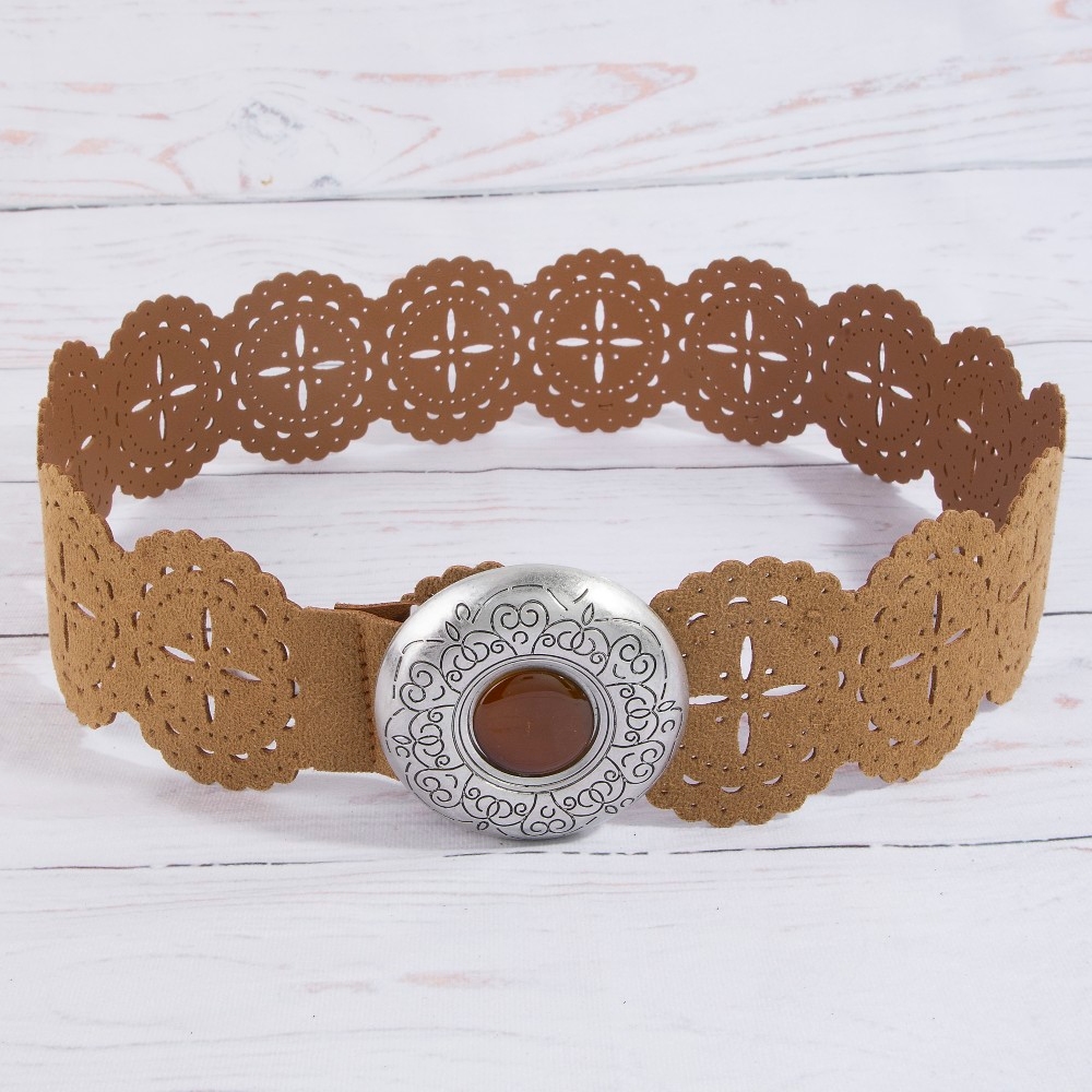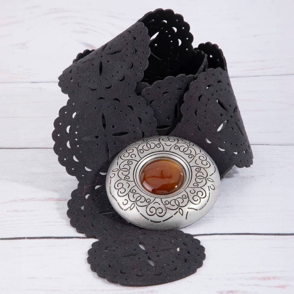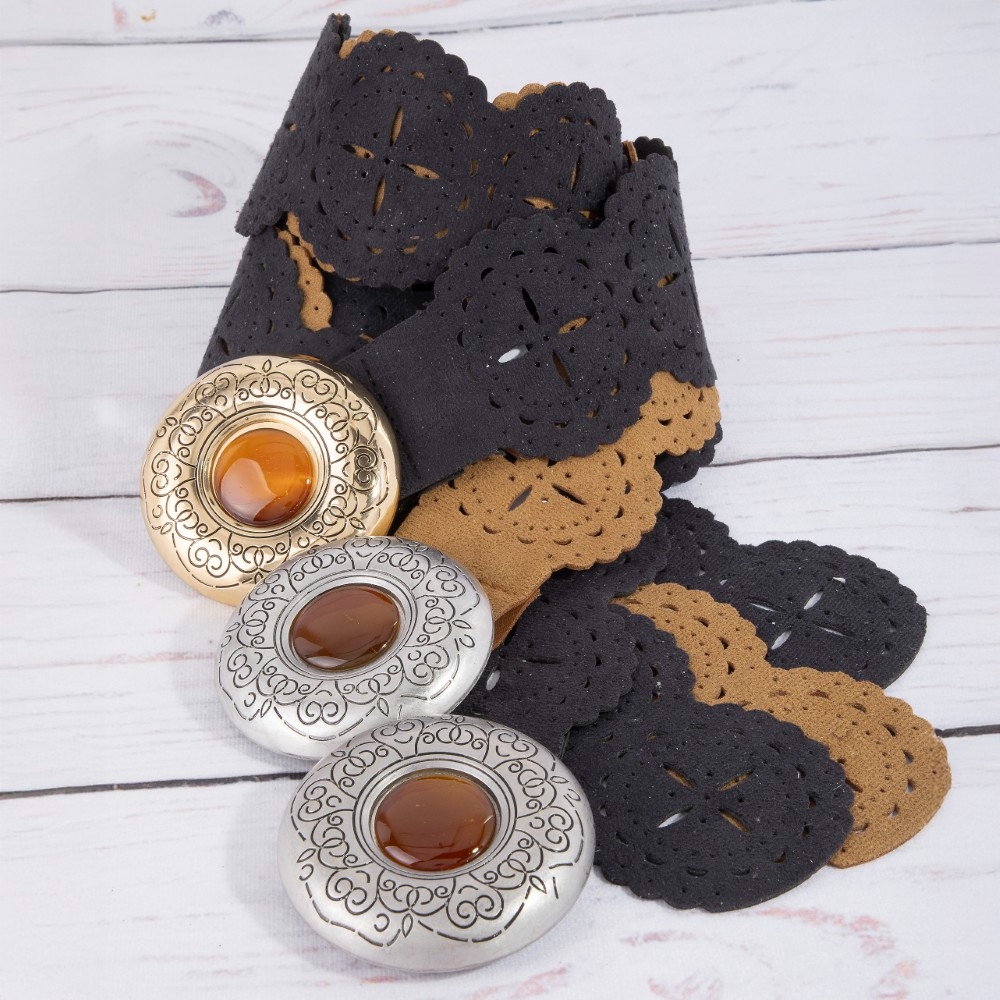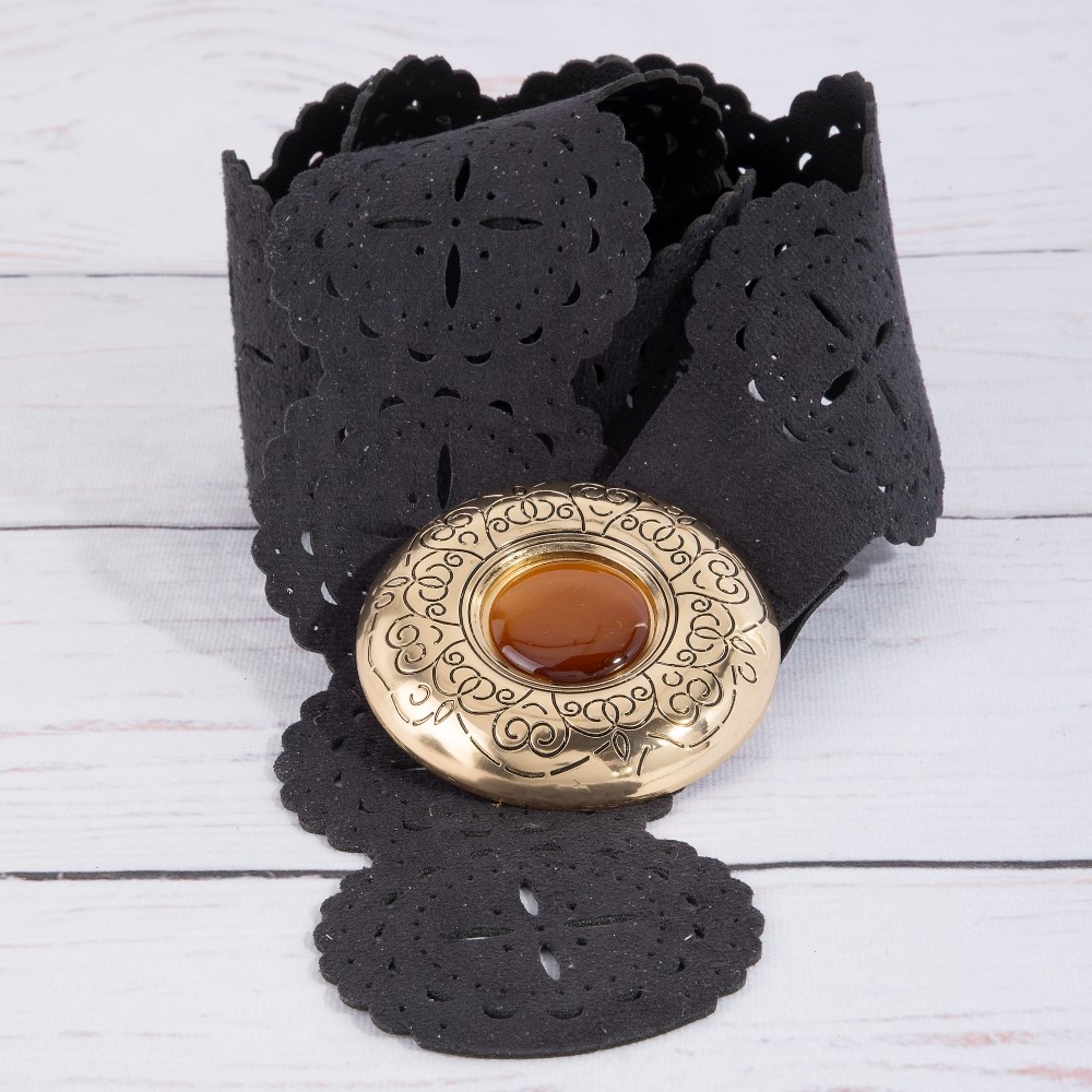 Hammered Oval Buckle Embroidered Vegan Leather Belt