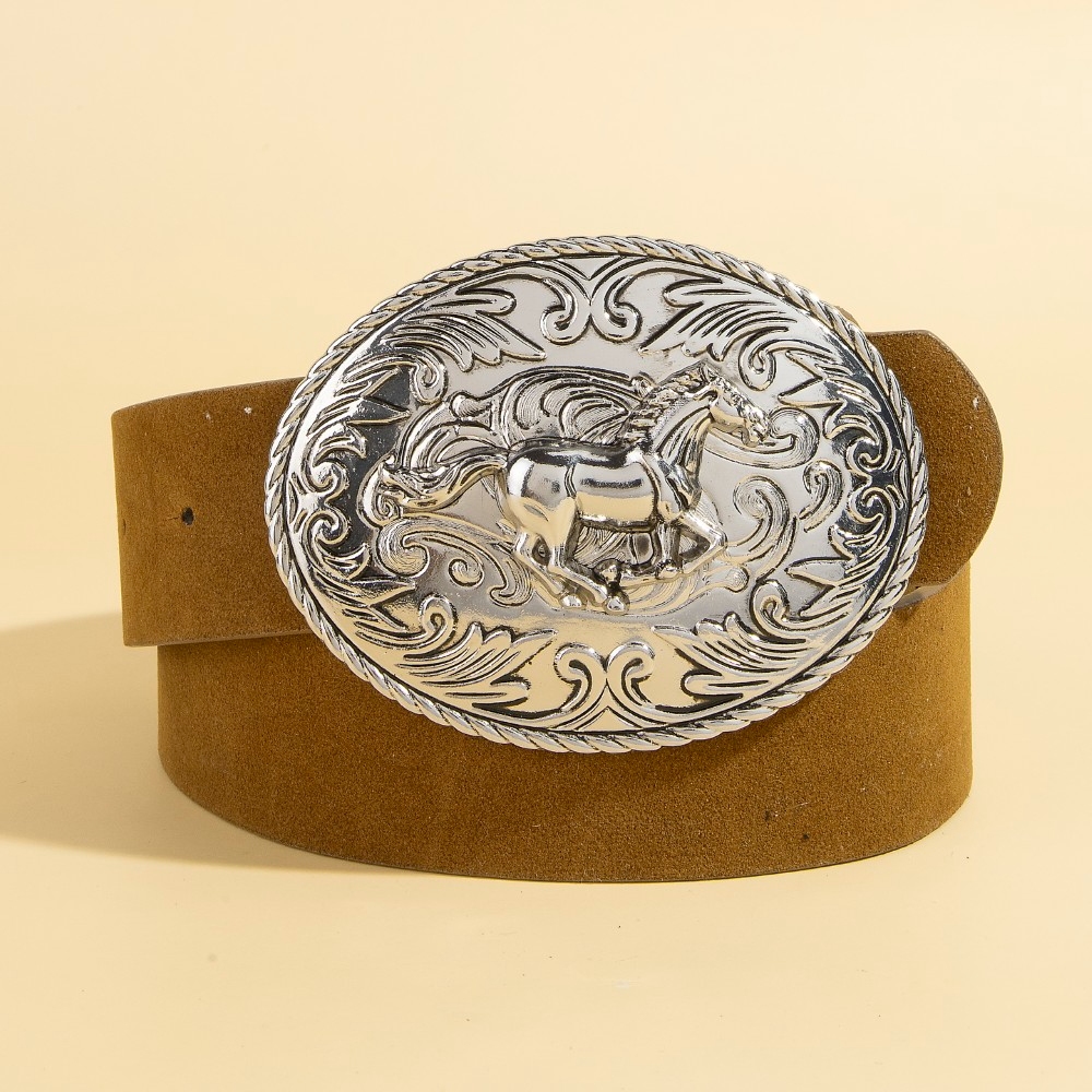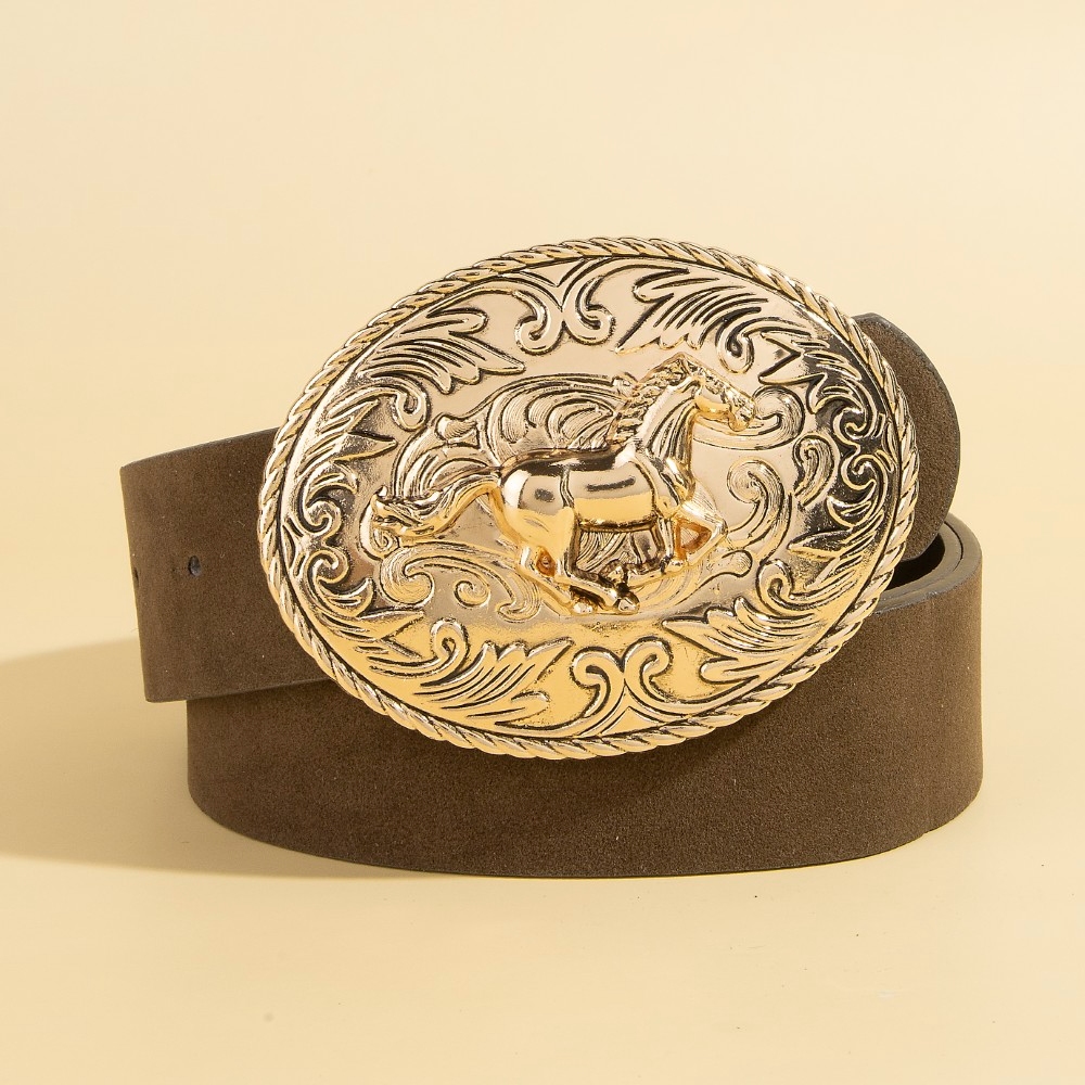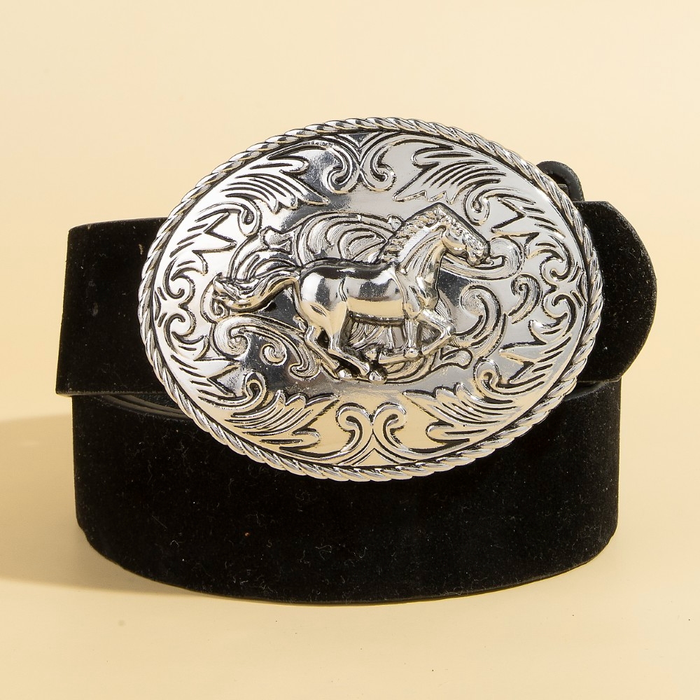 Effortlessly chic and sophisticated, this belt embodies a sophisticated western large engraved horse buckle design. This belt is an effortless way to add some personality to your outfit. Available in GBK, GDBR, SBK, SLBR. This item is sold in packs of 1.