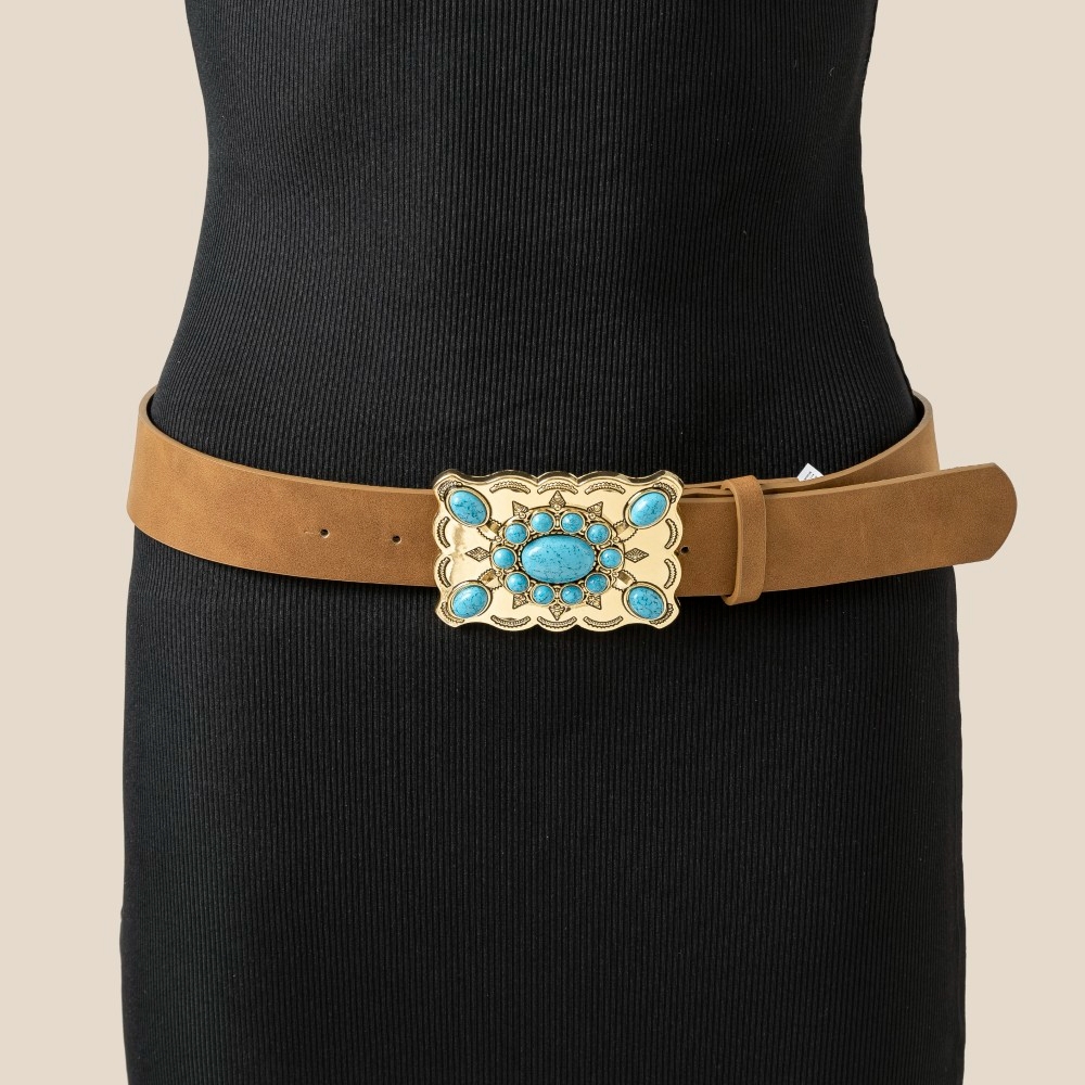 A timeless piece that will never go out of style, this belt introduces an exceptional western style turquoise stone large ornate buckle design. A must-have belt that adds a unique flair to any look. Available in GBK, GBR, GCO, SBK. This item is sold in packs of 1.