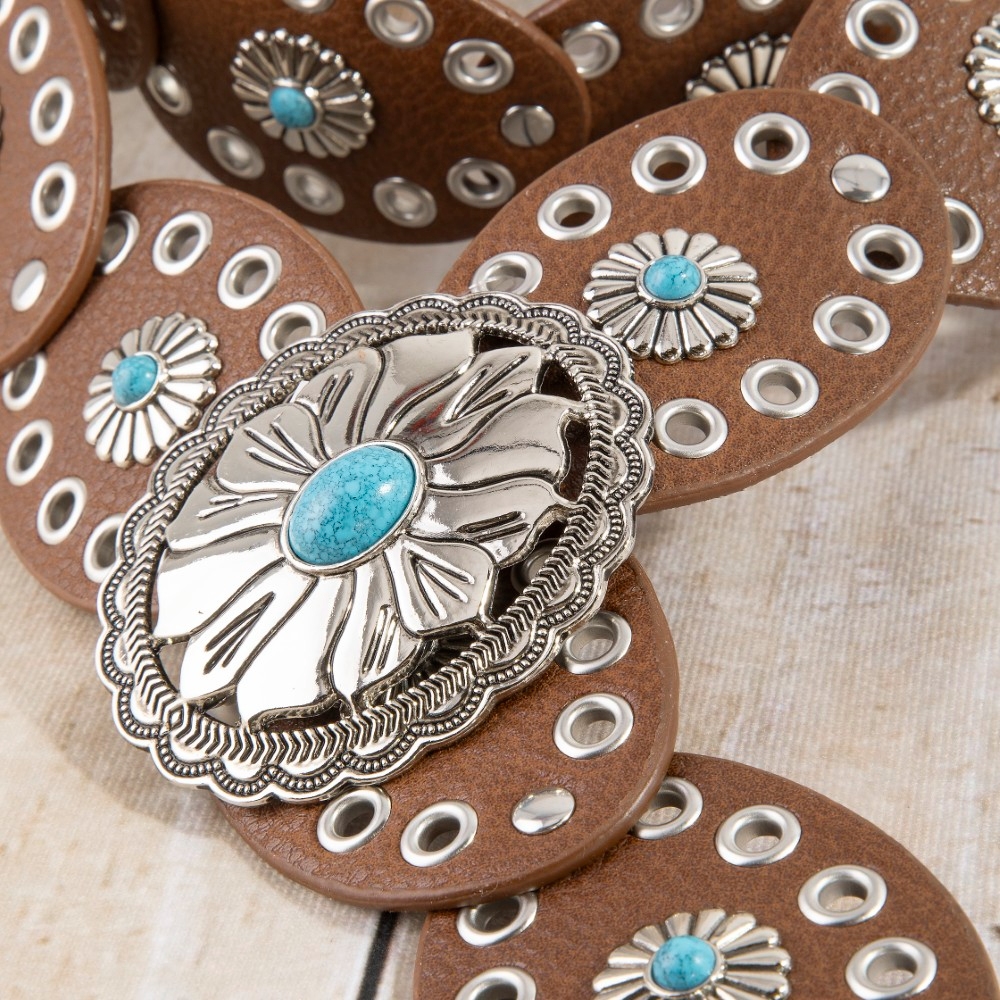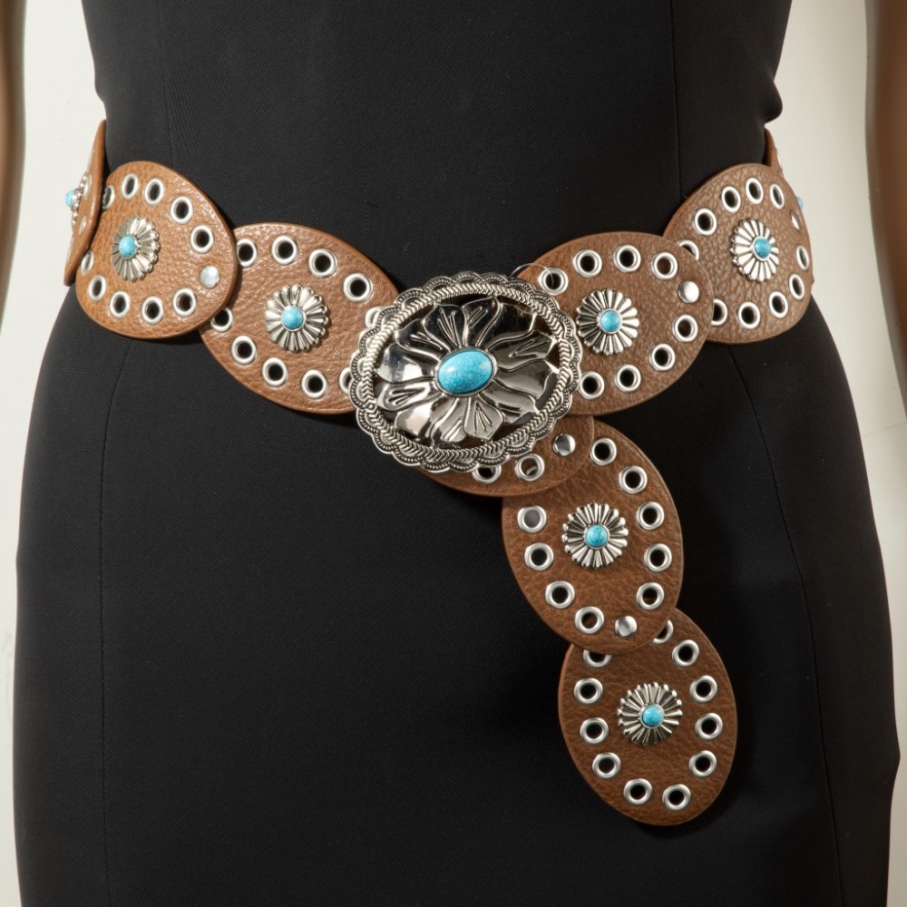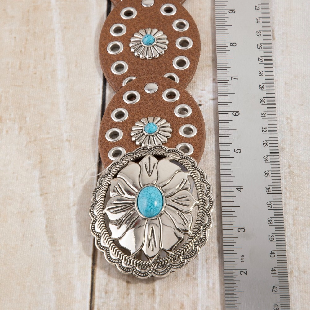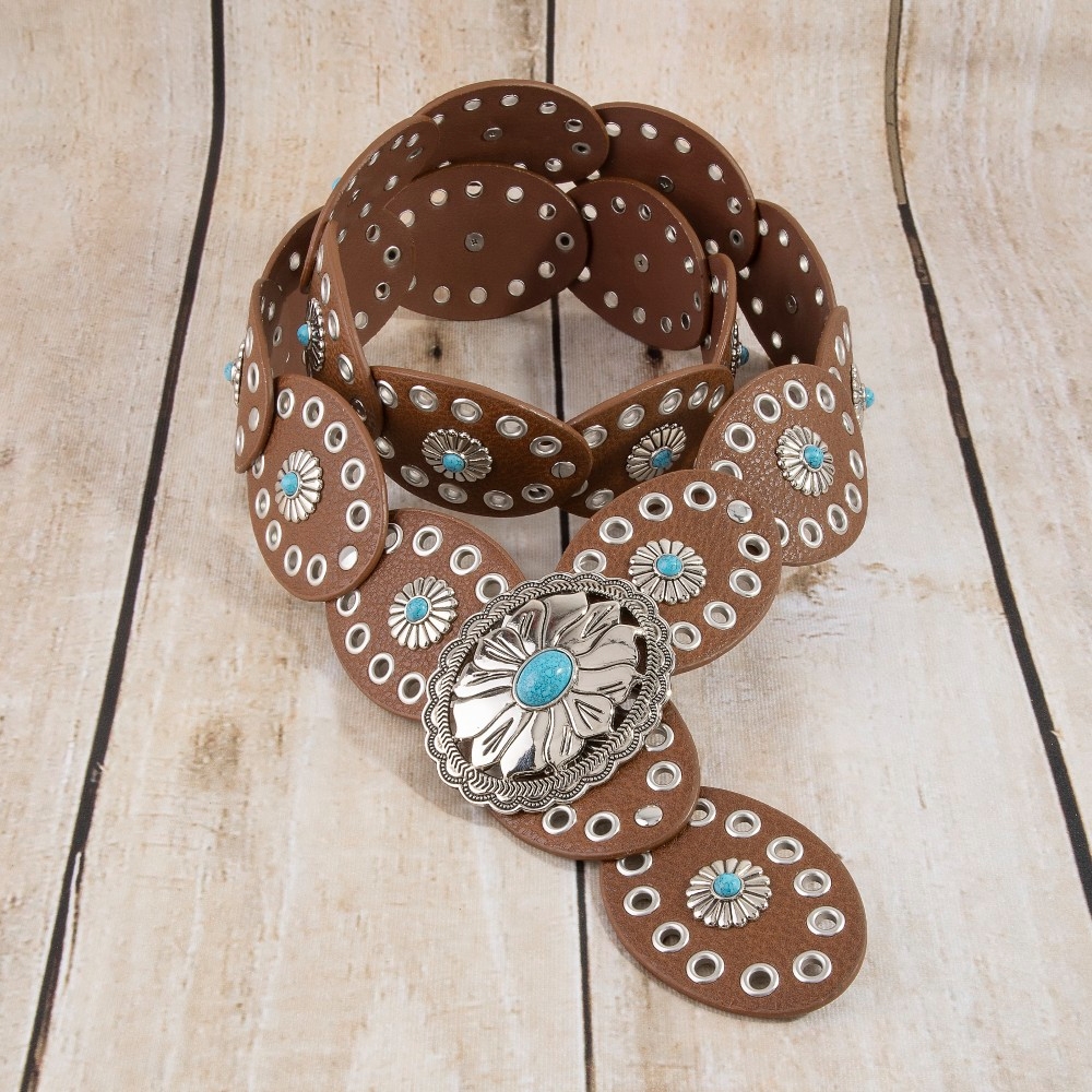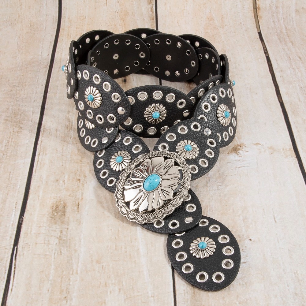 - Perfect for any occasion, from casual to formal, this leather belt features an exceptional western turquoise concho disc design. Discover a new level of fashion versatility as this leather belt effortlessly elevates the allure of your attire. Available in B, BZ. This item is sold in packs of 1.