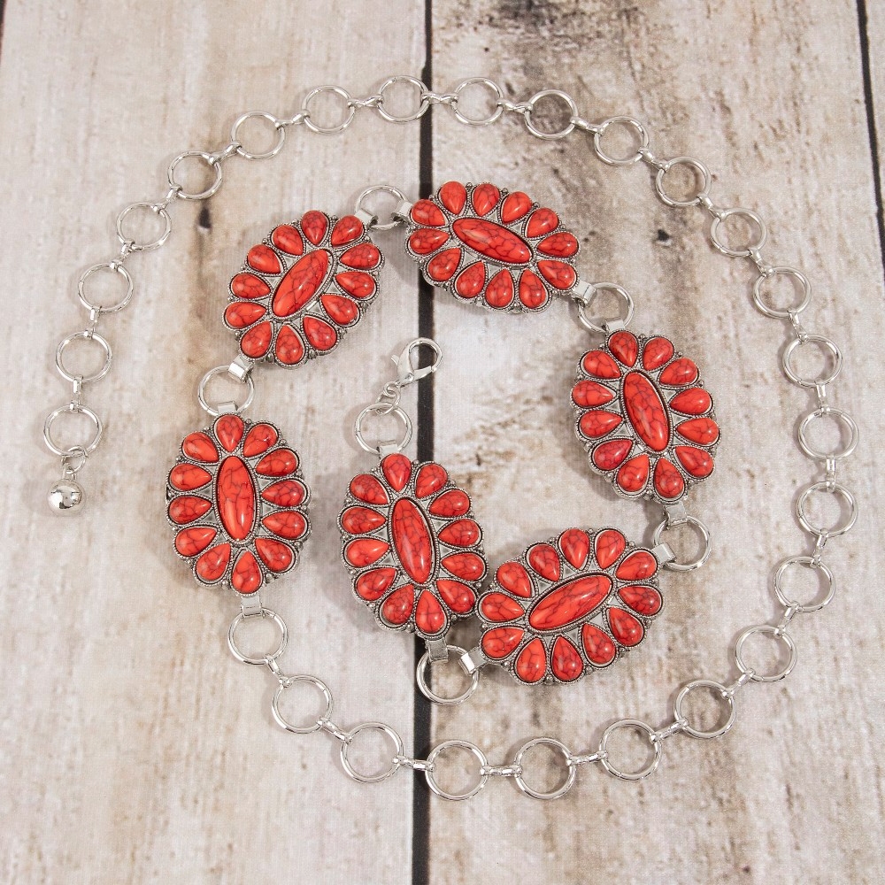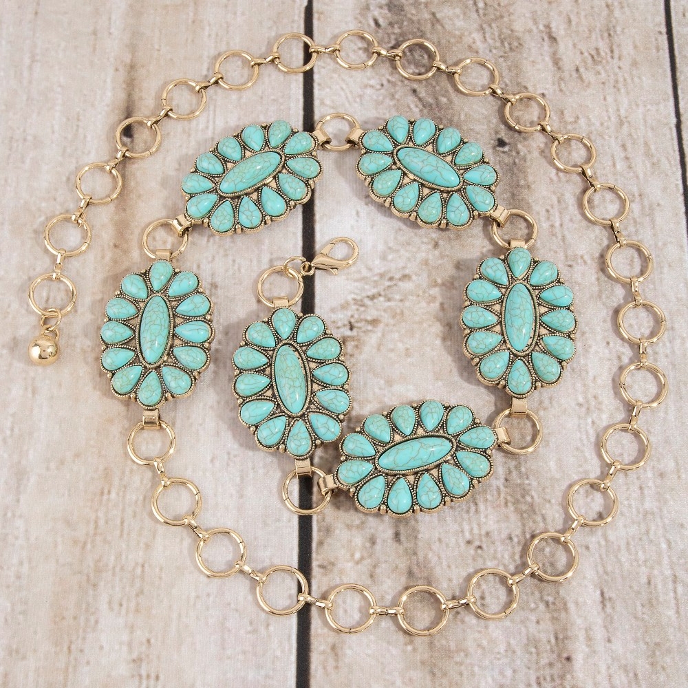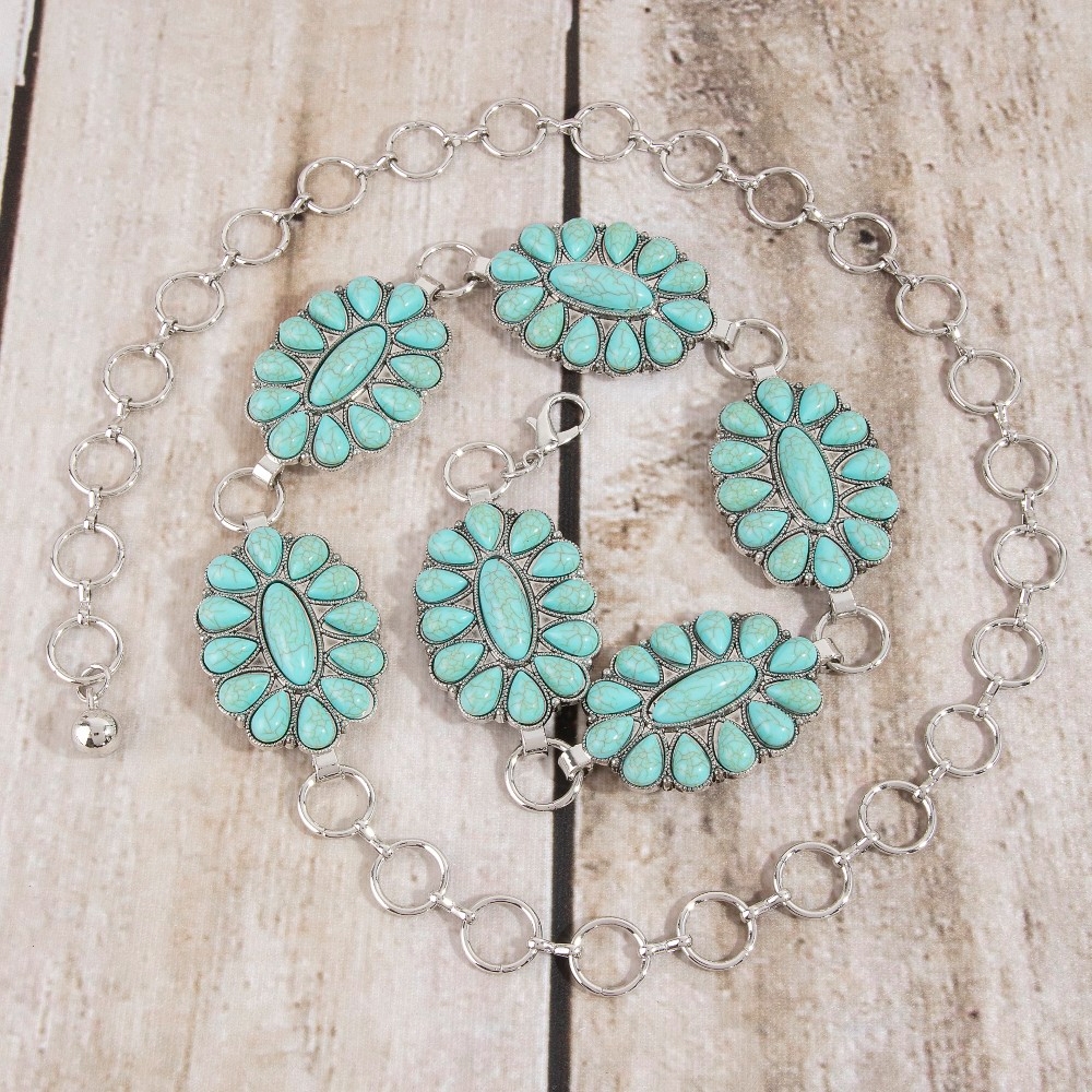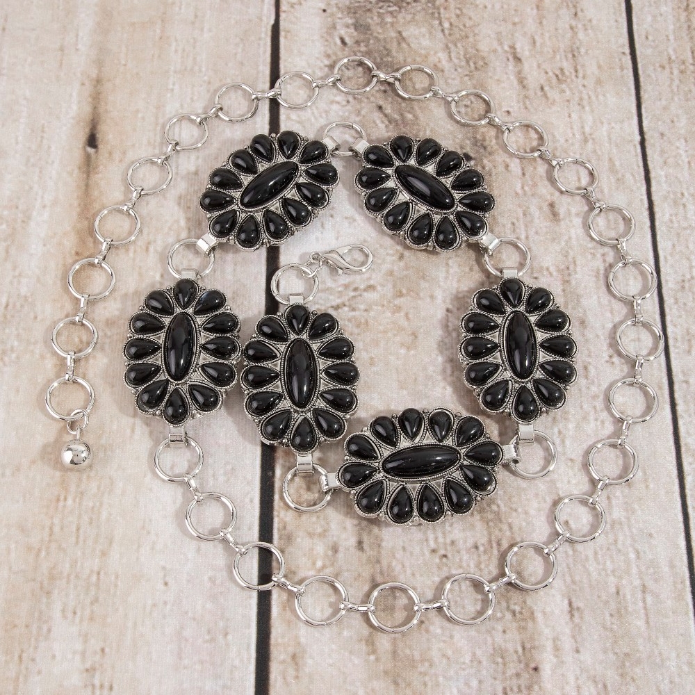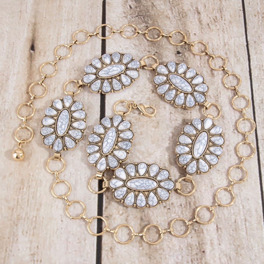 Add some edge to your look, this chain belt showcases an alluring blossom cluster design. Achieve a perfect balance of style and sophistication with this versatile chain belt, the ultimate choice for the fashion-savvy individual. Available in B, FU, GB, GFU, GTUR, GW, TUR, W. This item is sold in packs of 1.