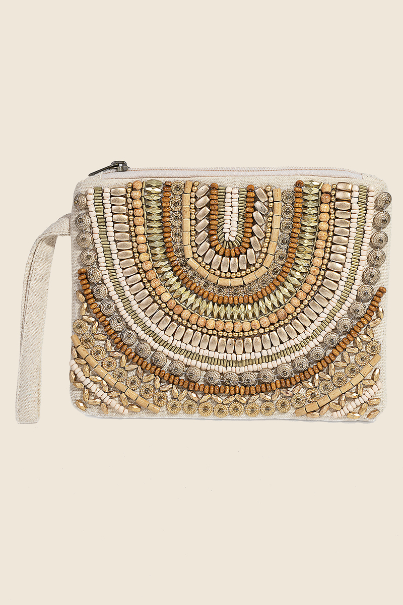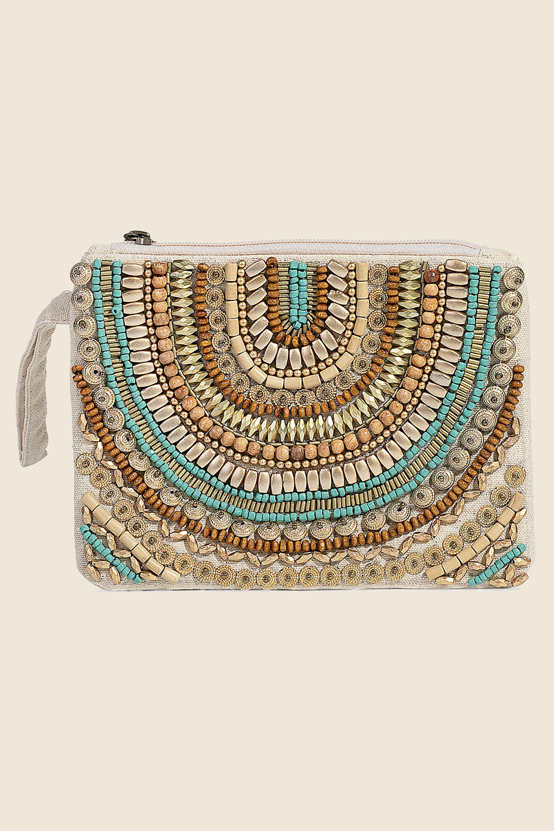 - Stay on-trend and stand out from the crowd, this bag displays a unique boho assorted beaded pattern cosmetic design. The perfect way to elevate any outfit, this bag adds a touch of elegance and style. Available in GOLD and TURQ. This item is sold in packs of 1.