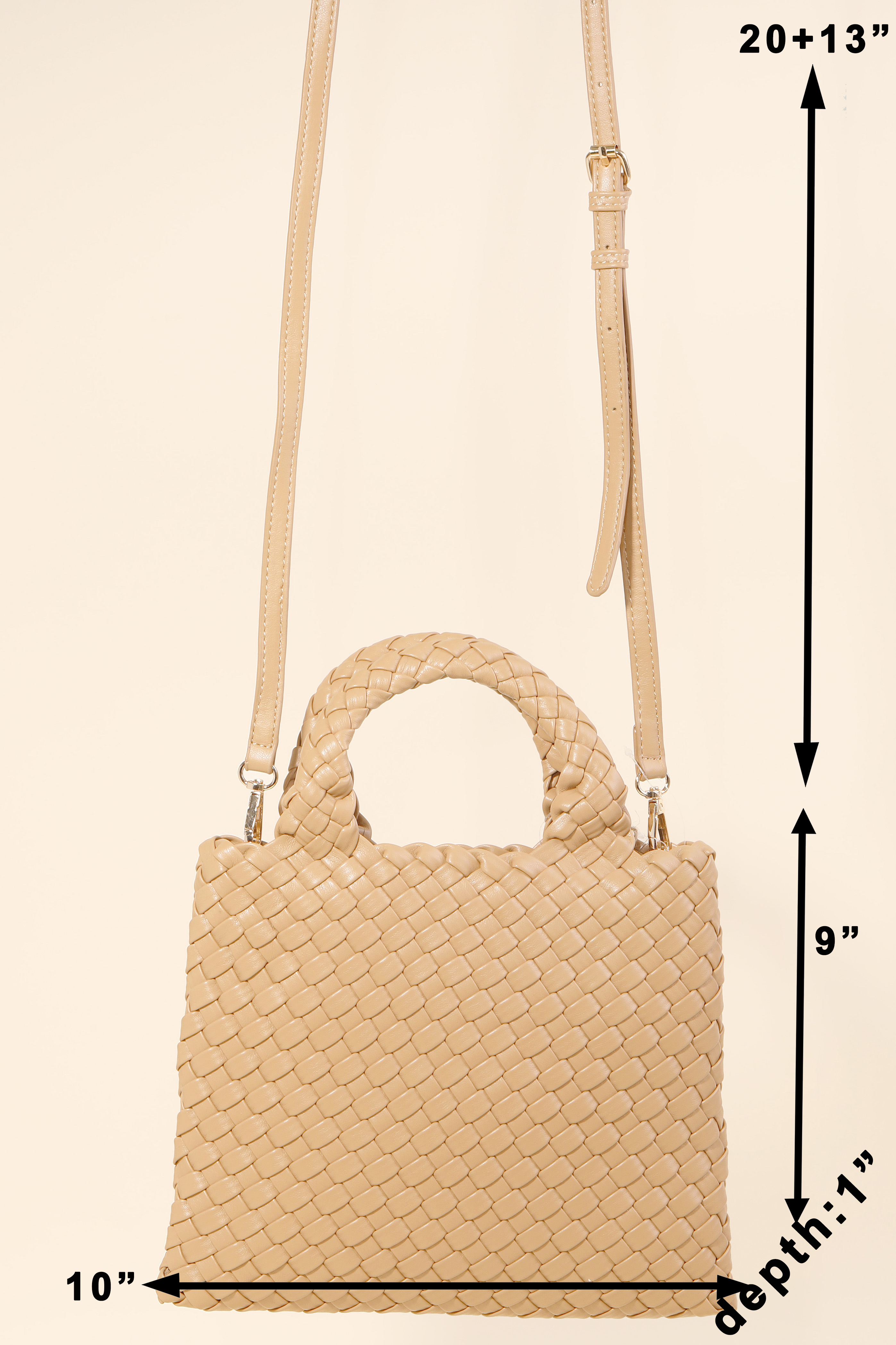 • Sleek and modern, this bag features a distinct braided faux leather square design. It also includes a small clutch bag. Elevate your style effortlessly with this versatile accessory, enhancing the appeal of any ensemble. Available in BK, CA, CB, CI, FU and TAN. This item is sold in packs of 1.