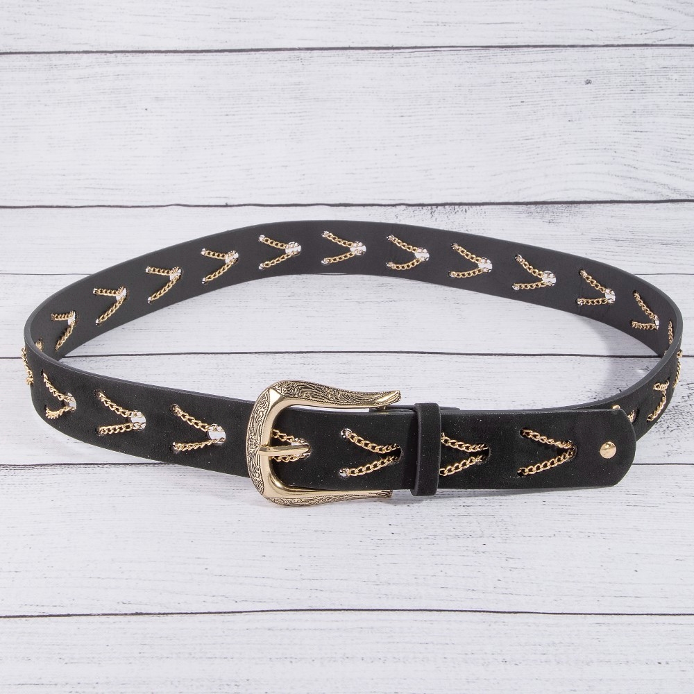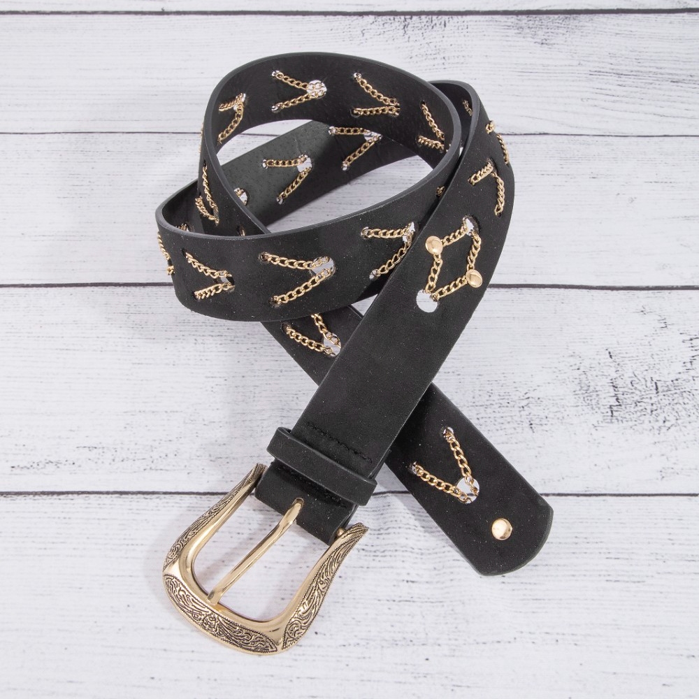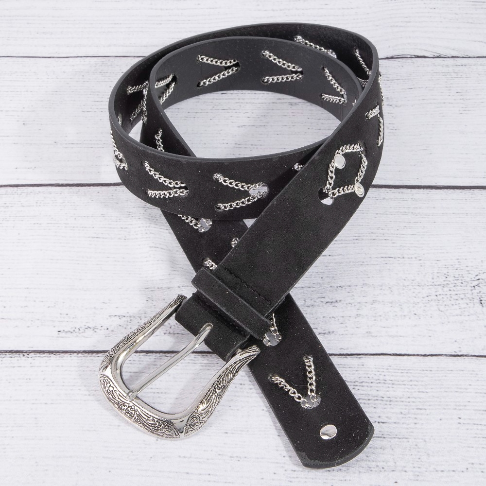 • Perfect for any occasion, from casual to formal, this leather belt comes with a special chain pattern detail vegan design. Infuse your ensemble with a touch of sophistication using this versatile leather belt, a game-changer in the world of fashion. Available in GBK, SBK, SDBR. This item is sold in packs of 1.