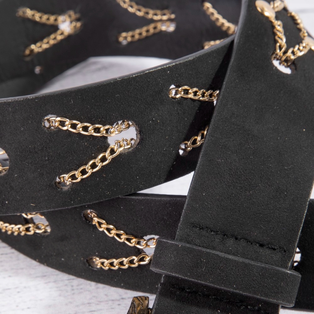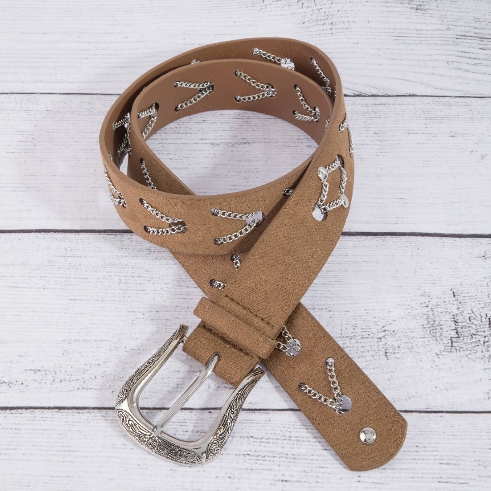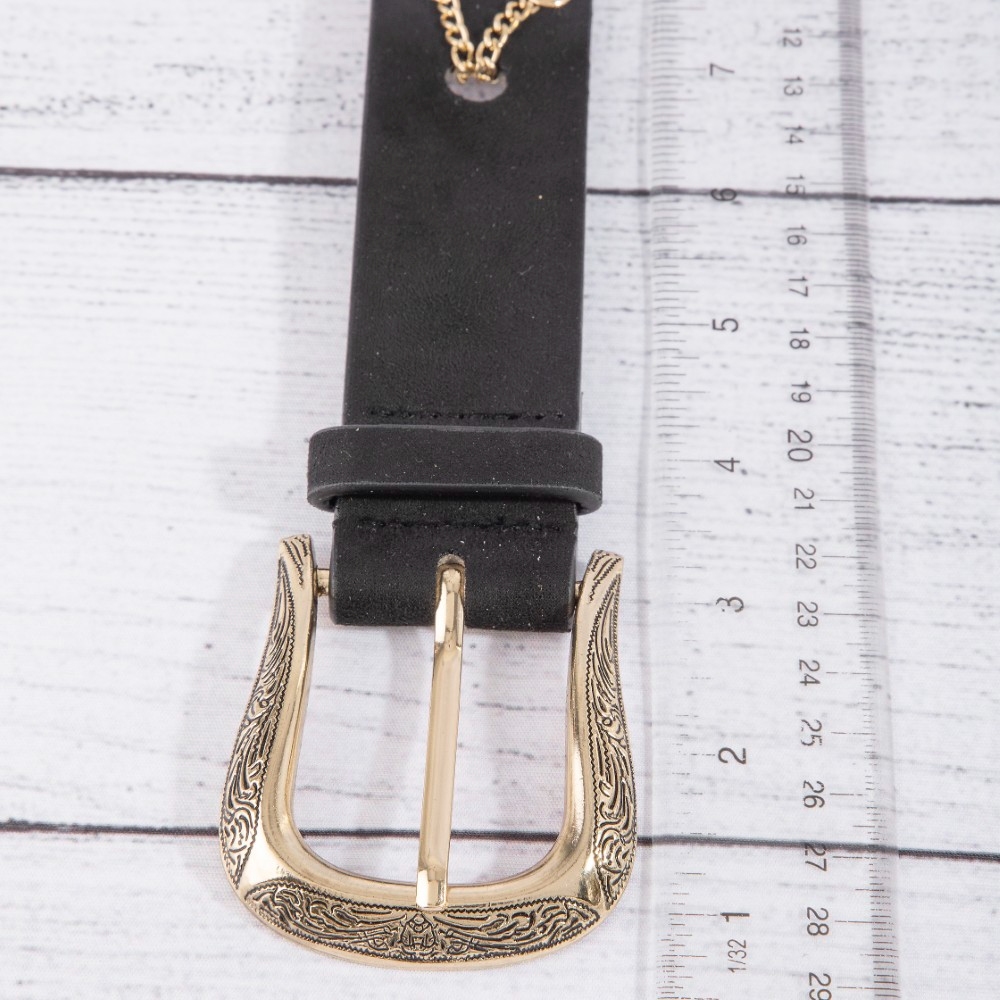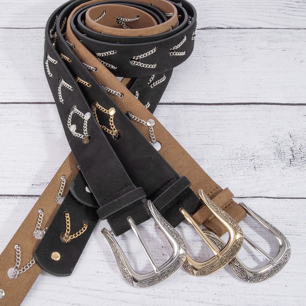 • Perfect for any occasion, from casual to formal, this leather belt comes with a special chain pattern detail vegan design. Infuse your ensemble with a touch of sophistication using this versatile leather belt, a game-changer in the world of fashion. Available in GBK, SBK, SDBR. This item is sold in packs of 1.