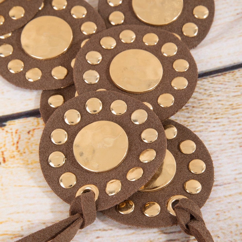 • A must-have for any fashion-forward individual, this belt possesses a fine western concho disc link design. This belt is an effortless way to add some personality to your outfit. Available in GBK, GCO, SBK. This item is sold in packs of 1.
