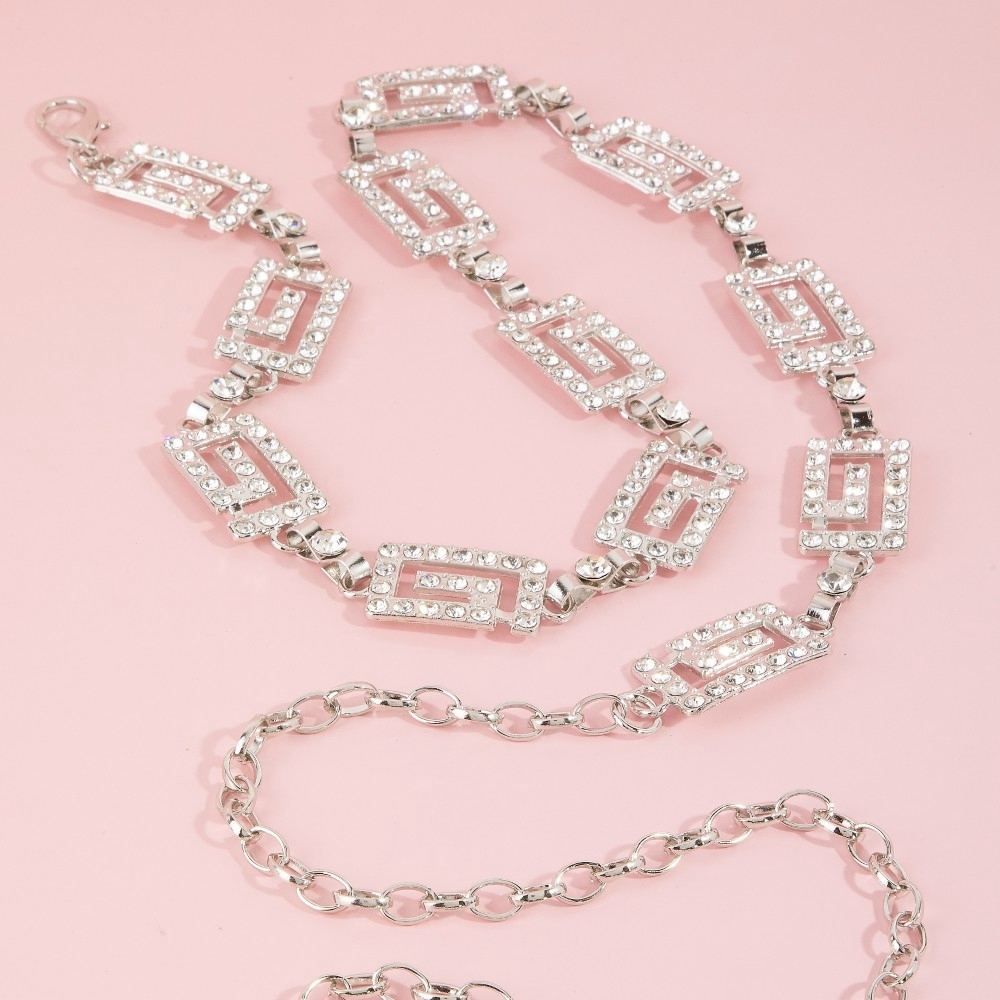 • This piece is a true showstopper, this chain belt includes a stunning crystal greek key rectangle link design. Elevate your fashion statement with this versatile chain belt, adding a touch of glamour to your everyday look. Available in G, RO. This item is sold in packs of 1.