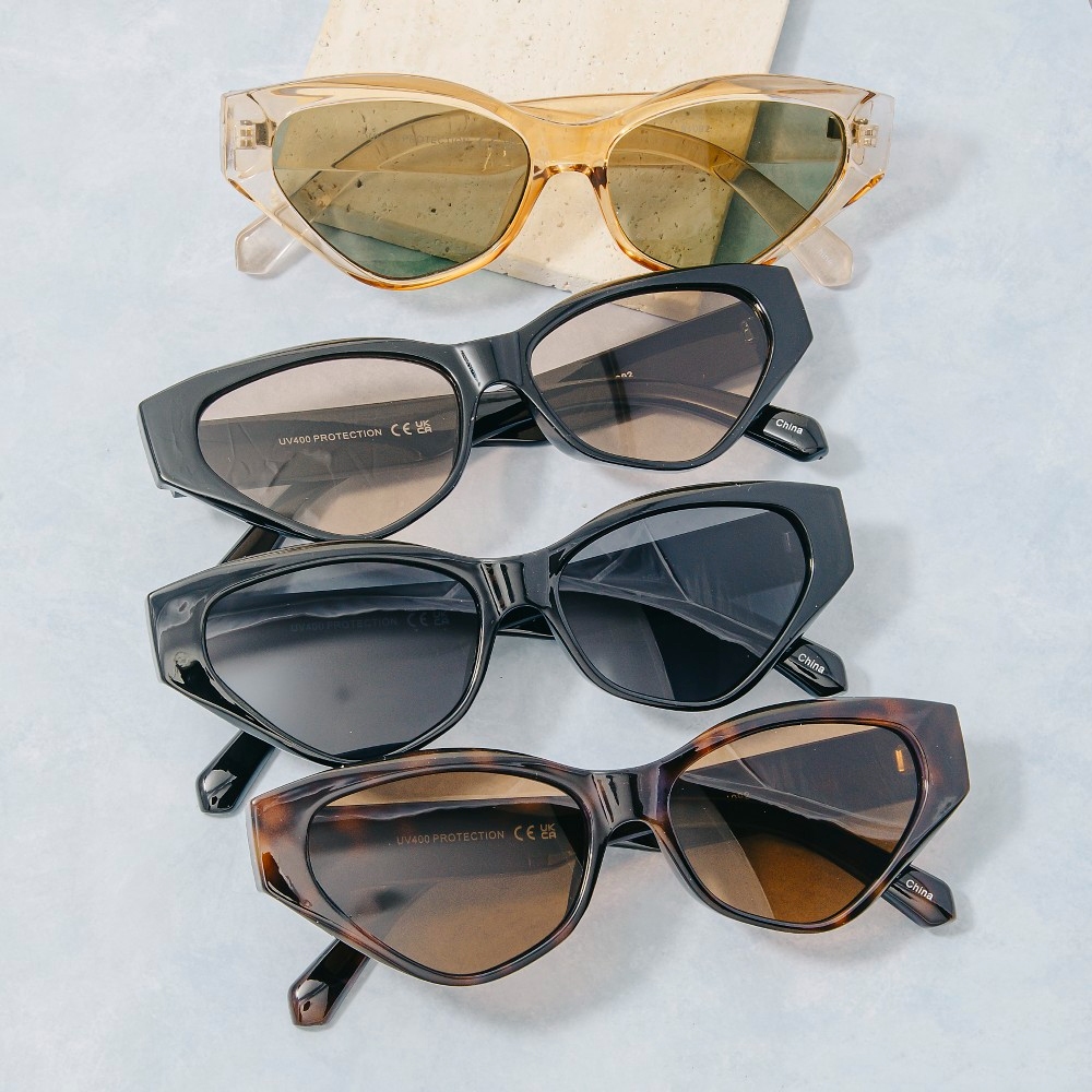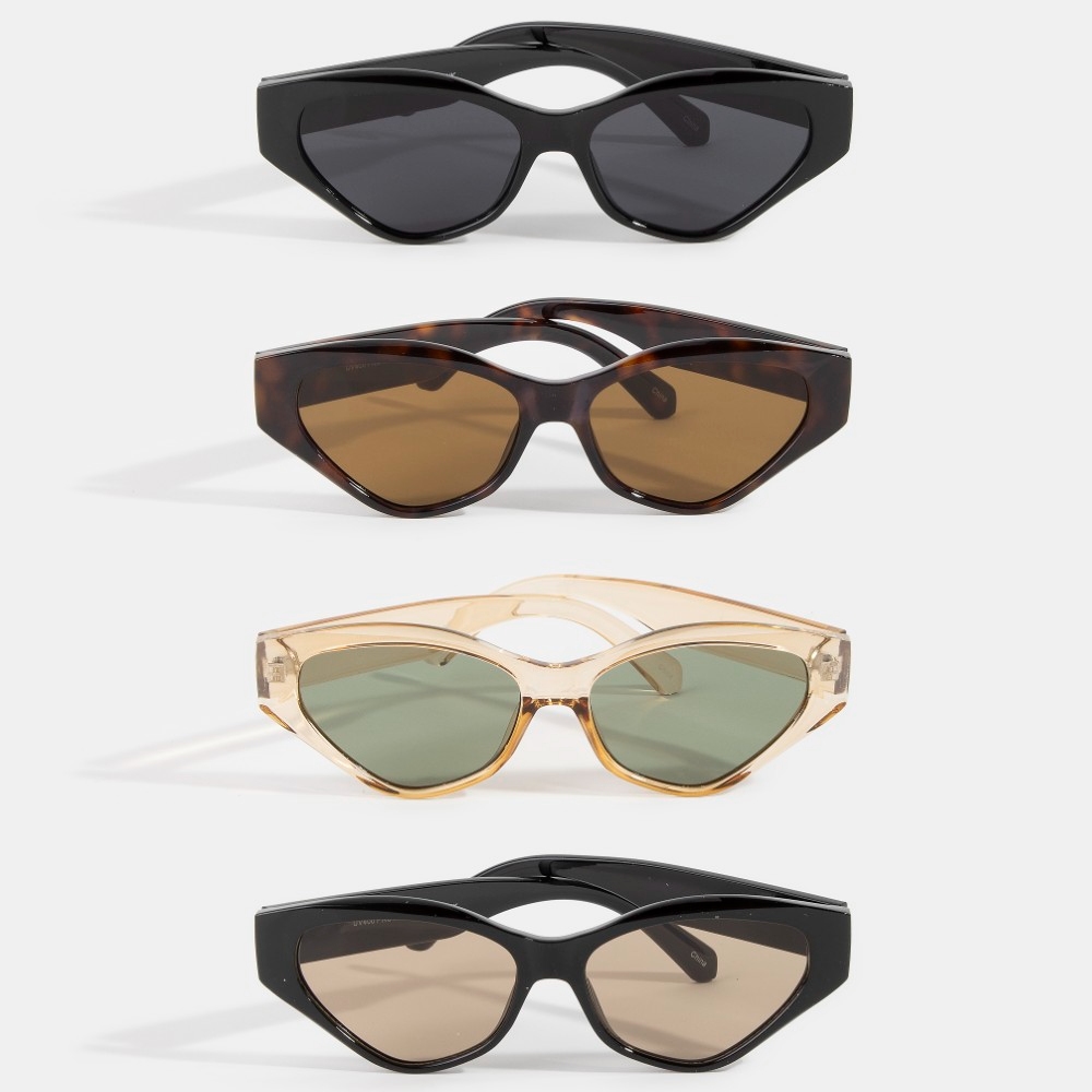 Perfect for any occasion, this set of sunglasses emanates an elegant geometric angular cat eye sunglasses set design. This set of sunglasses is the perfect way to add a touch of elegance to any outfit. This item is sold in packs of 12.