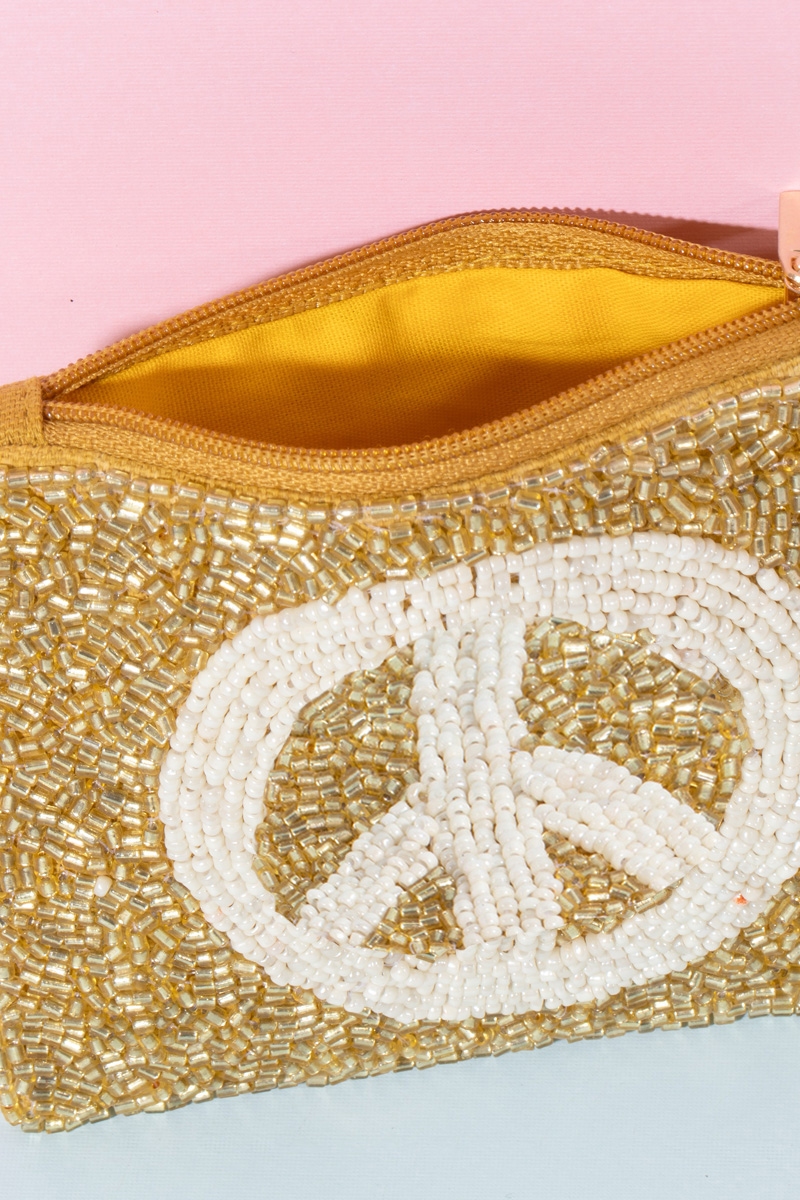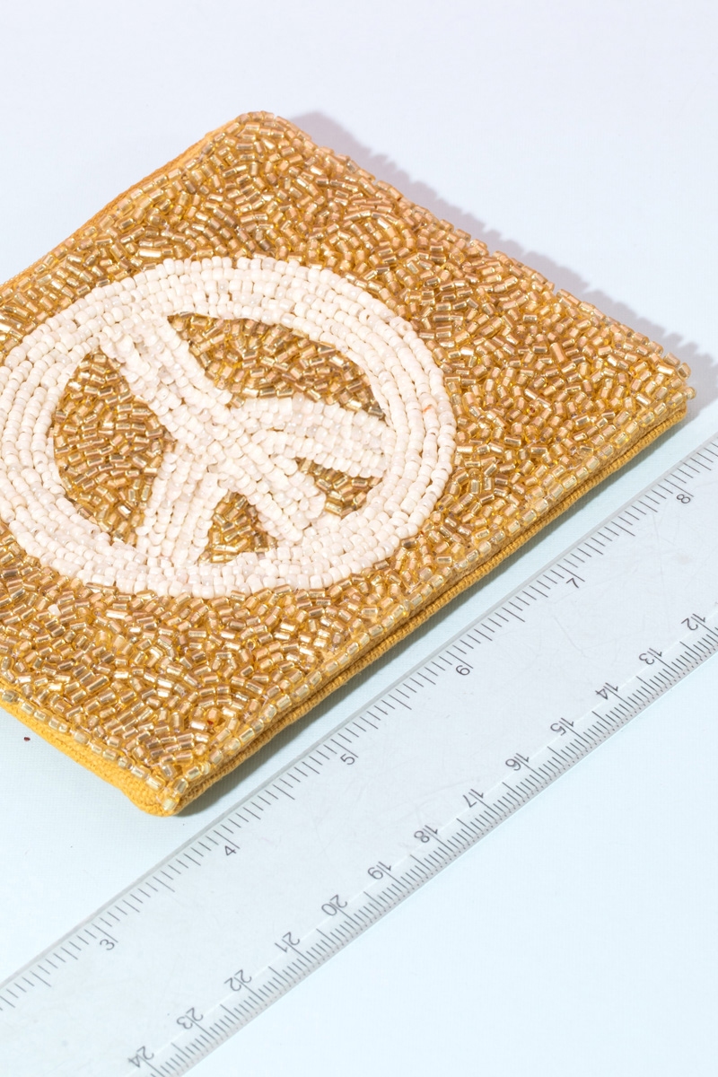 - Unleash your inner fashionista, this contains a special gold peace sign beaded coin purse design. Unleash the charm of this versatile , effortlessly turning any outfit into a fashion statement. This item is sold in packs of 1.