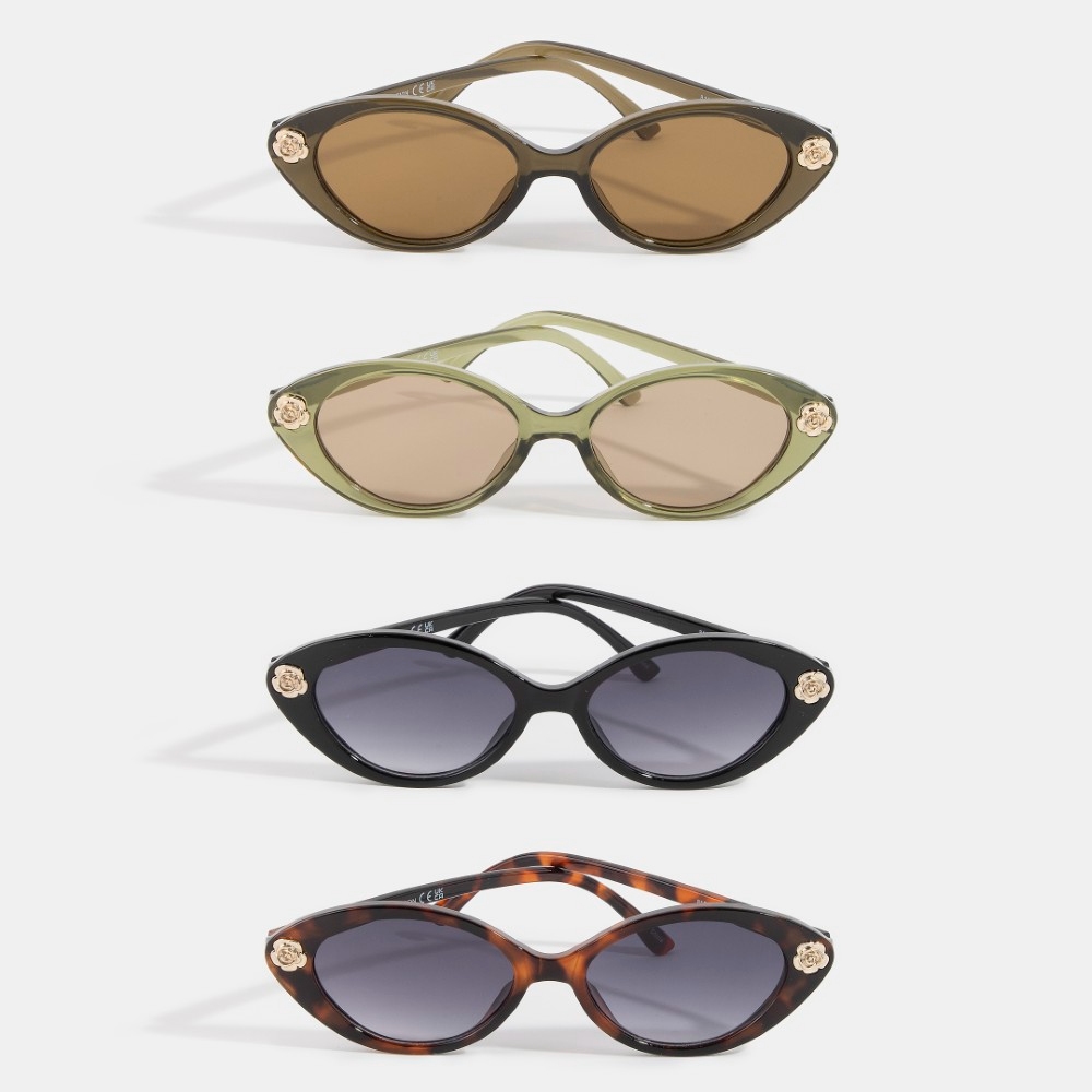 A timeless piece that you'll wear for years to come, this set of sunglasses adds a distinctive gold rose accent cat eye sunglasses set design. Perfect for any occasion, this versatile set of sunglasses will enhance any outfit you wear. This item is sold in packs of 12.
