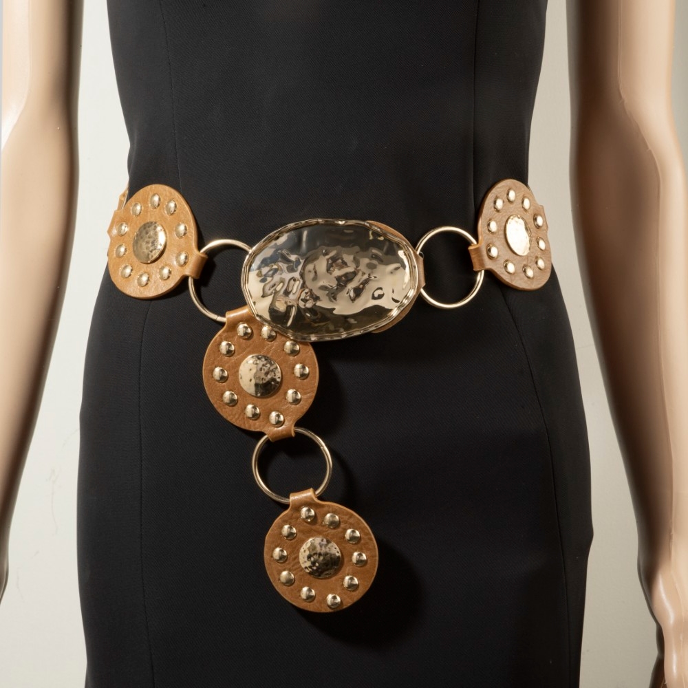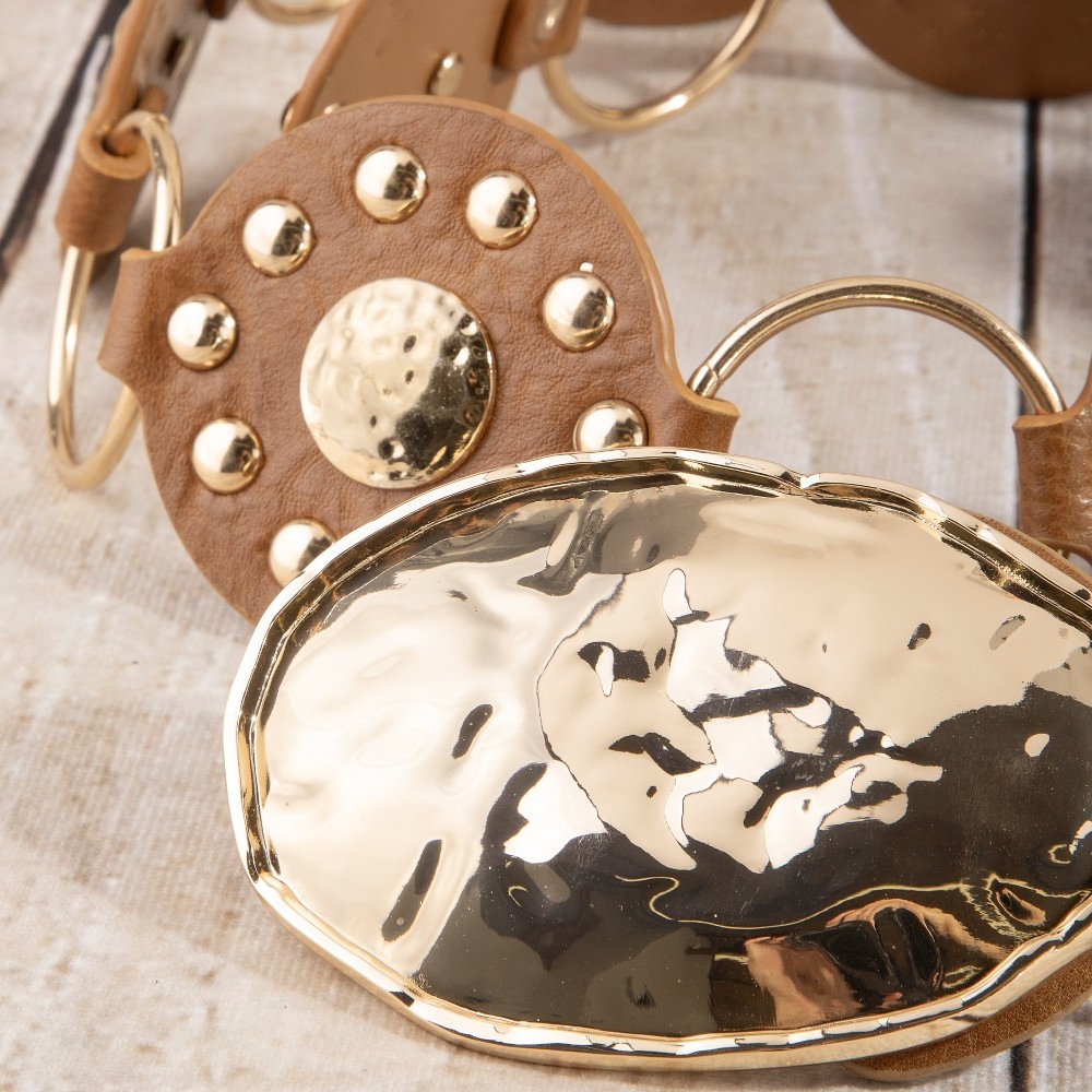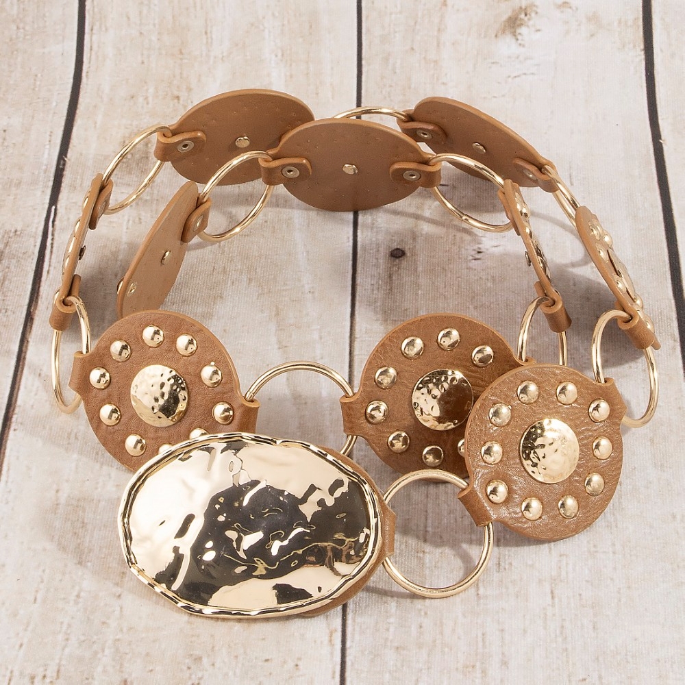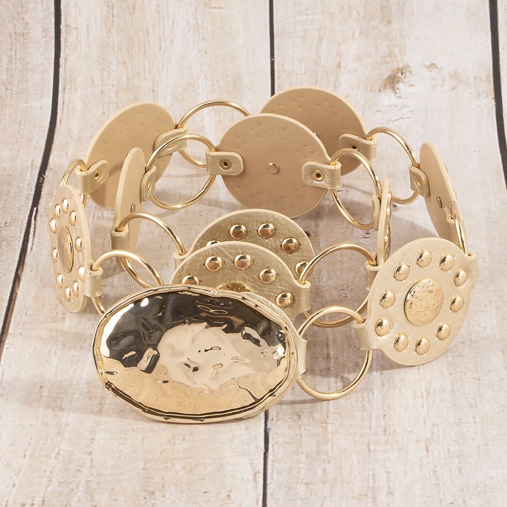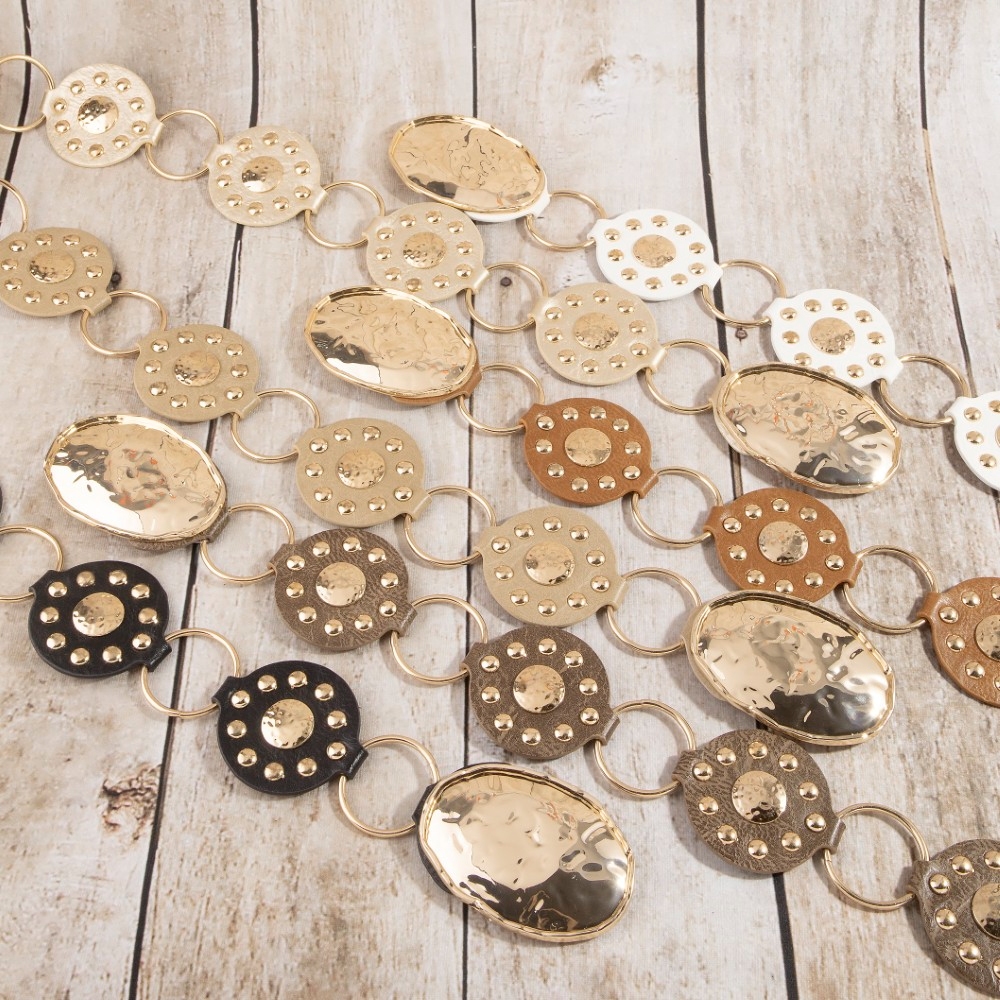 • A bold and daring choice that is sure to impress, this chain belt boasts a magnificent gold studded circle ring design. Upgrade your fashion game with this versatile chain belt, a timeless addition that complements any outfit seamlessly. Available in B, BR, BZ, G, KH, W. This item is sold in packs of 1.