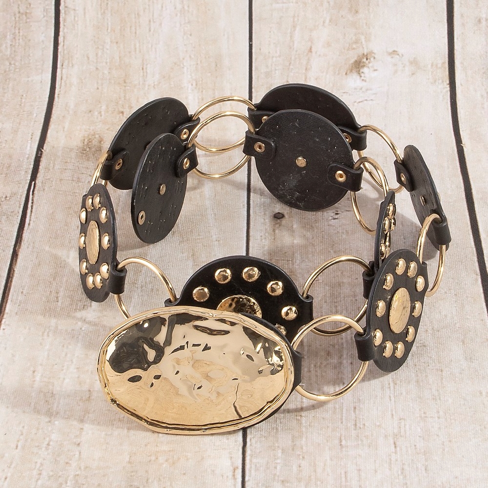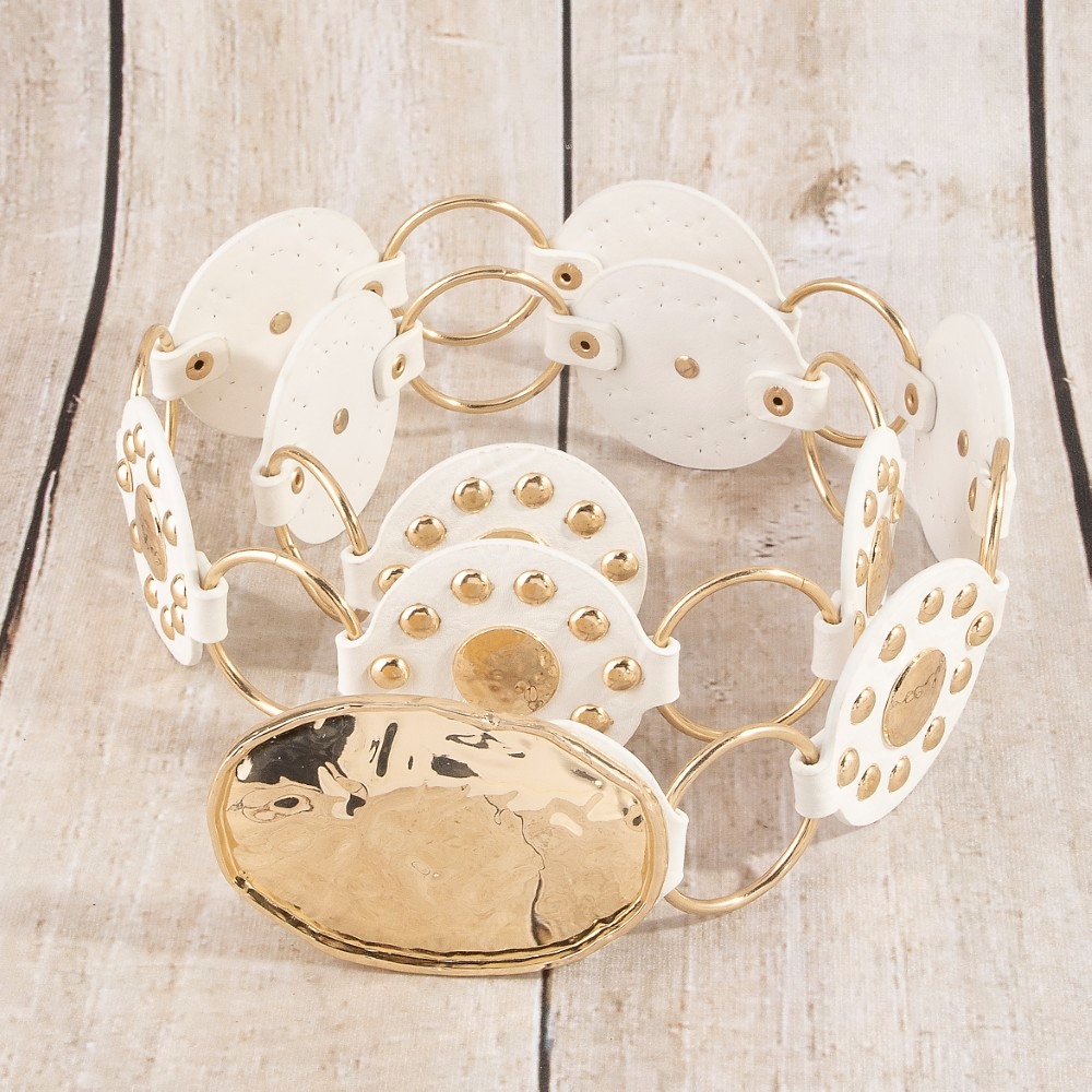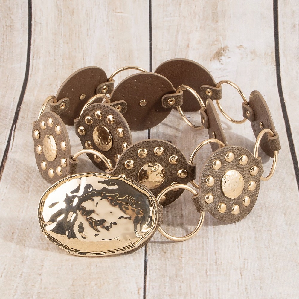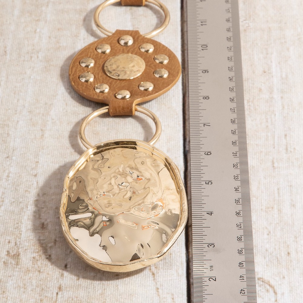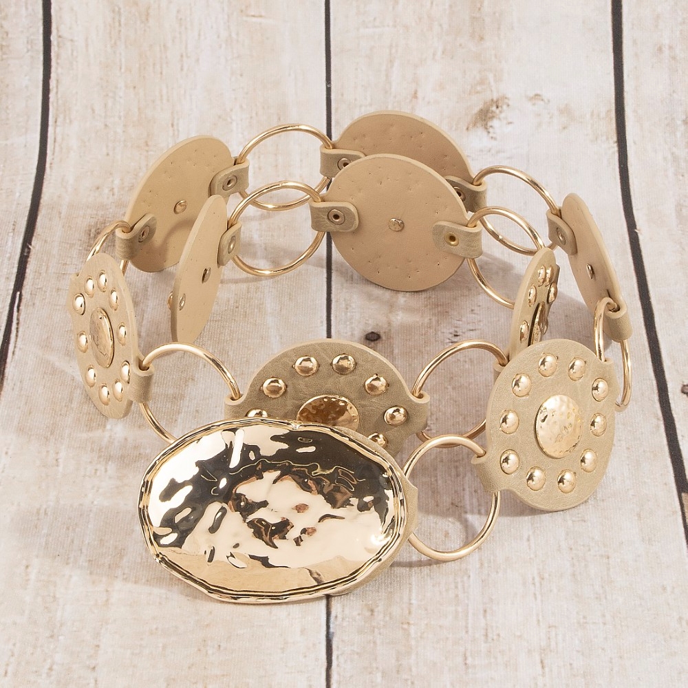 • A bold and daring choice that is sure to impress, this chain belt boasts a magnificent gold studded circle ring design. Upgrade your fashion game with this versatile chain belt, a timeless addition that complements any outfit seamlessly. Available in B, BR, BZ, G, KH, W. This item is sold in packs of 1.