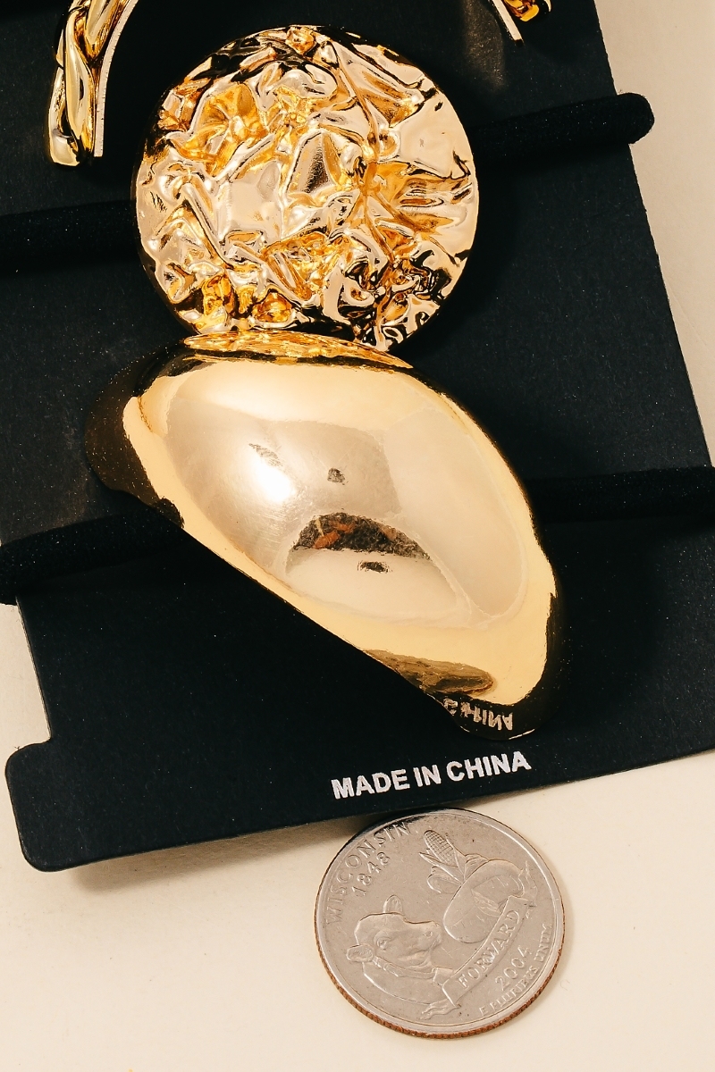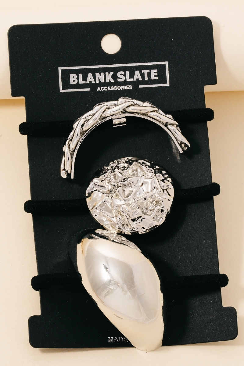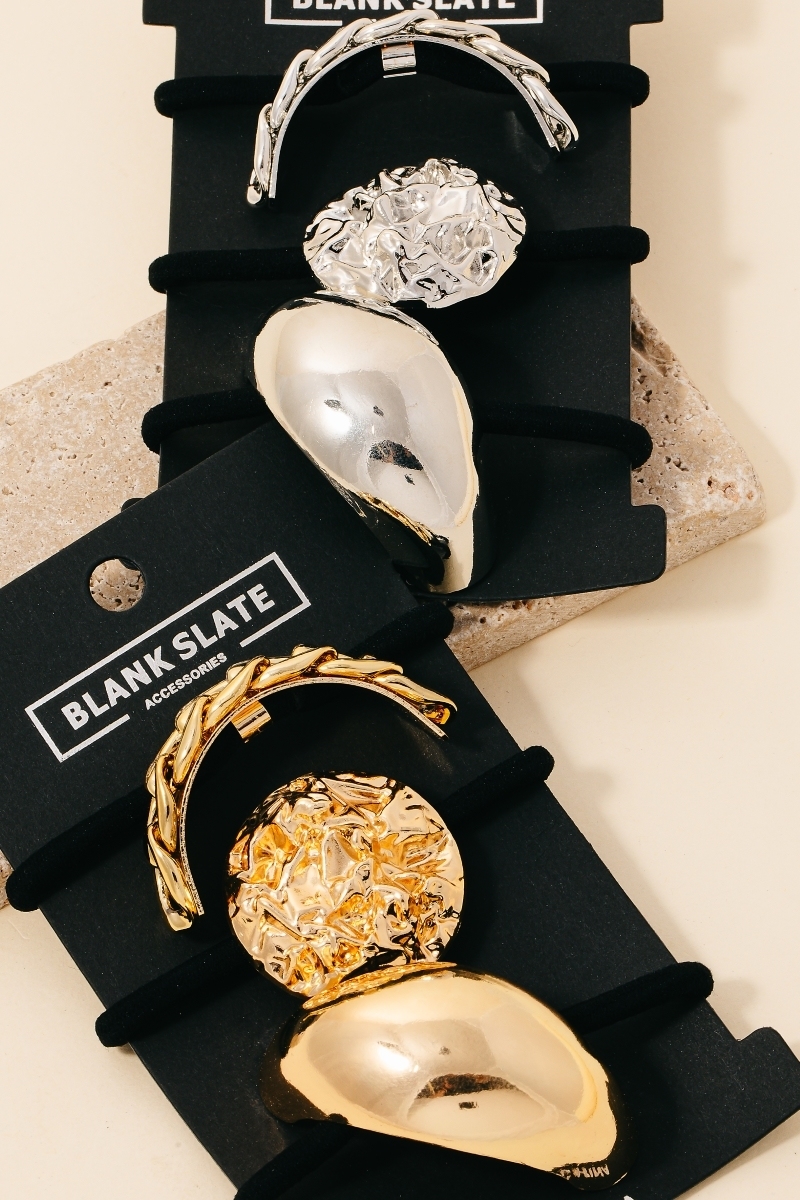 • Elevate your style with something unique and daring, this shows off a distinctive assorted metallic shapes hair tie set design. Make a lasting impression with this versatile , a subtle yet impactful addition to your fashion repertoire. Available in G and S. This item is sold in packs of 1.