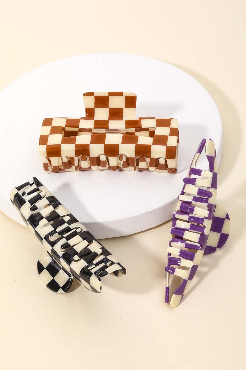 - Add a touch of luxury to any outfit, this hair clip presents a striking checkered pattern set design. Unleash the charm of this versatile accessory, effortlessly turning any outfit into a fashion statement. This item is sold in packs of 1.
