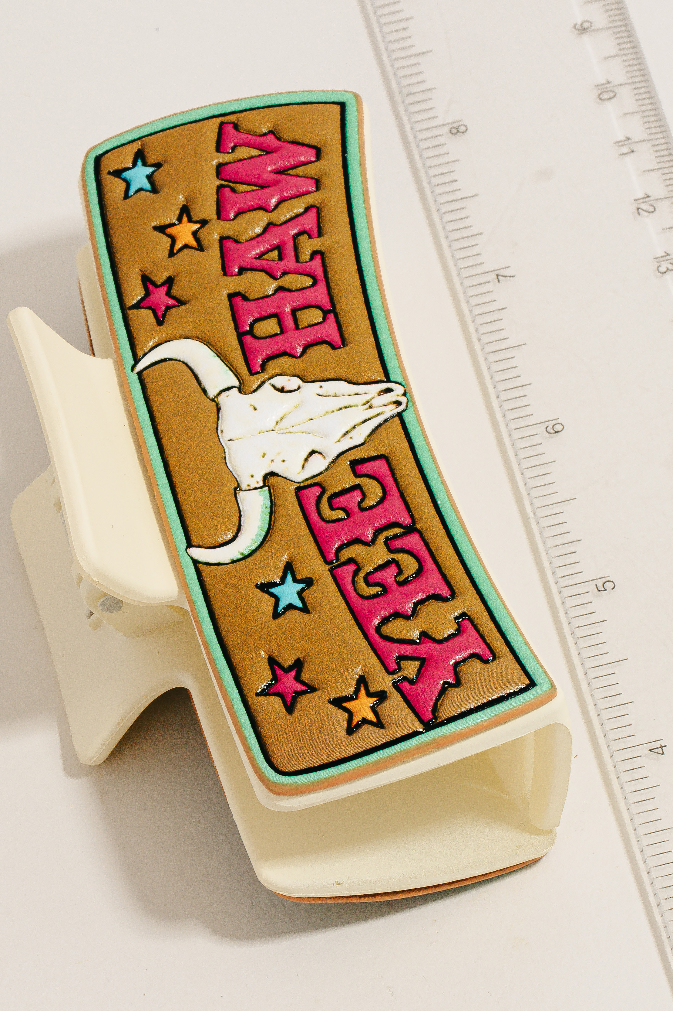 This piece is designed to make a statement, this hair claw comes with a special faux leather bull skull yeehaw design. Achieve a perfect balance of style and sophistication with this versatile accessory, the ultimate choice for the fashion-savvy individual. Available in IVMT. This item is sold in packs of 1.