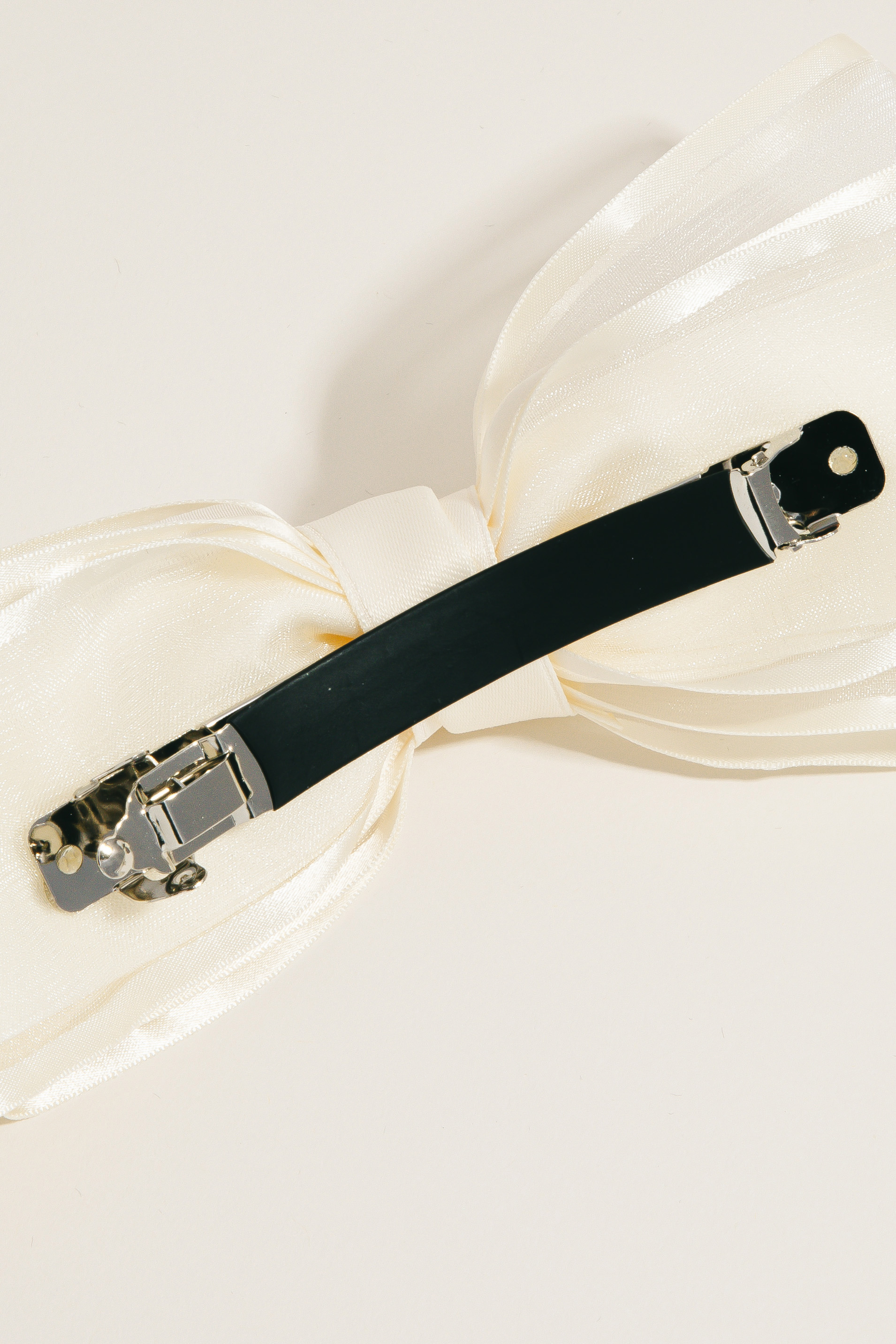 • Uniquely designed and endlessly stylish, this hair clip evokes a captivating large bow tie design. Unleash the charm of this versatile accessory, effortlessly turning any outfit into a fashion statement. Available in BK and IV. This item is sold in packs of 1.