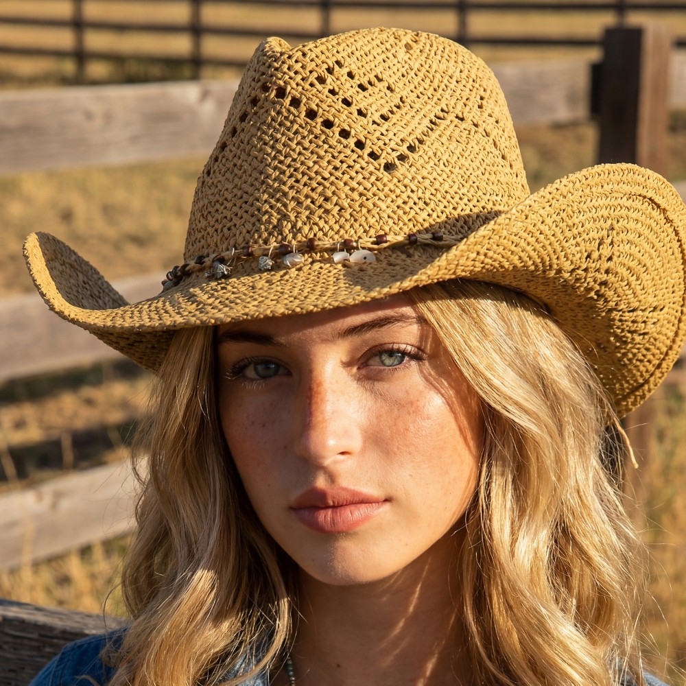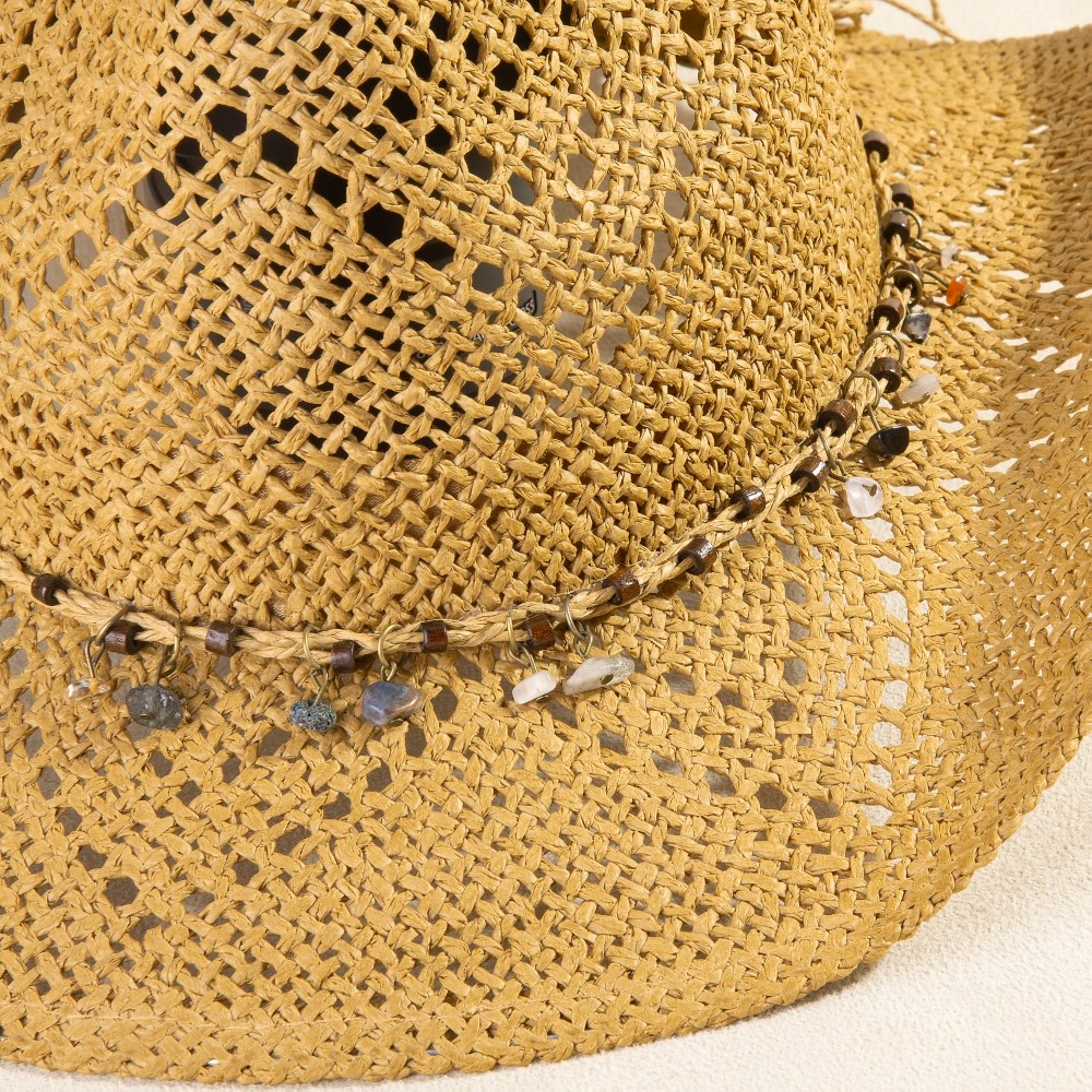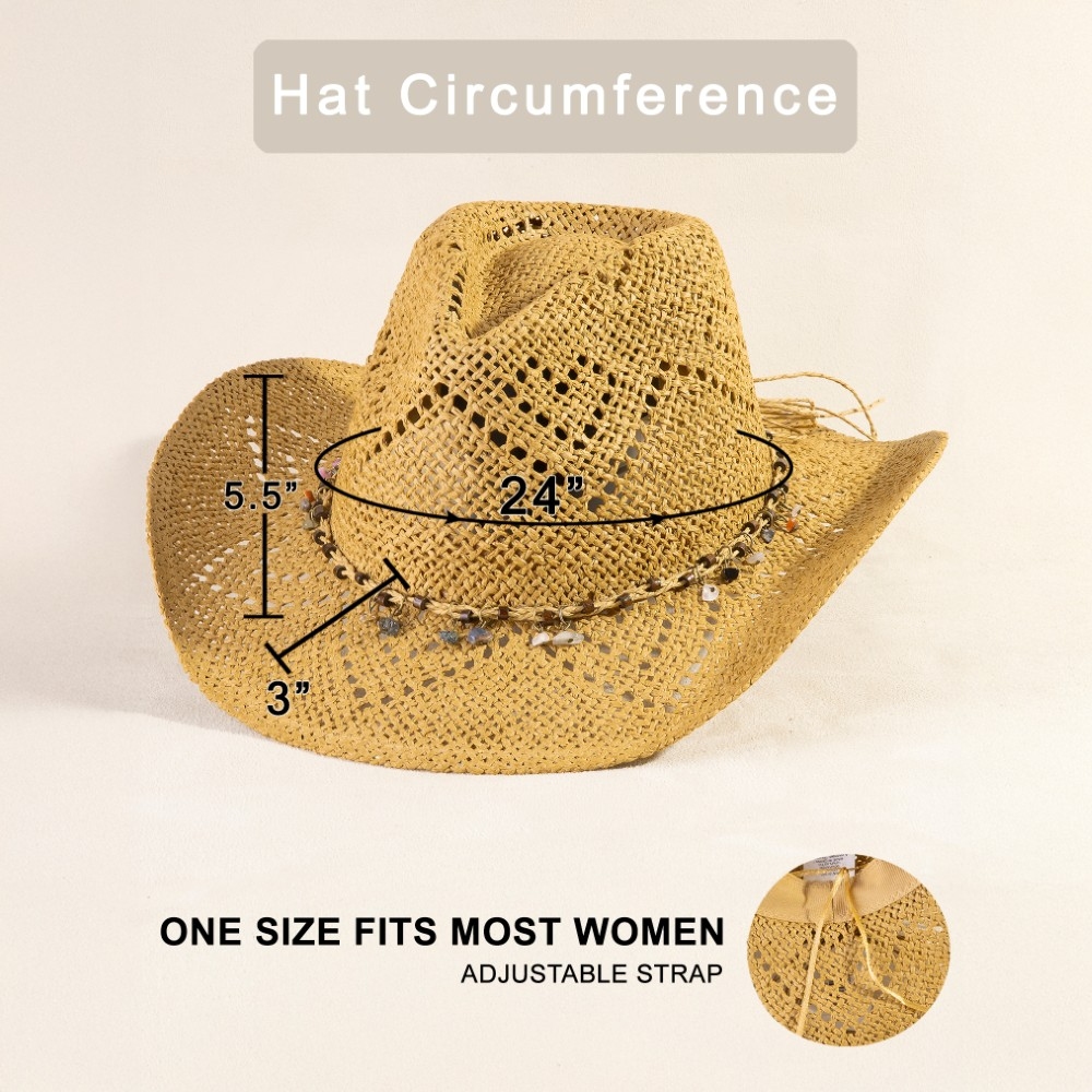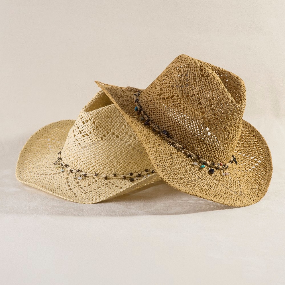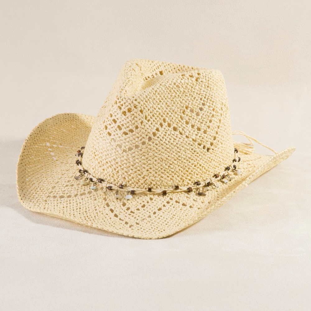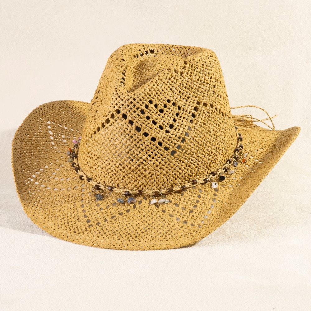 • A classic design with a contemporary twist, this cowboy hat carries a charming beaded strap straw design. Achieve a perfect balance of style and sophistication with this versatile cowboy hat, the ultimate choice for the fashion-savvy individual. Available in IV, KA. This item is sold in packs of 1.