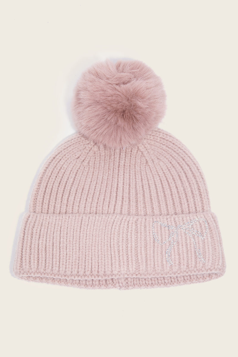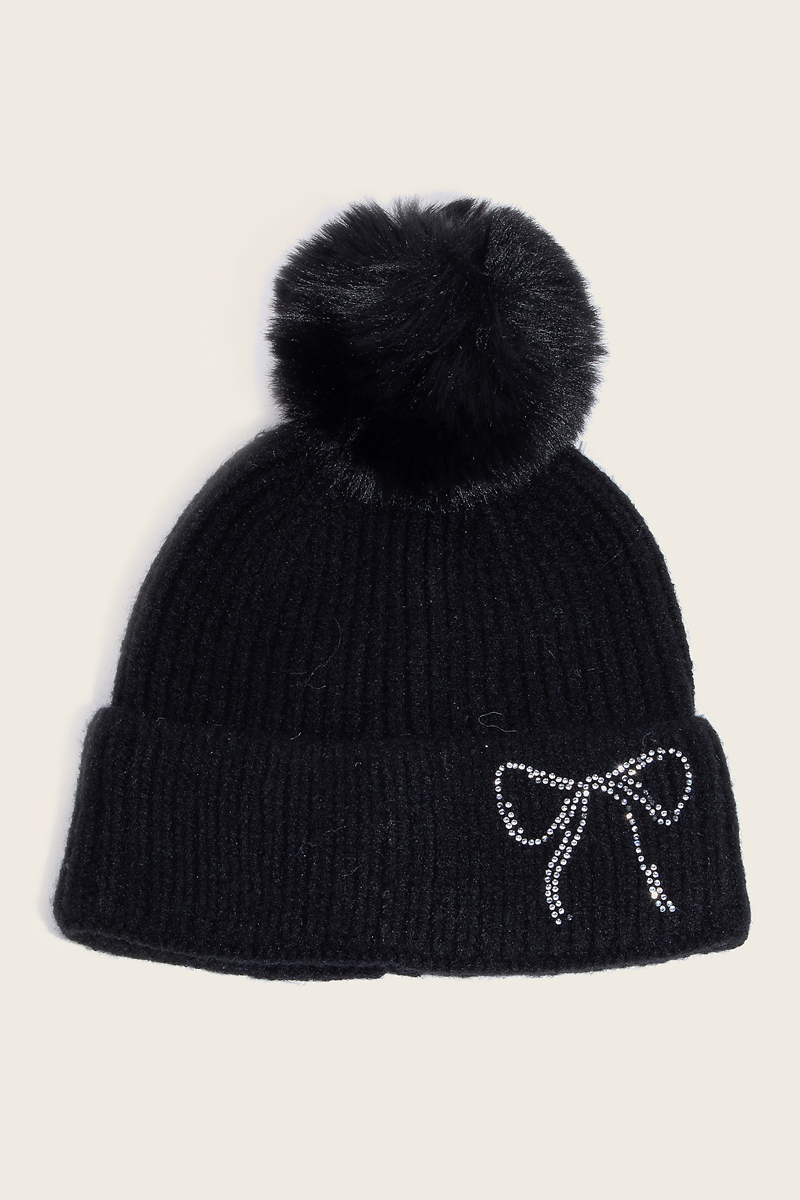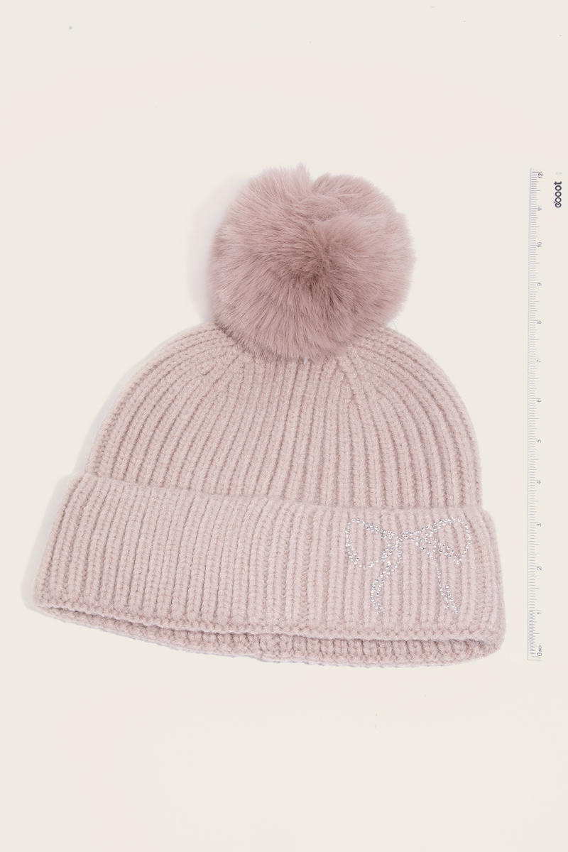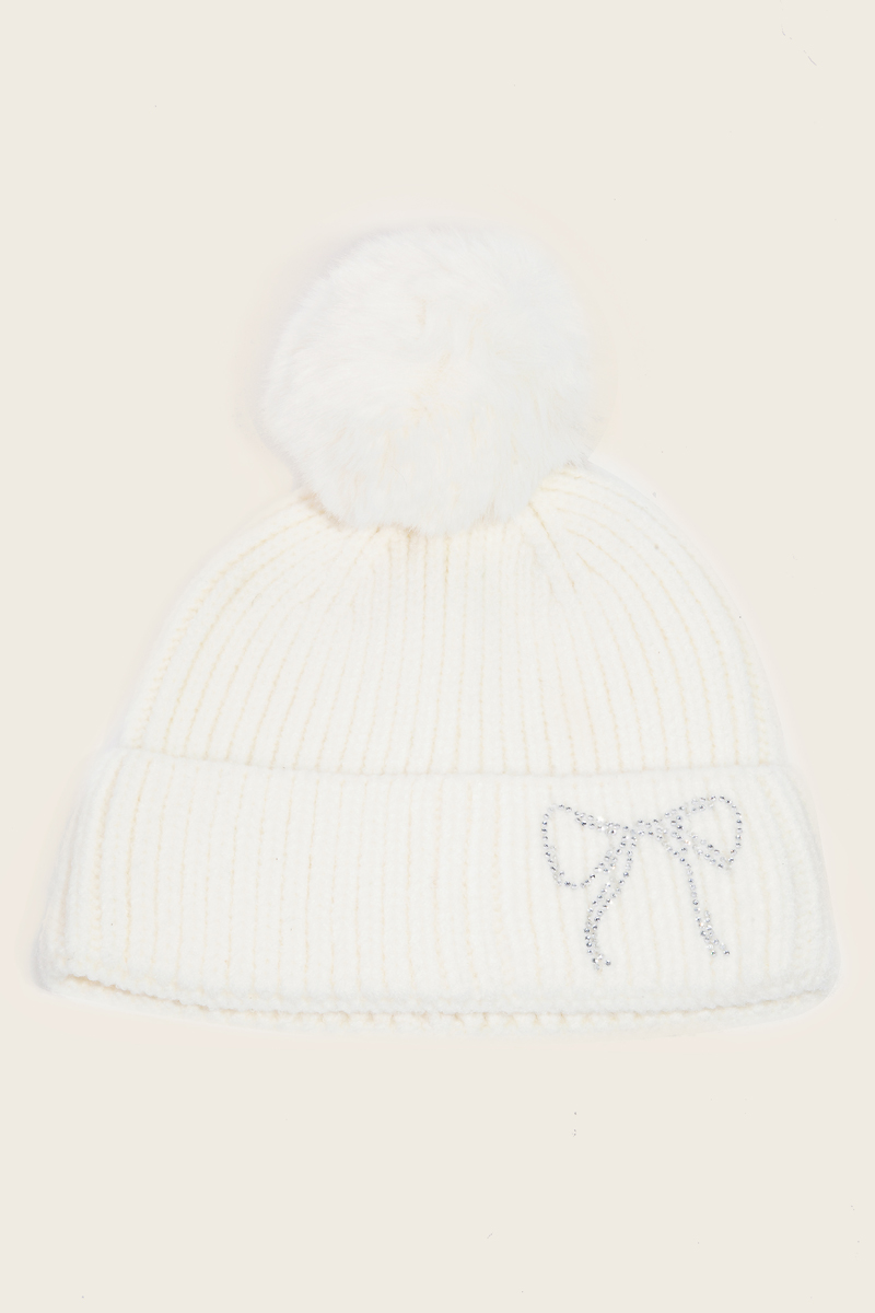 Pearl Beaded Ribbon Bow Charm Knitted Beanie