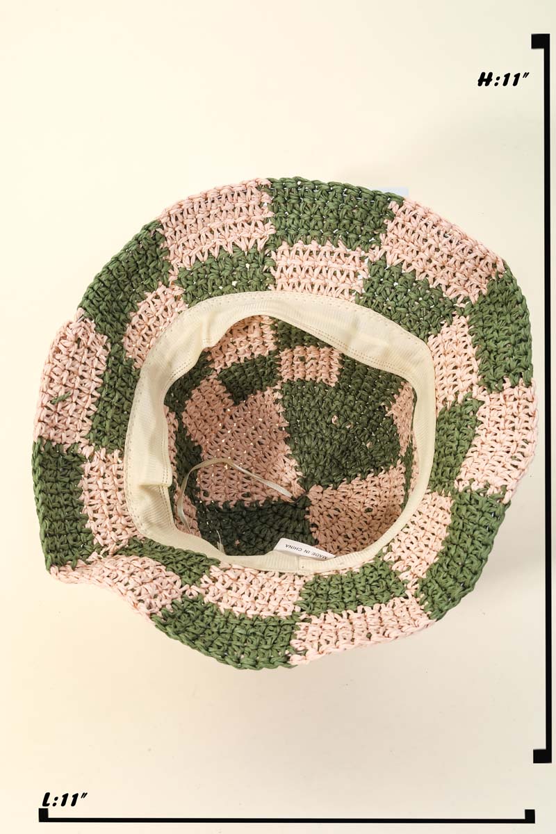 • A true work of art, this bucket hat embodies a sophisticated straw braided checkered design. Elevate your outfit with this stylish bucket hat that's perfect for any occasion. Available in BE, BW, OR, BL, IV, OL, PK and RD. This item is sold in packs of 12.