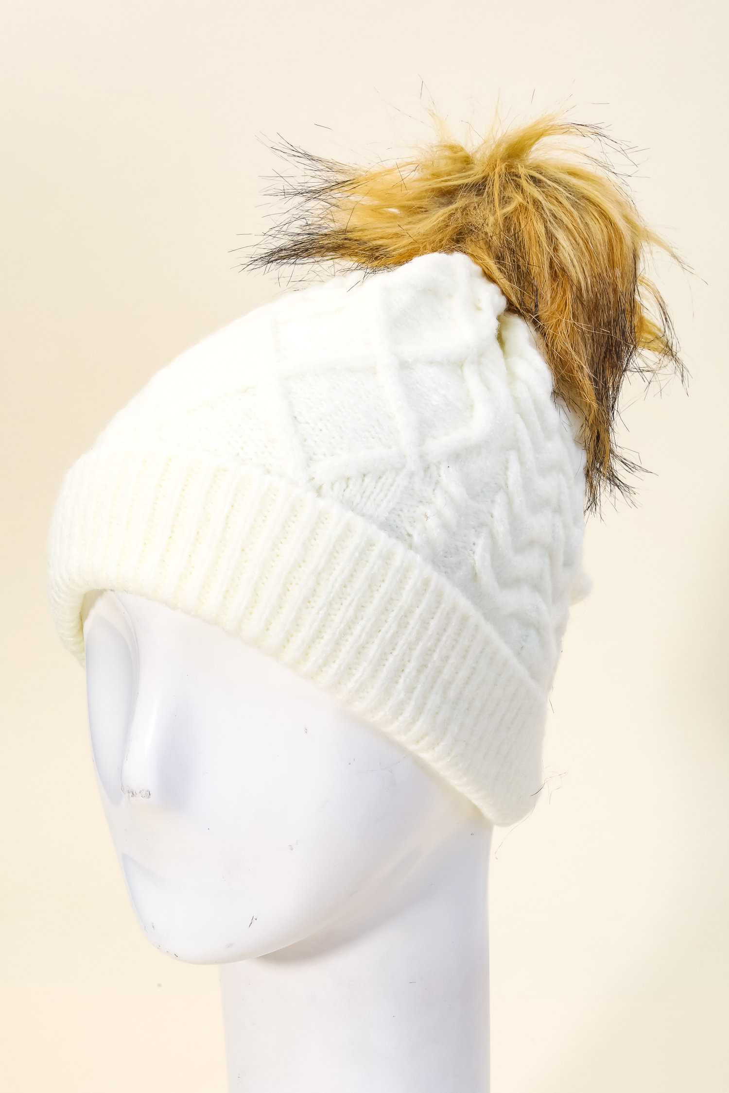 A piece that will never go out of style, this beanie displays a unique cable knit fuzzy pom design. Master the art of accessorizing with this versatile beanie, a key element for achieving a chic and polished look. Available in MV Copy, MV. This item is sold in packs of 1.