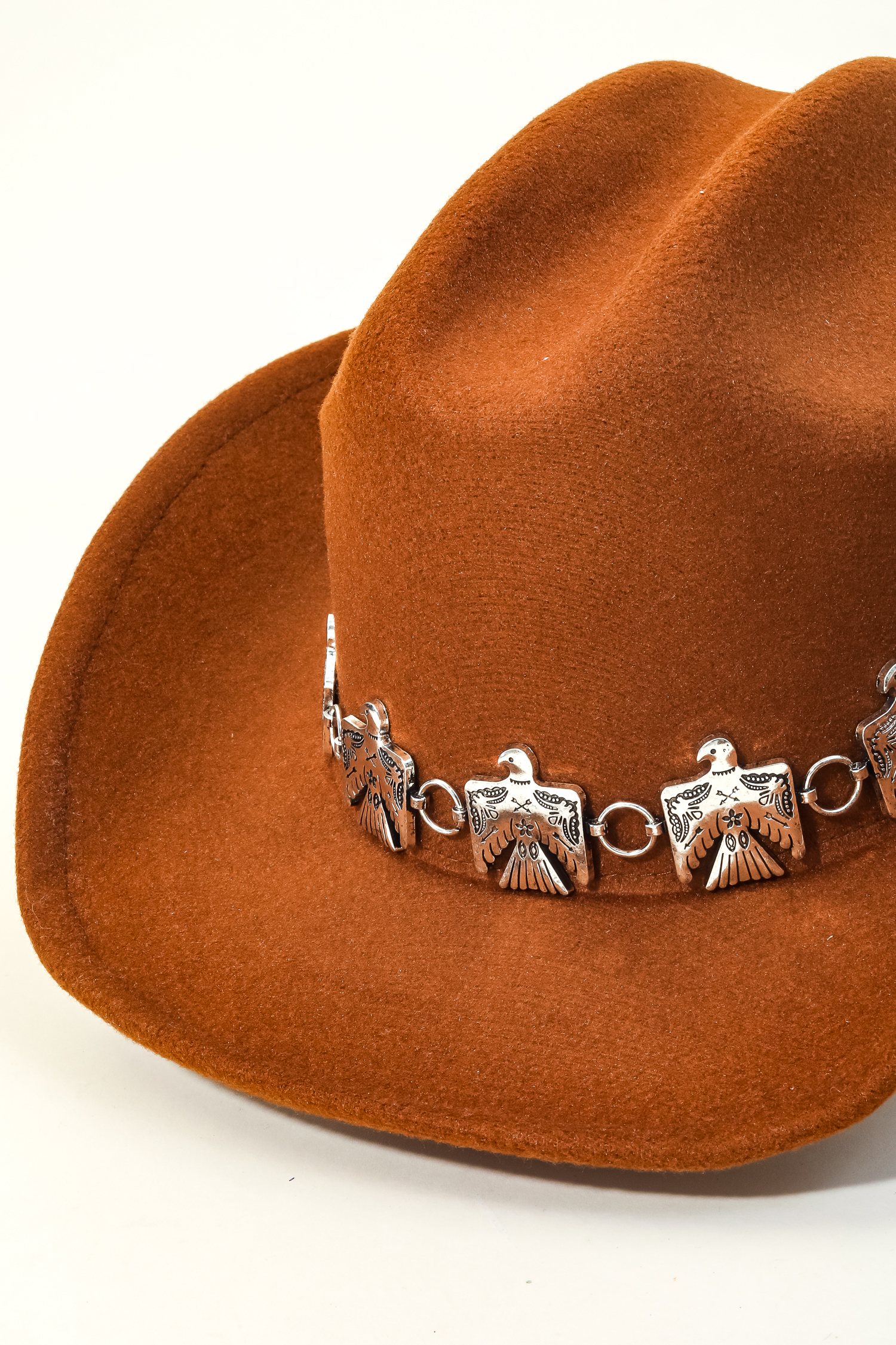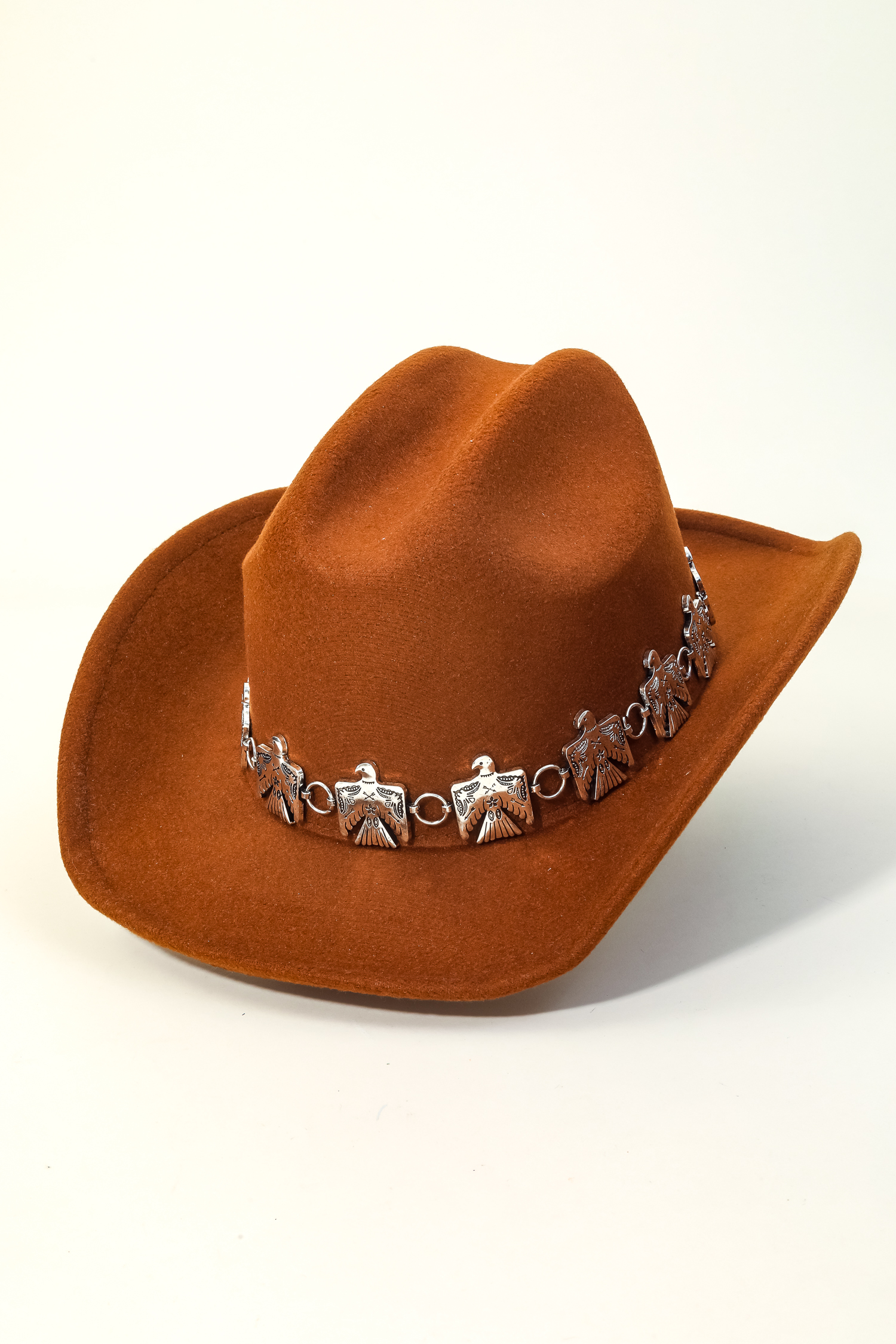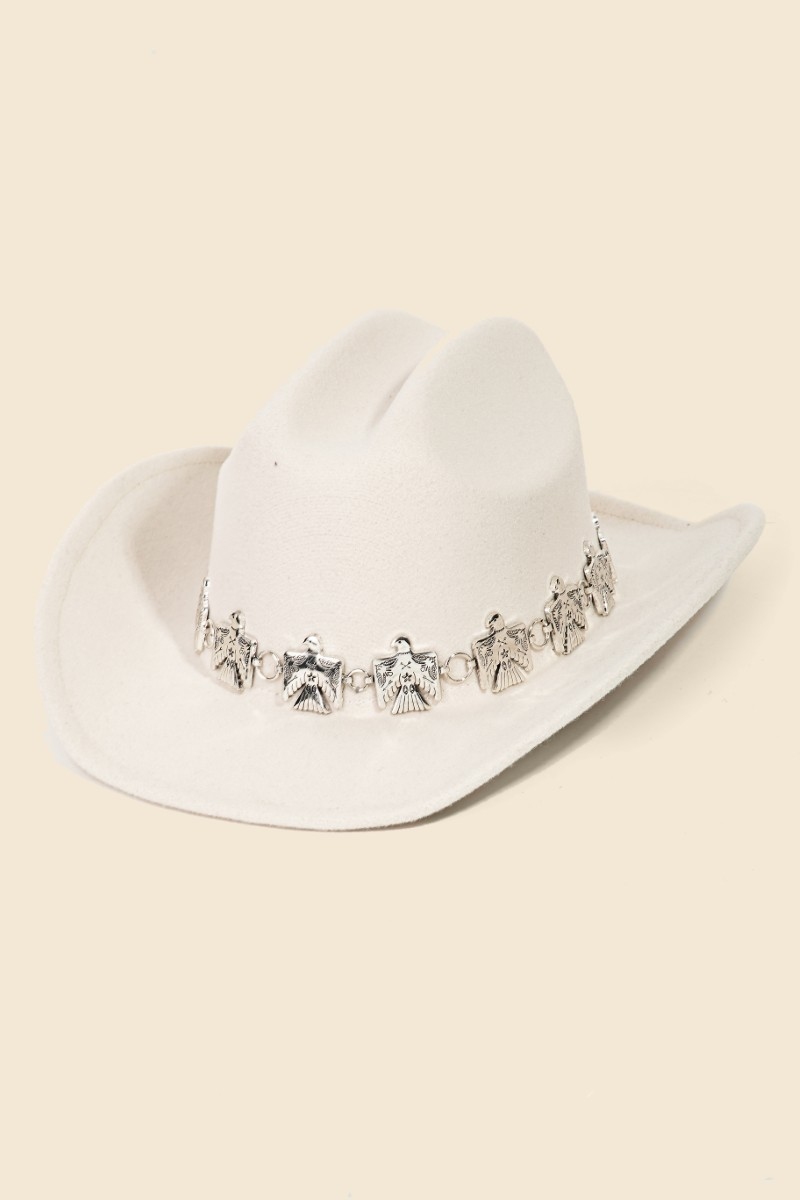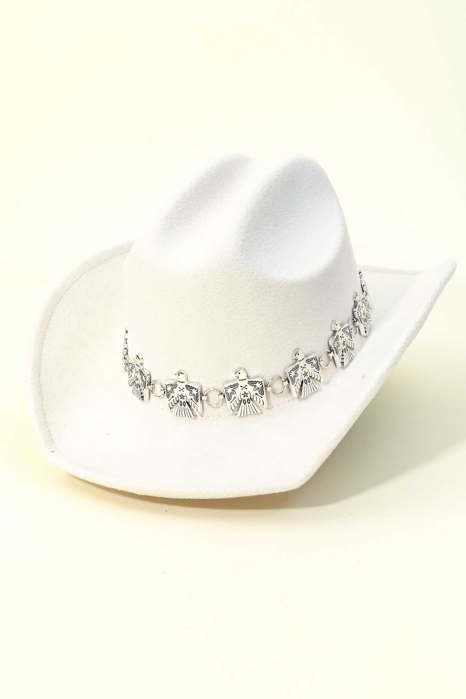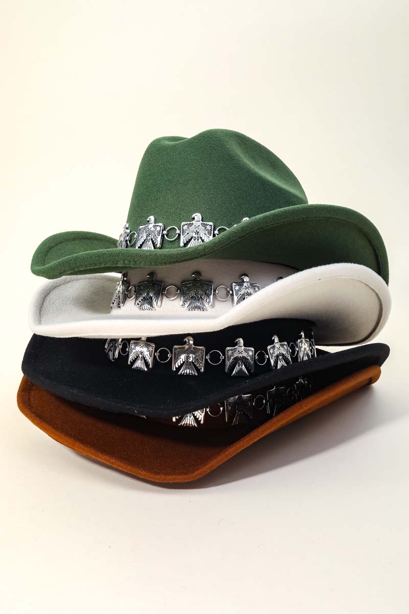 • Bold, daring, and endlessly stylish, this cowboy hat presents a striking eagle chain strap design. Add some personality to your outfit with this stylish cowboy hat. Available in BK, IV, IVX, BR and GN. This item is sold in packs of 1.