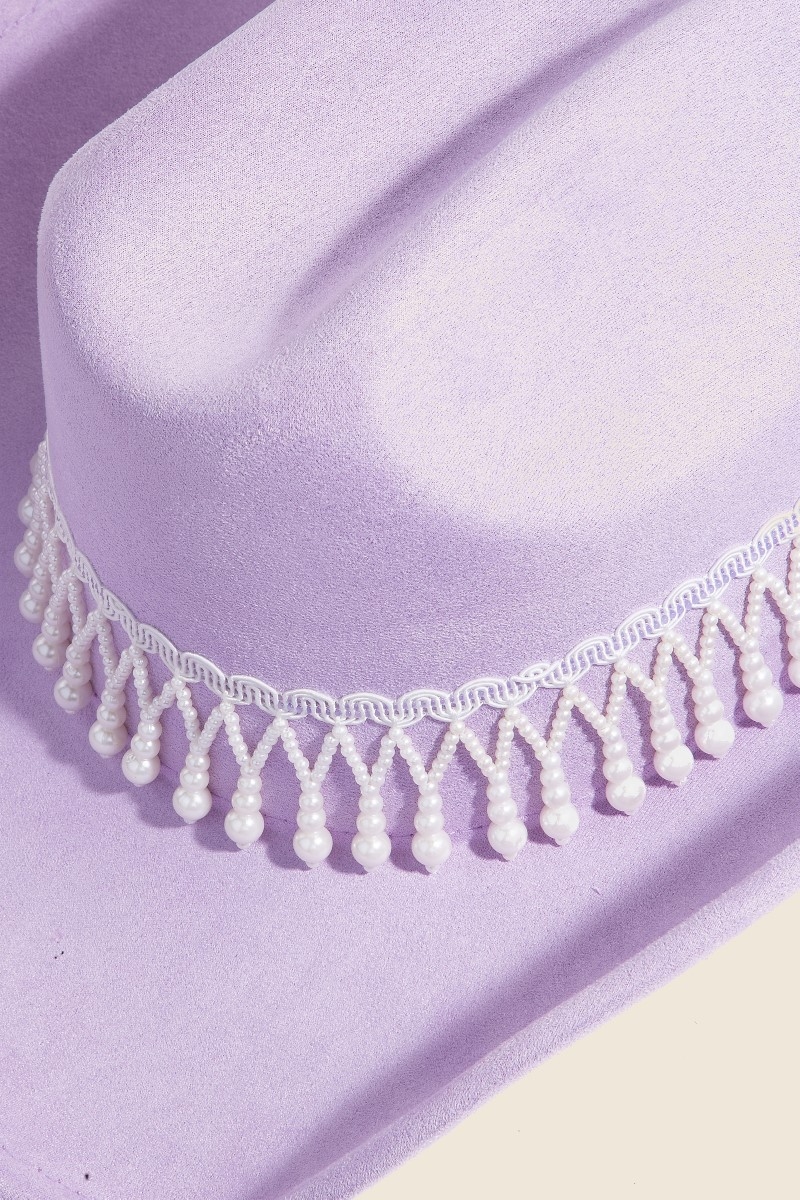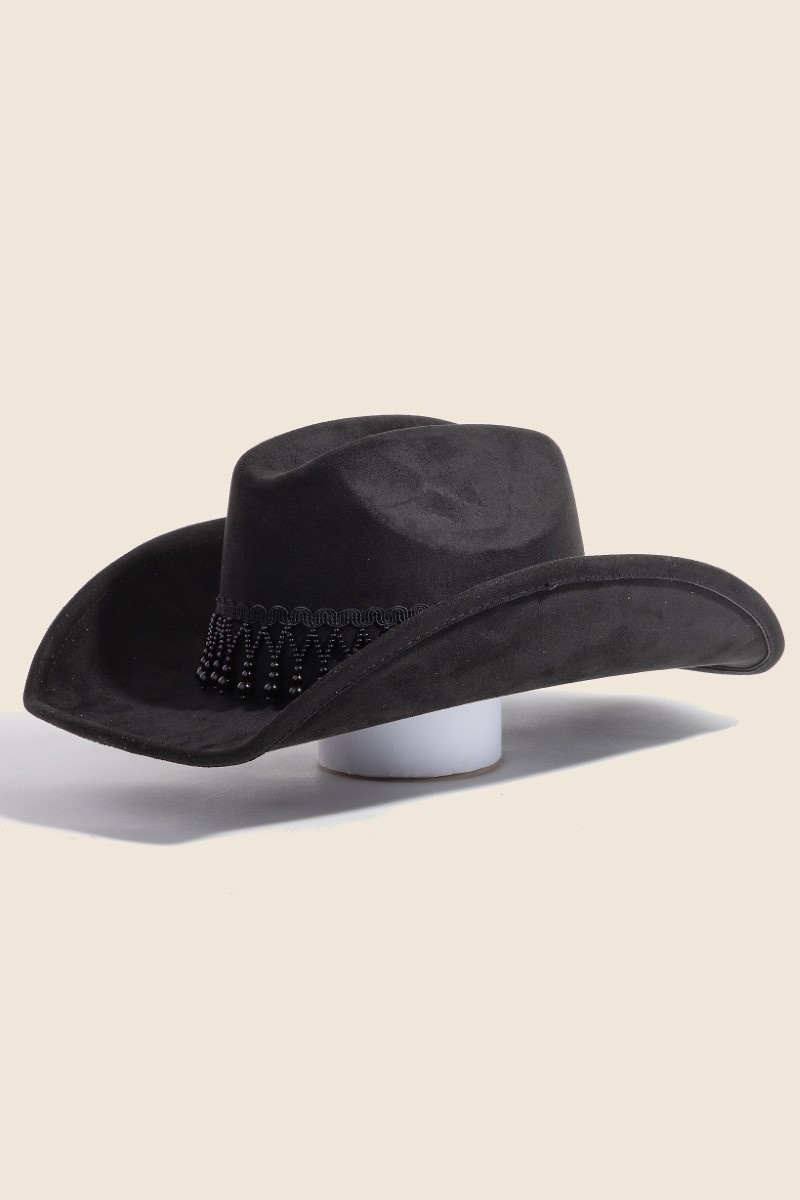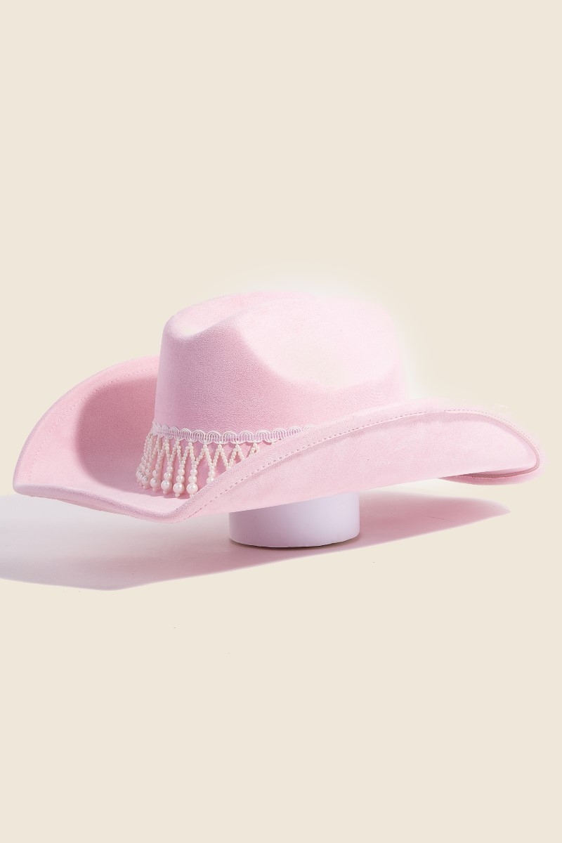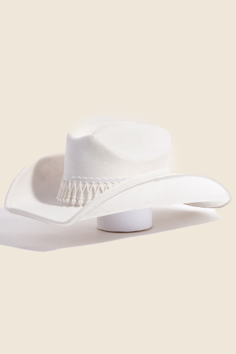 • Add a touch of luxury to any outfit, this cowboy hat offers a remarkable pearl fringe band design. This item is ideal for those who want to add some personality to their outfits without being too bold. Available in BK, IV, PK, PU. This item is sold in packs of 1.