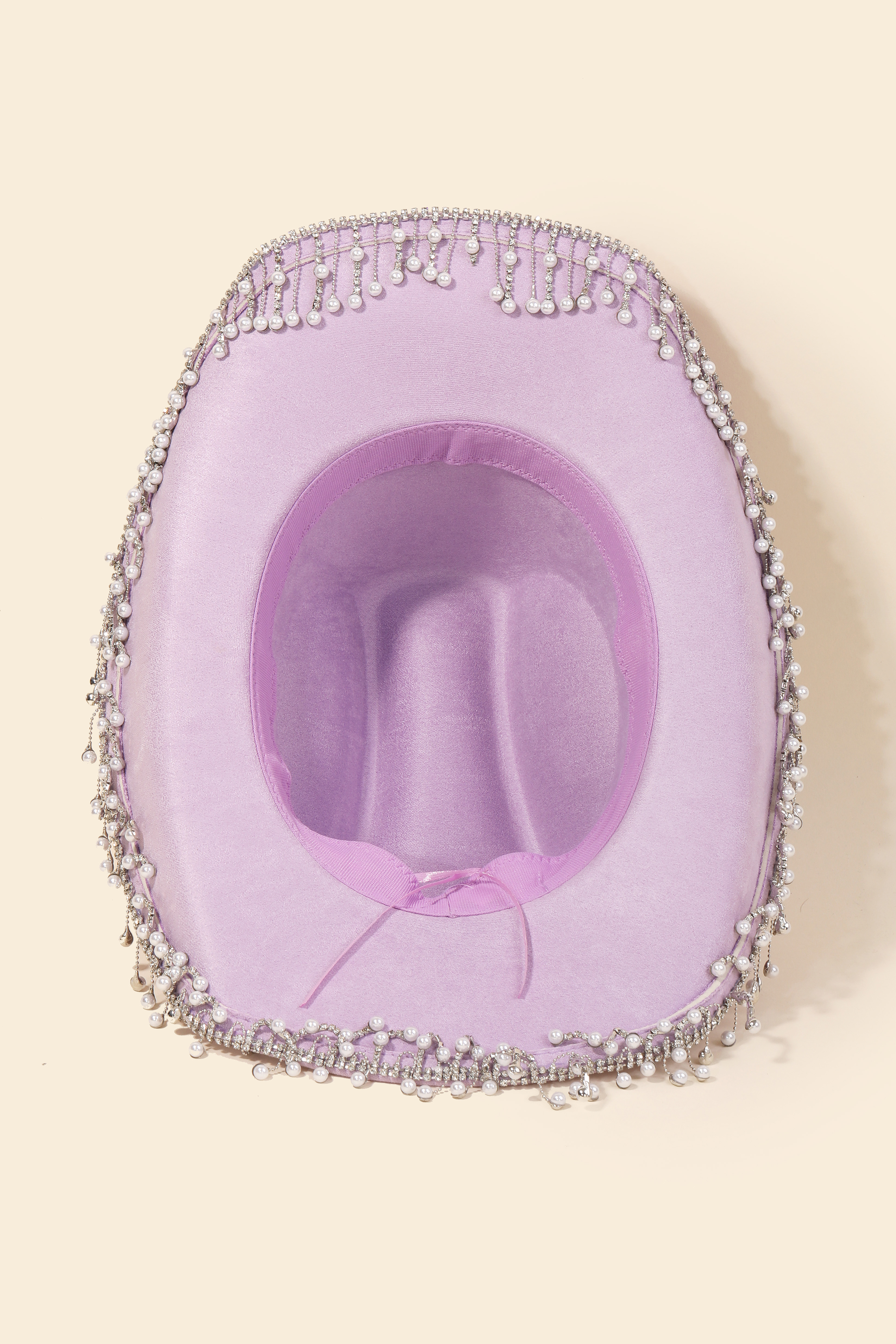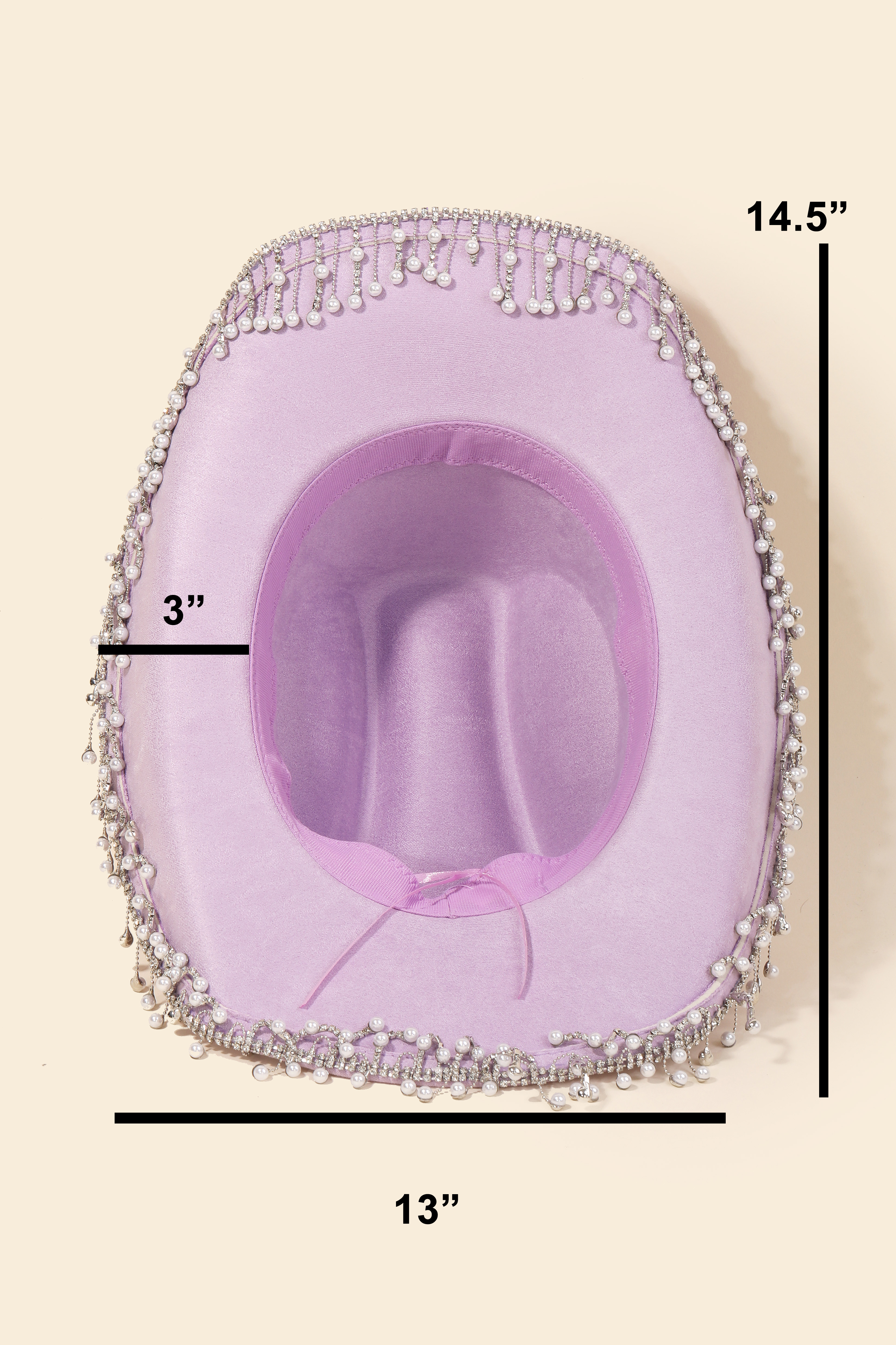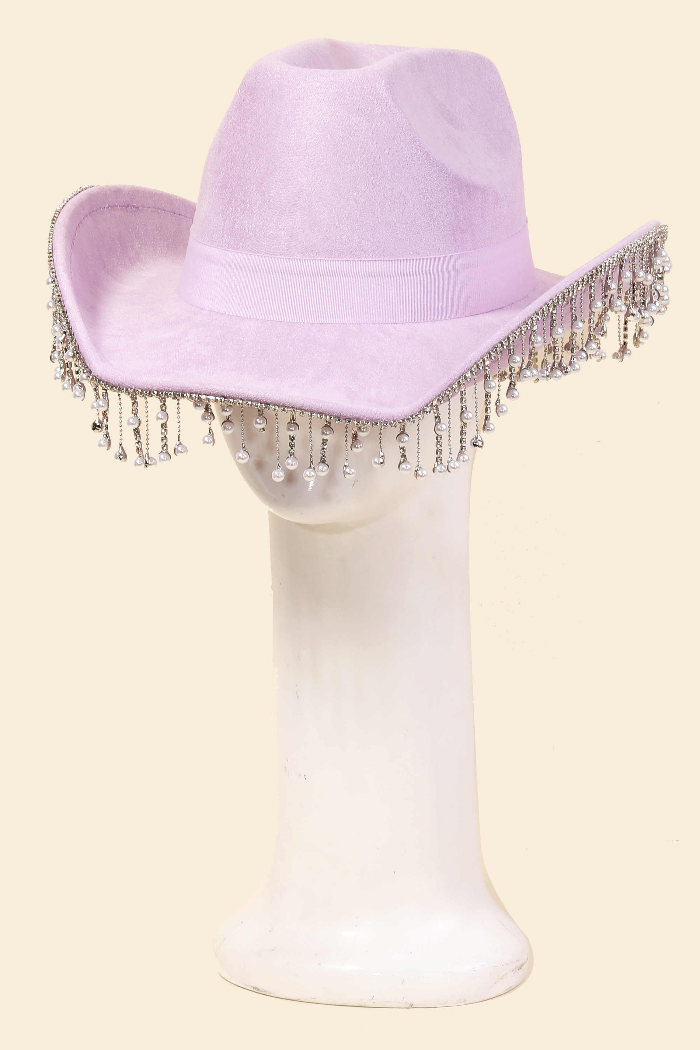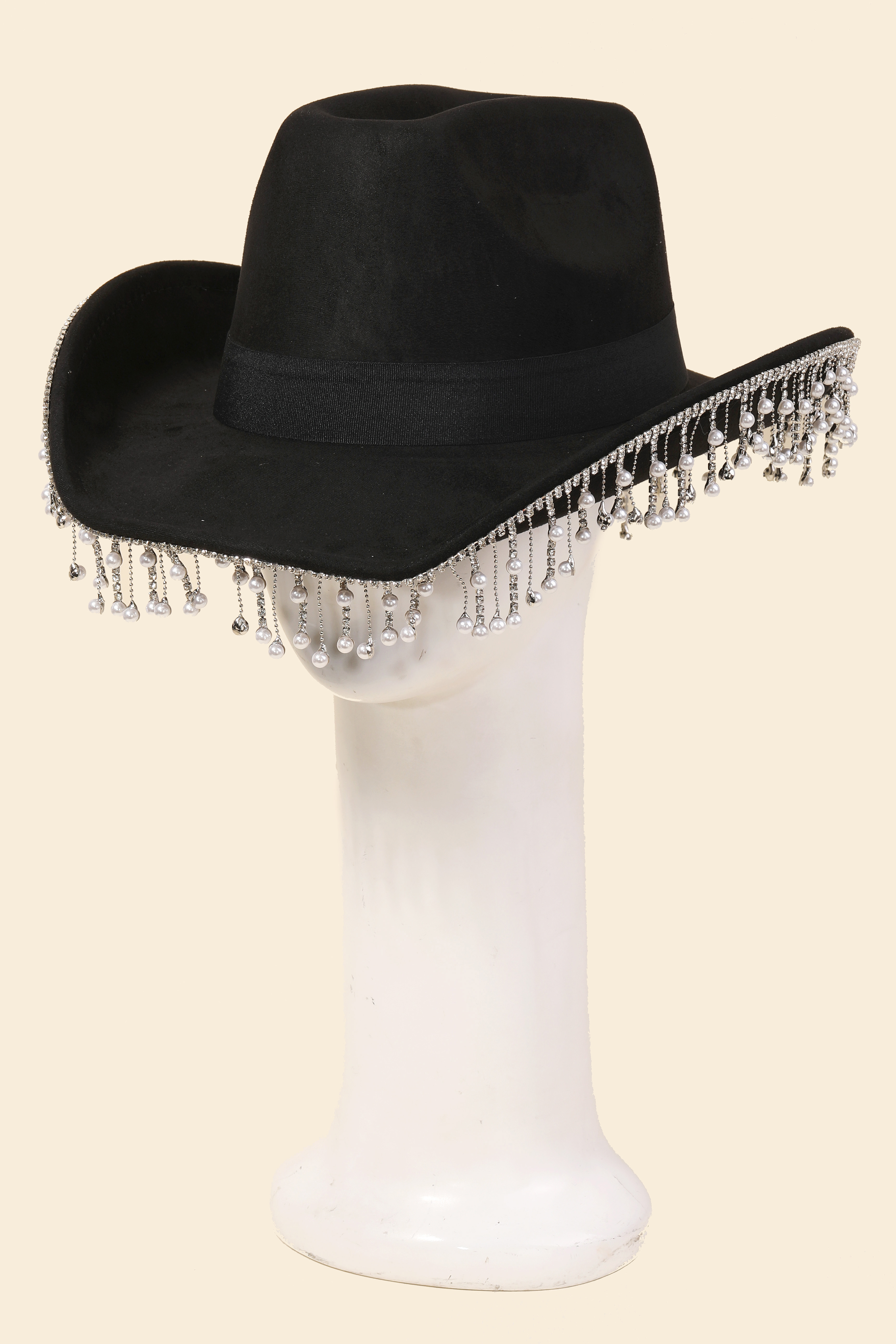 Make a bold statement, this cowboy hat carries a charming pearl rhinestone fringe trim design. This item is ideal for those who want to add some personality to their outfits without being too bold. Available in BK, IV, LPK, NPK, PU, IVFN and LV. This item is sold in packs of 1.