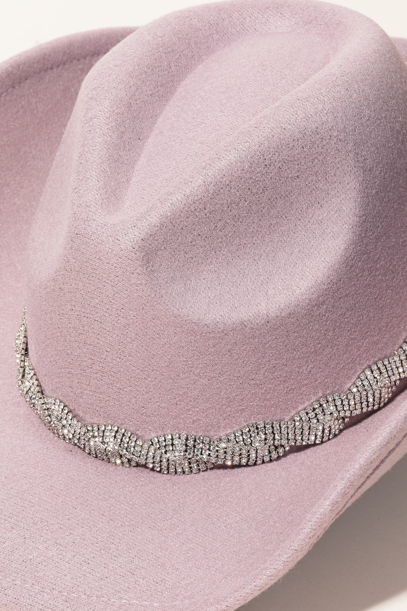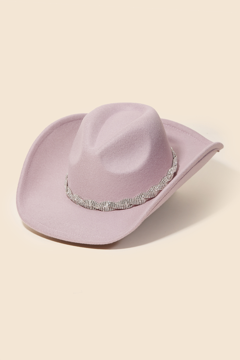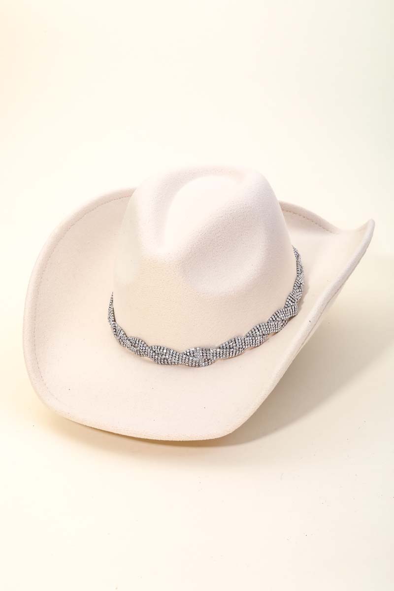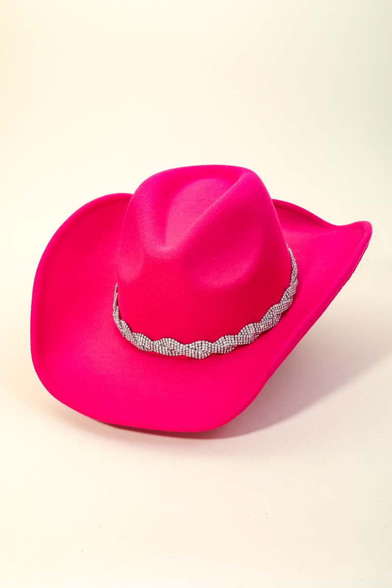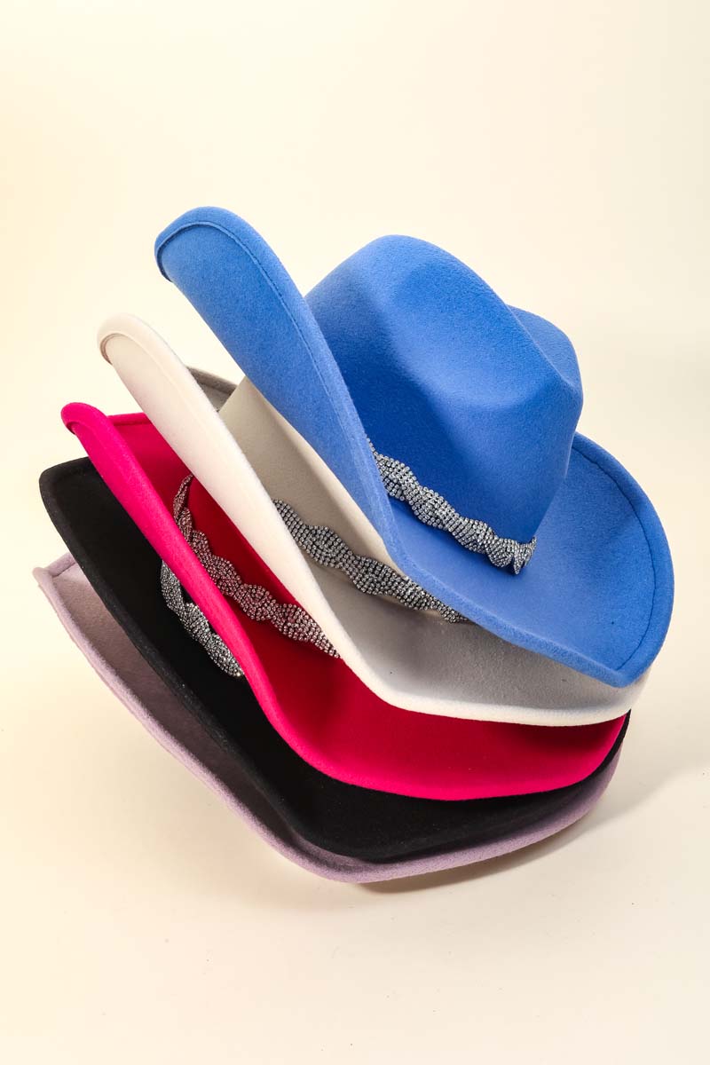 This season's hottest cowboy hat, this cowboy hat introduces an exceptional rhinestone chain strap design. This cowboy hat is an effortless way to add some personality to your outfit. Available in BK, IV, LV, BL, FU and NU. This item is sold in packs of 1.