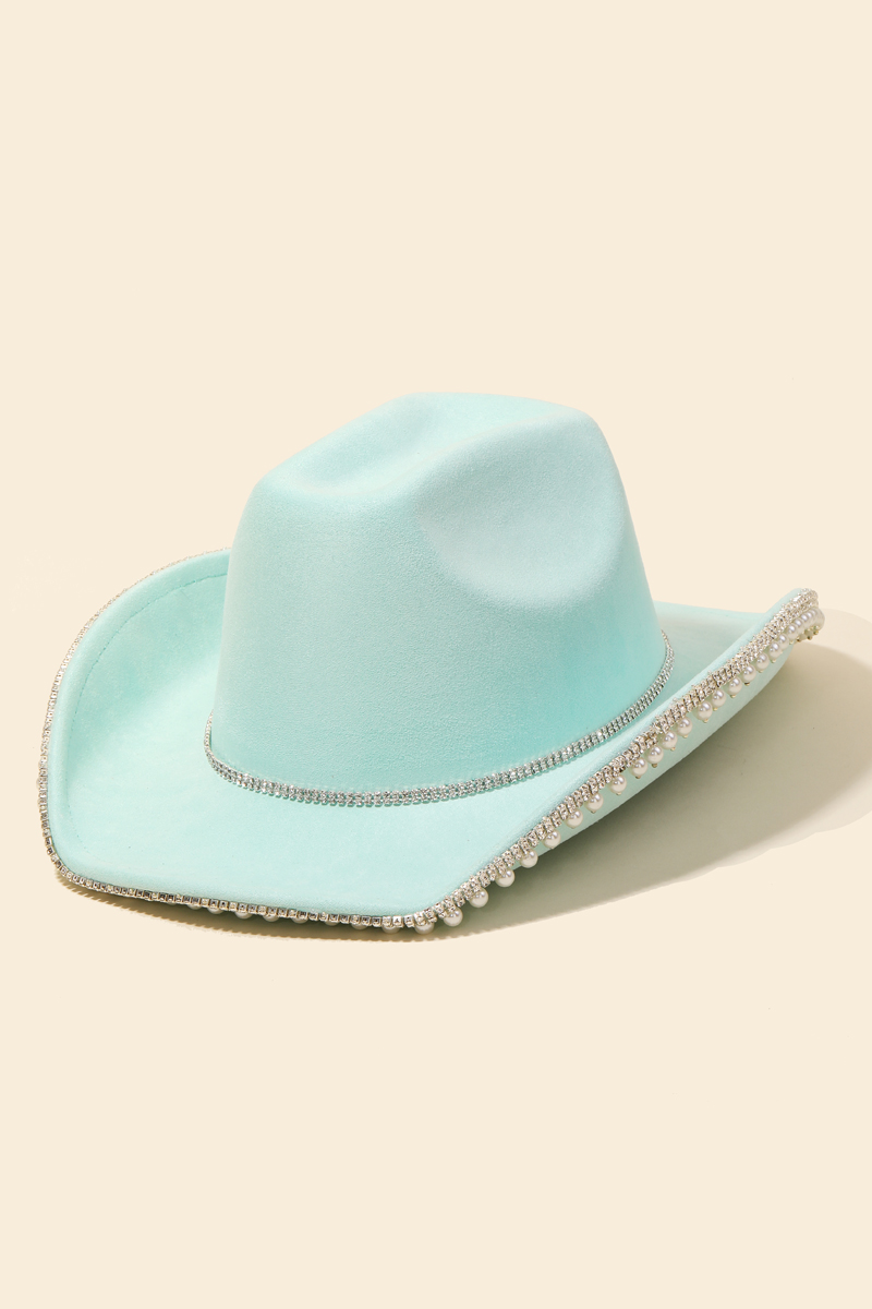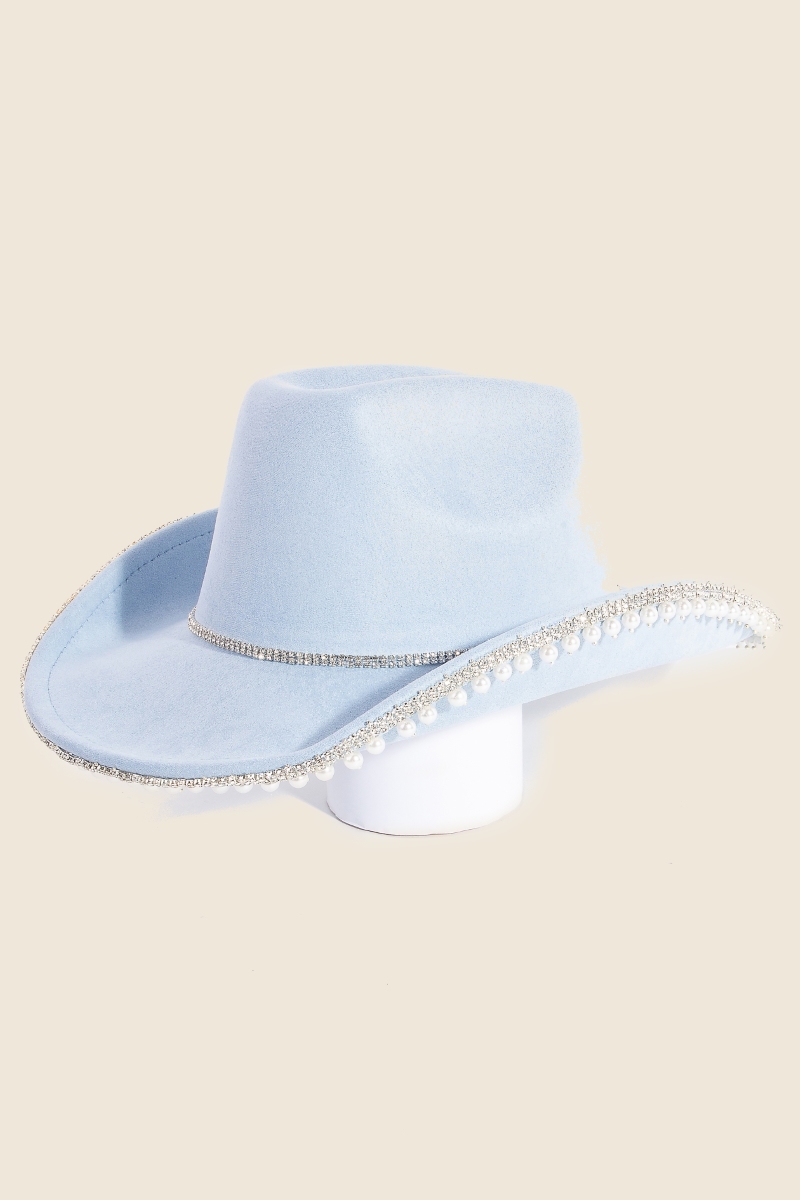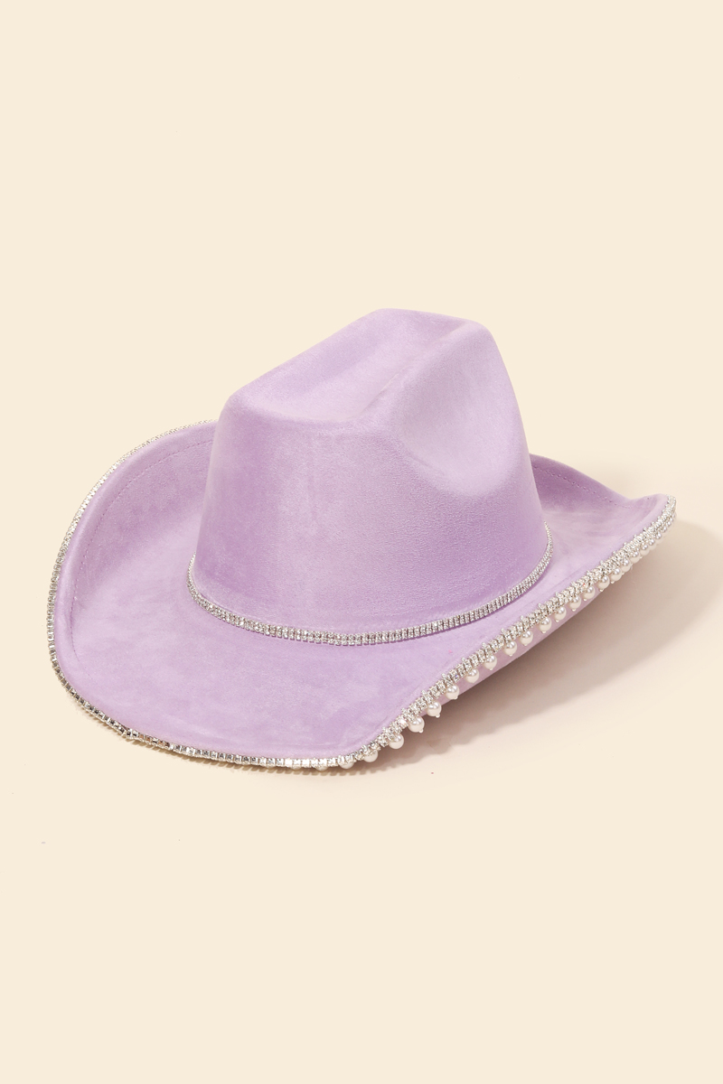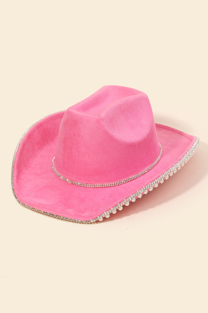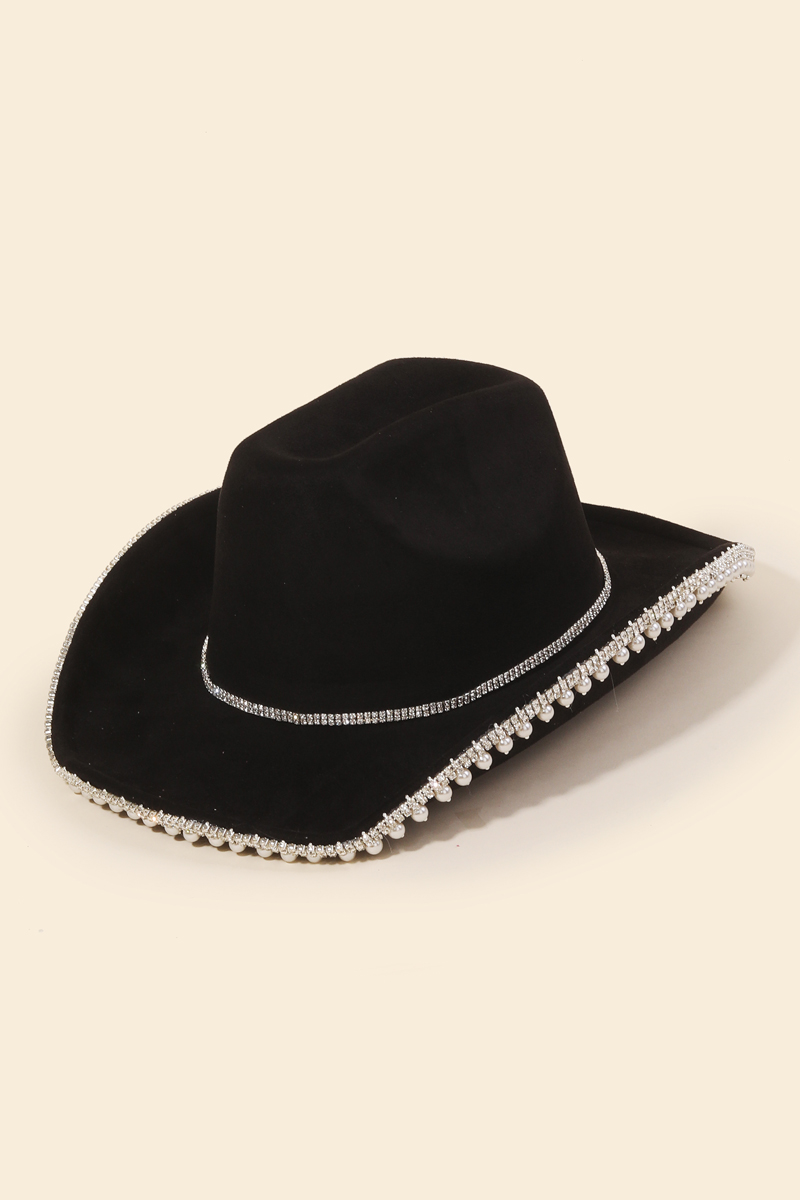 - A must-have for any fashion-forward individual, this cowboy hat adds a distinctive rhinestone pearl trim design. Add a touch of glamour to your wardrobe with this versatile cowboy hat, perfect for enhancing the elegance of any look. Available in BL, MI, PU, BK, FU, IV and MA. This item is sold in packs of 1.