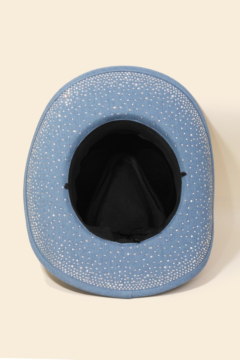 • A modern classic, this cowboy hat introduces an exceptional rhinestone studded denim design. This cowboy hat is a great way to add some flair to your outfit without going over the top. Available in DN, LDN and BK. This item is sold in packs of 12.