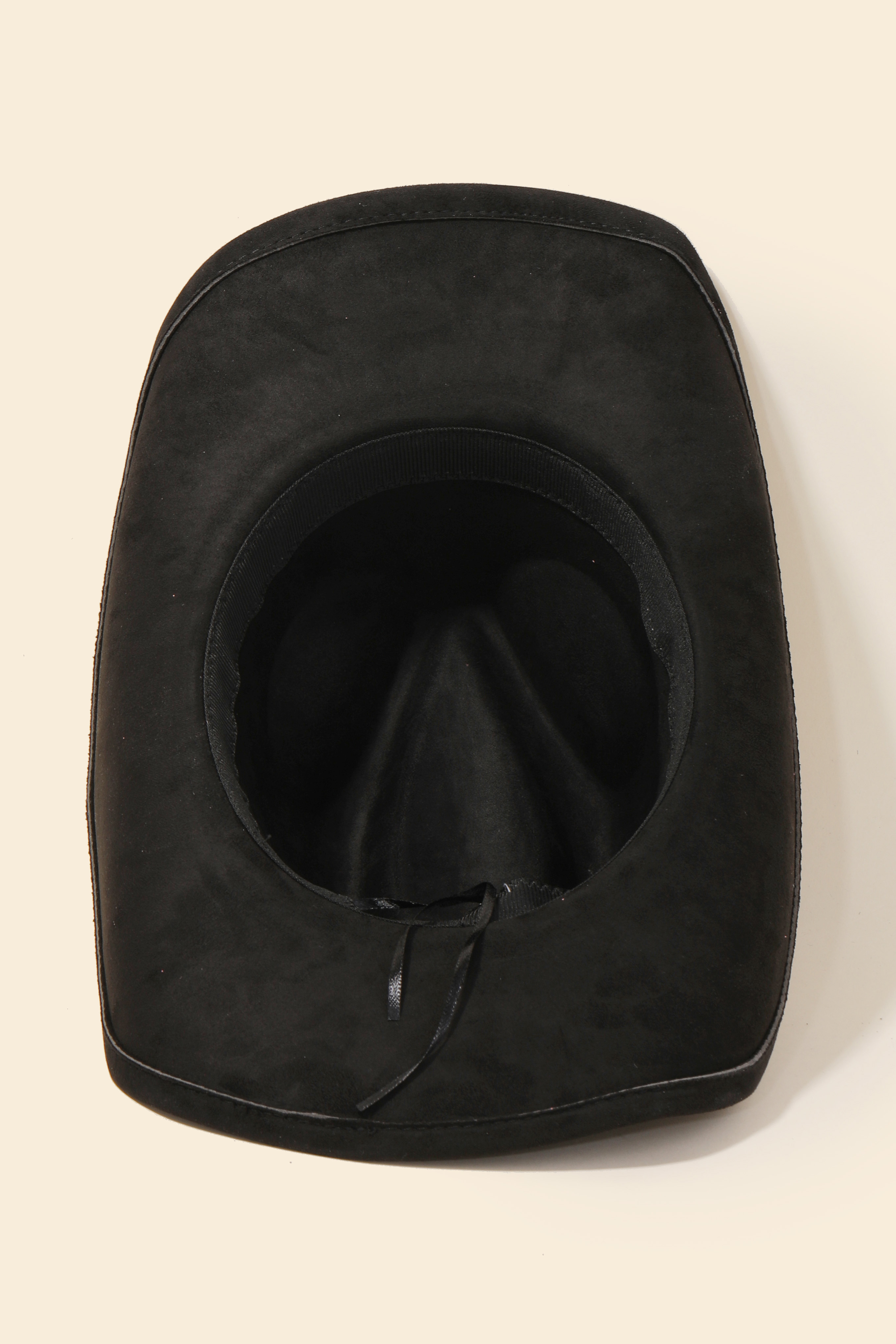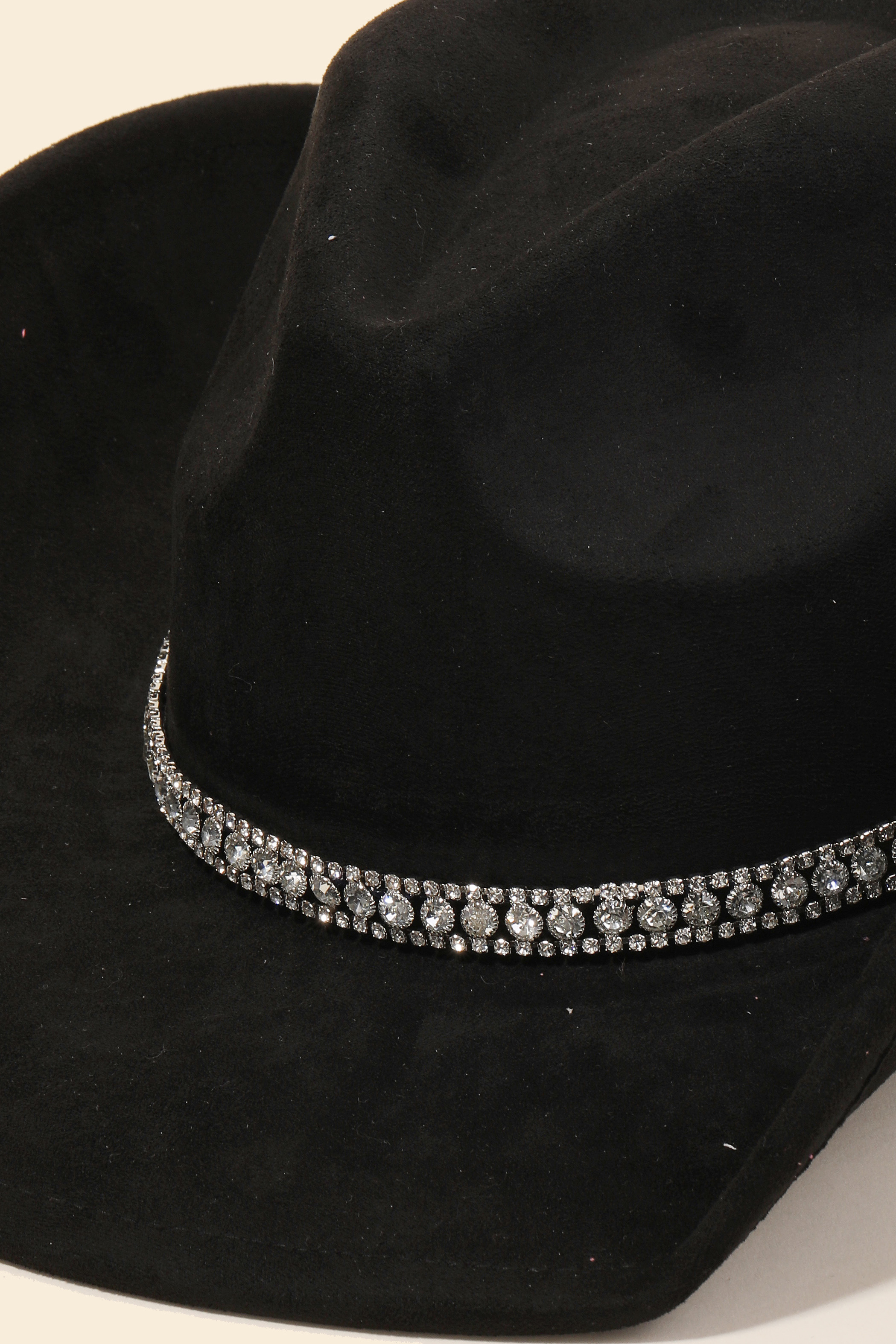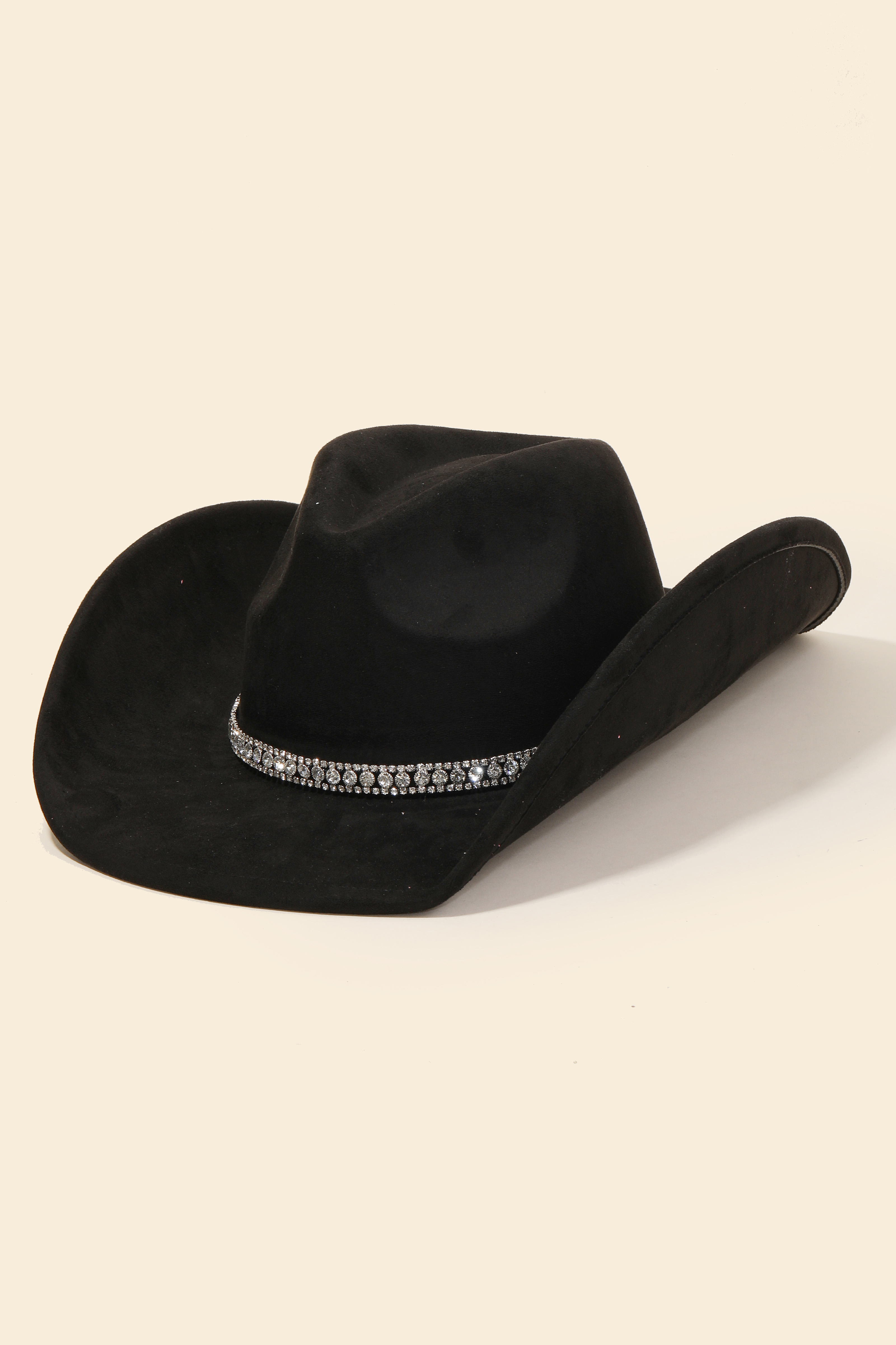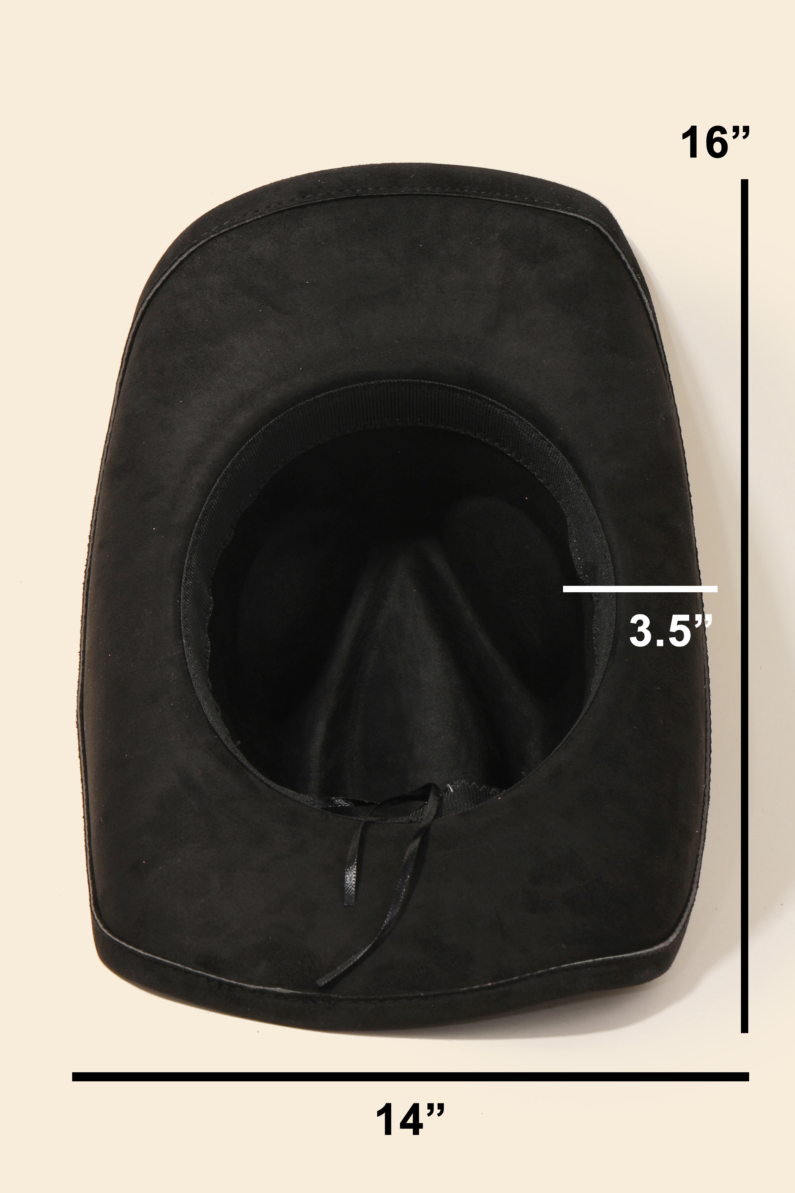 • Elevate any look, this cowboy hat exudes a refined rhinestone studded strap design. Elevate your style effortlessly with this versatile cowboy hat, enhancing the appeal of any ensemble. Available in BK, IV. This item is sold in packs of 1.