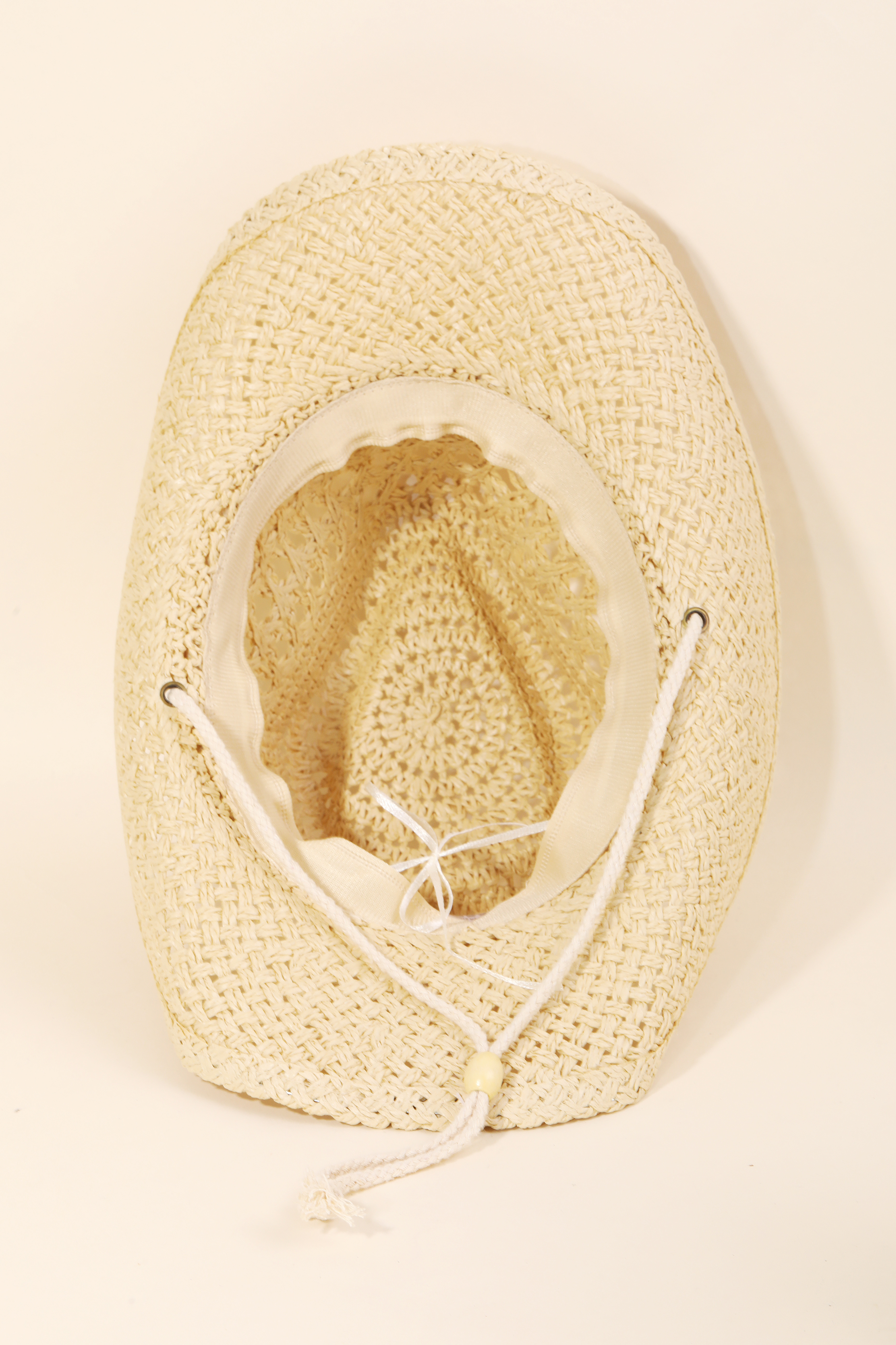 A versatile and stylish addition to any wardrobe, this cowboy hat incorporates a flawless straw braided rope strap design. Perfect for dressing up or down, this versatile cowboy hat adds a touch of sophistication to any look. Available in BE, BK, BR, IV. This item is sold in packs of 1.