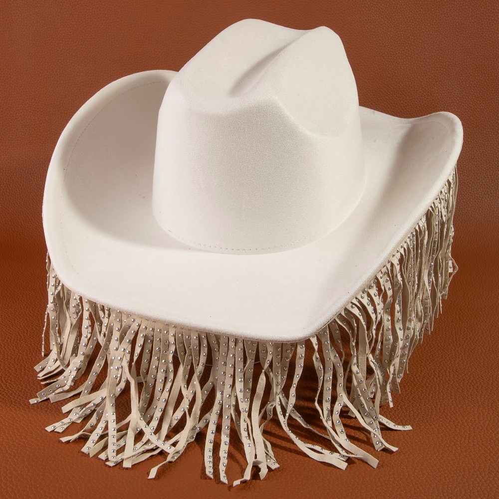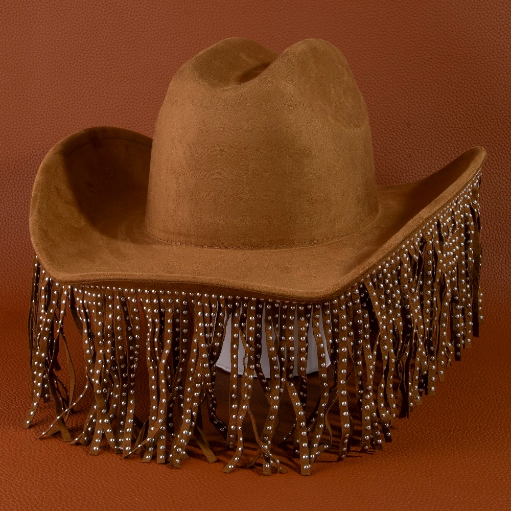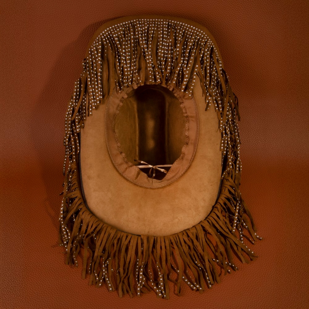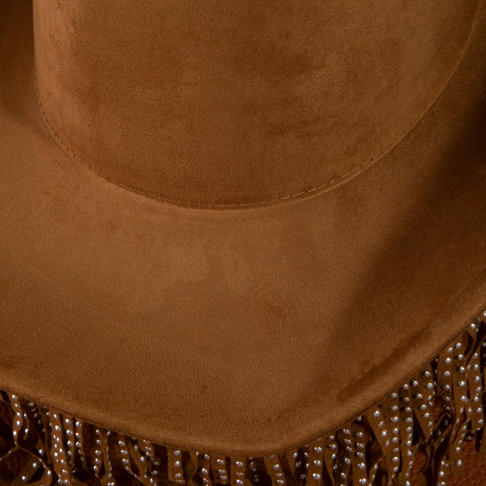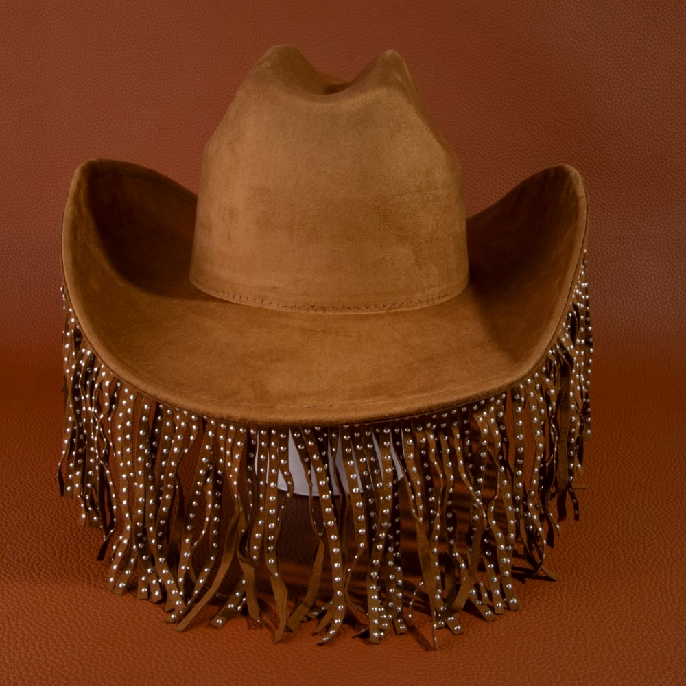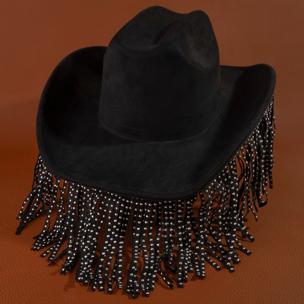 • A modern classic, this cowboy hat offers a remarkable studded fringe trim western design. Perfect for adding some texture and dimension to any outfit, this cowboy hat is a must-have. Available in BK, BR, IV. This item is sold in packs of 1.