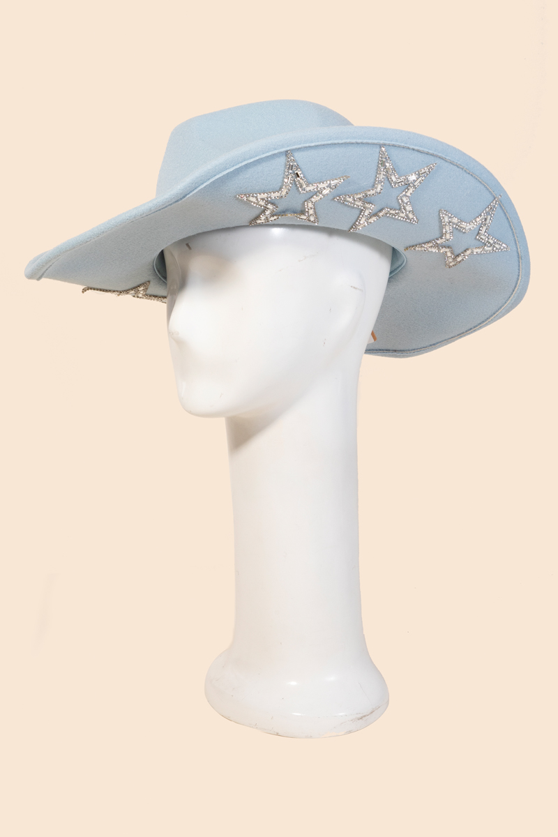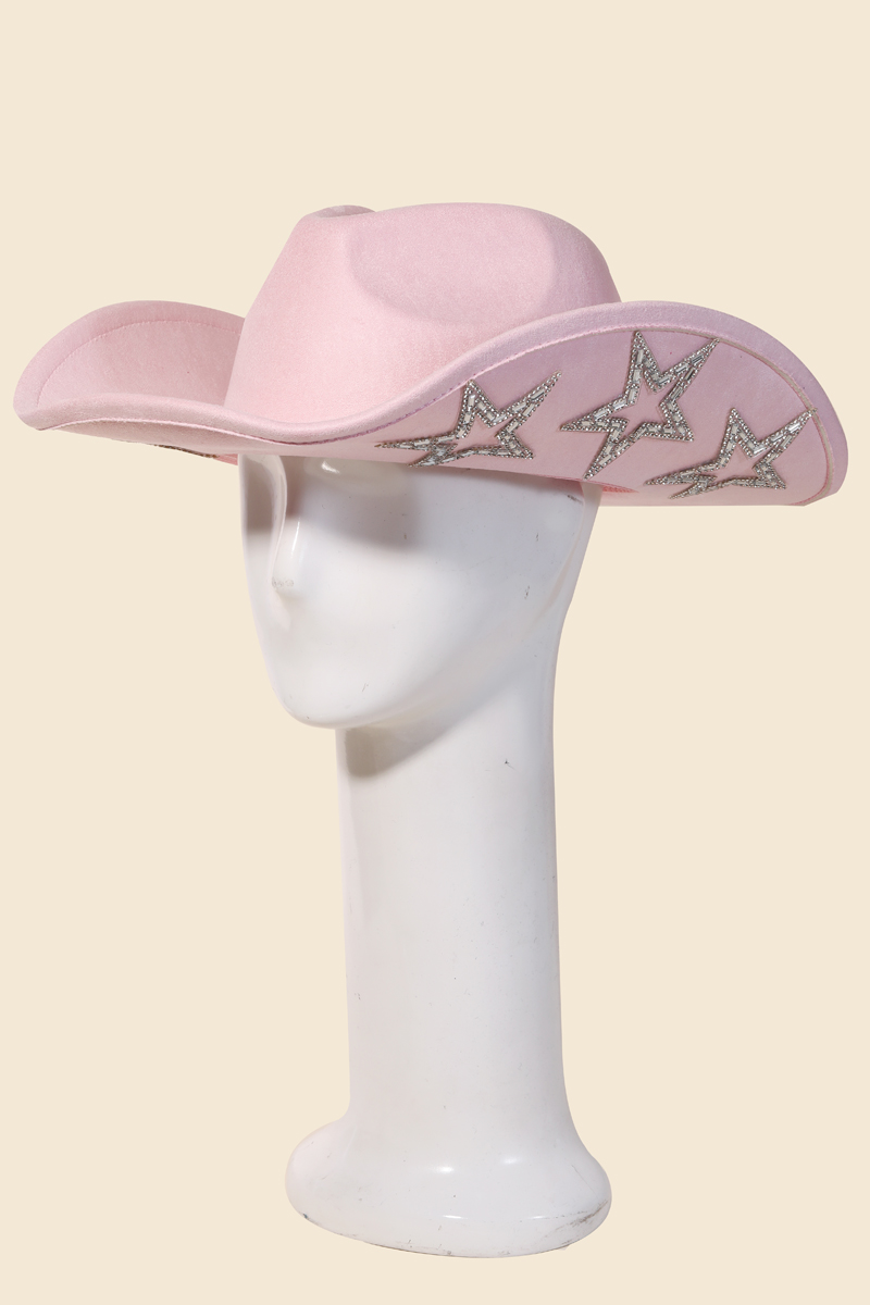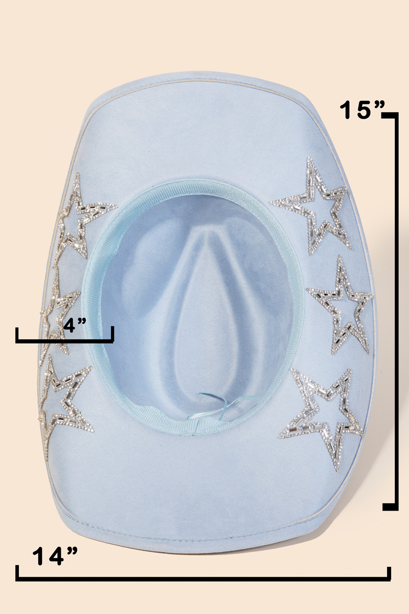 • A contemporary masterpiece, this cowboy hat highlights a special studded rhinestone star design. Discover a new level of fashion versatility as this cowboy hat effortlessly elevates the allure of your attire. Available in BK, BL, FU, IV, PK, PU. This item is sold in packs of 1.