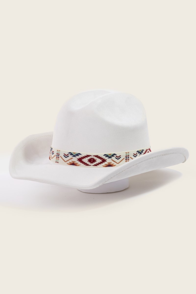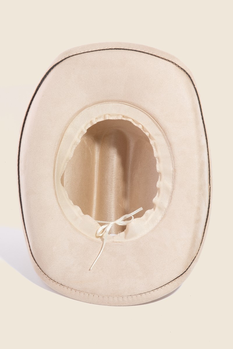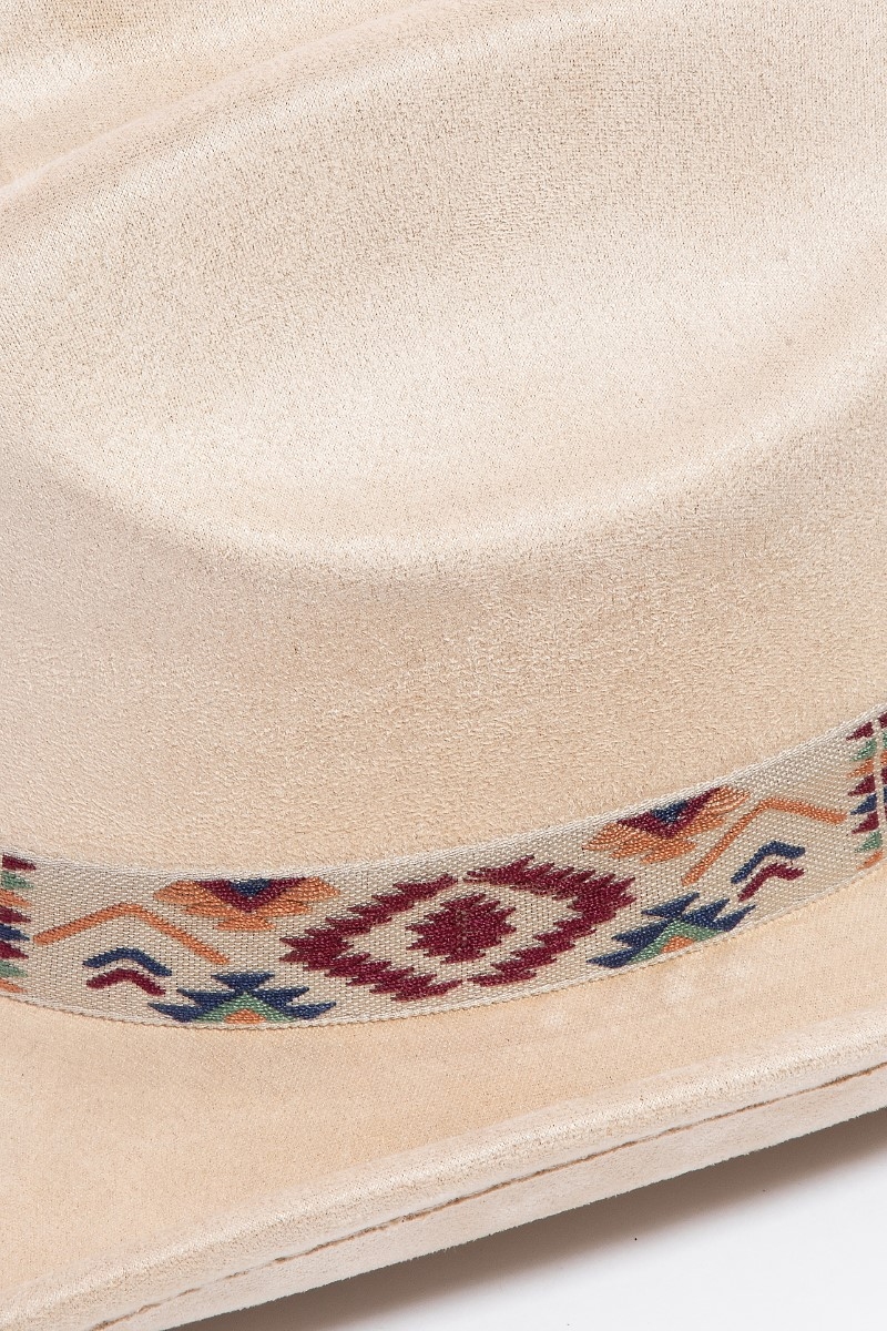 • Sleek and modern, this cowboy hat adds a distinctive boho embroidered strap faux suede design. Embrace fashion flexibility with this versatile cowboy hat, designed to effortlessly enhance the sophistication of any outfit. Available in BK, BR, IV, TP. This item is sold in packs of 1.